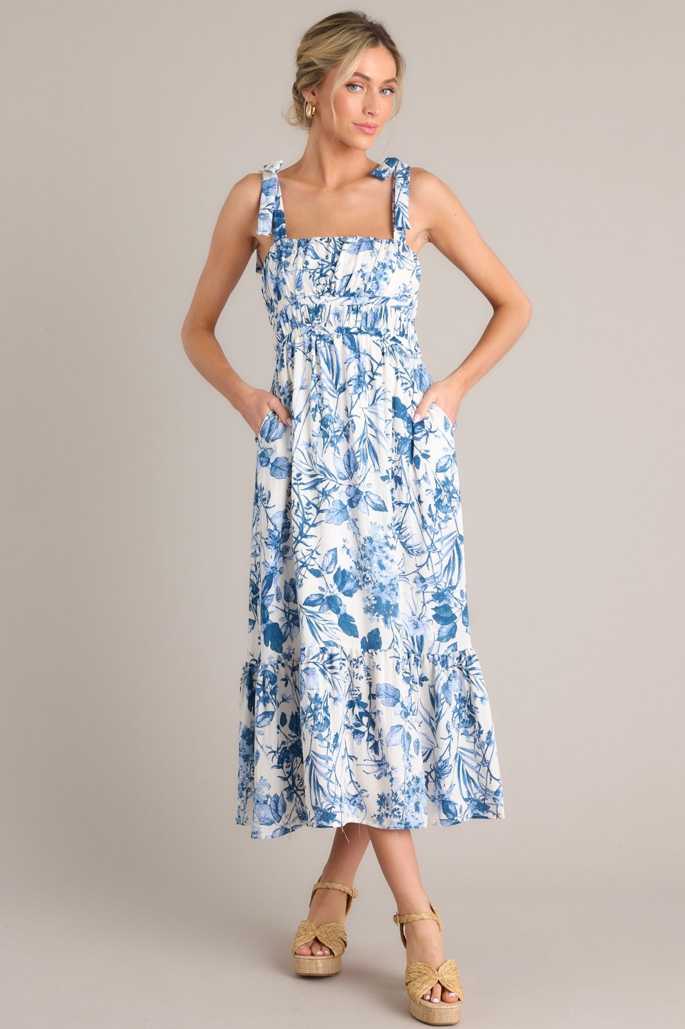 Unleash your inner flower child with our Meadow Muse White & Blue Floral Midi Dress. Perfect for picnics, festivals, and everyday wear, this dress features a stunning floral design in white and blue. With a comfortable fit and lightweight fabric, you'll feel like you're dancing through a meadow all day long. This dress features a square neckline, self-tie shoulder straps, ruching in the bust and waist, a thick elastic waistband, functional hip pockets, and a single tier.