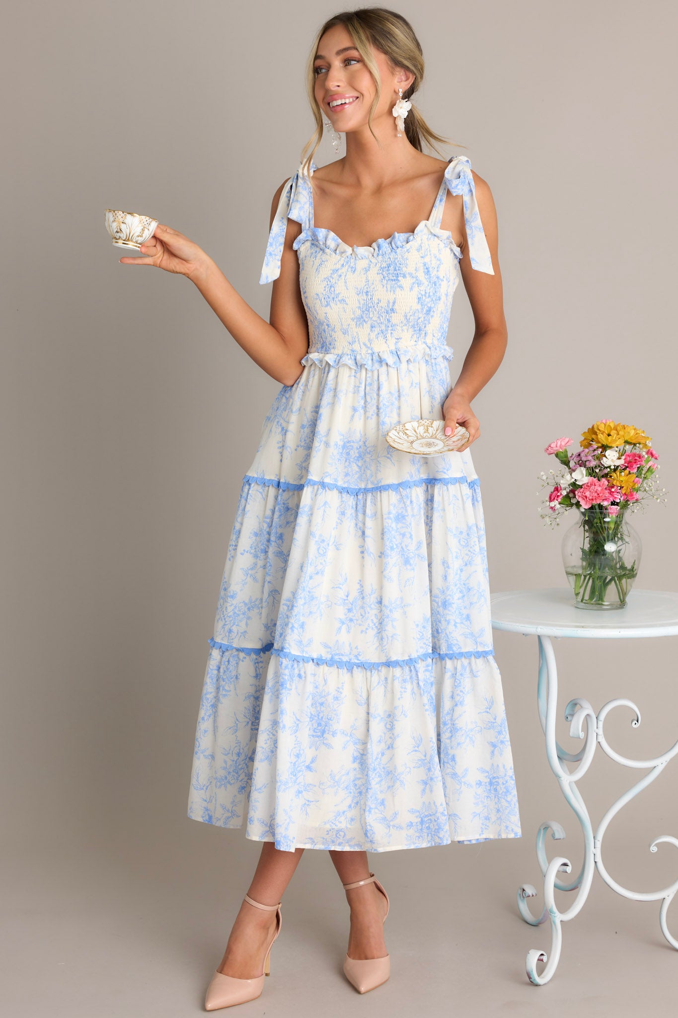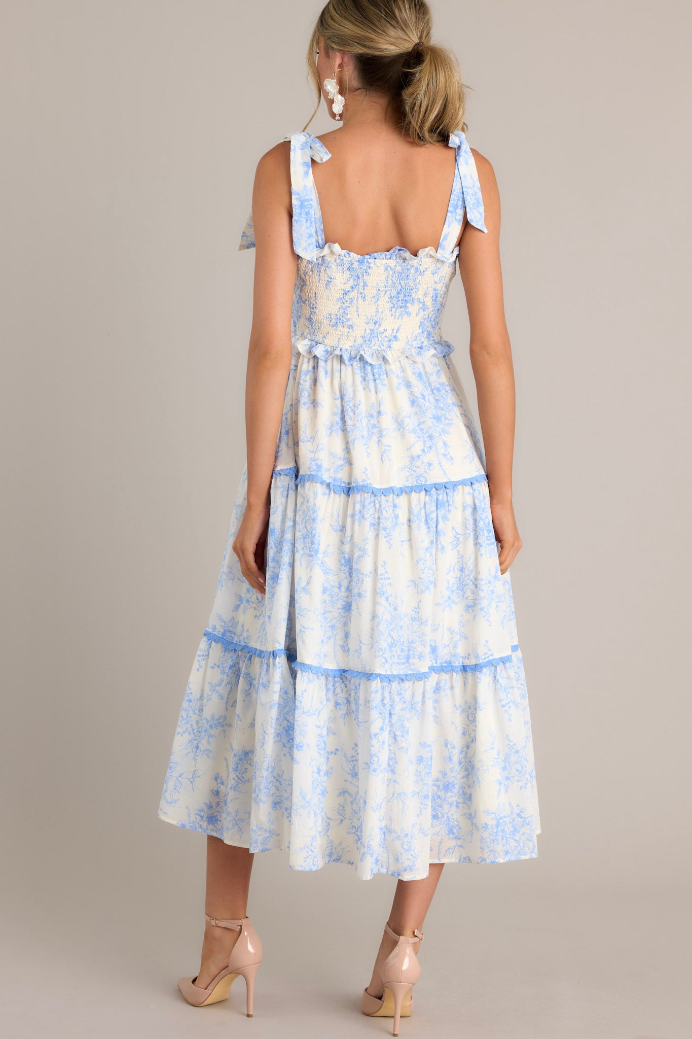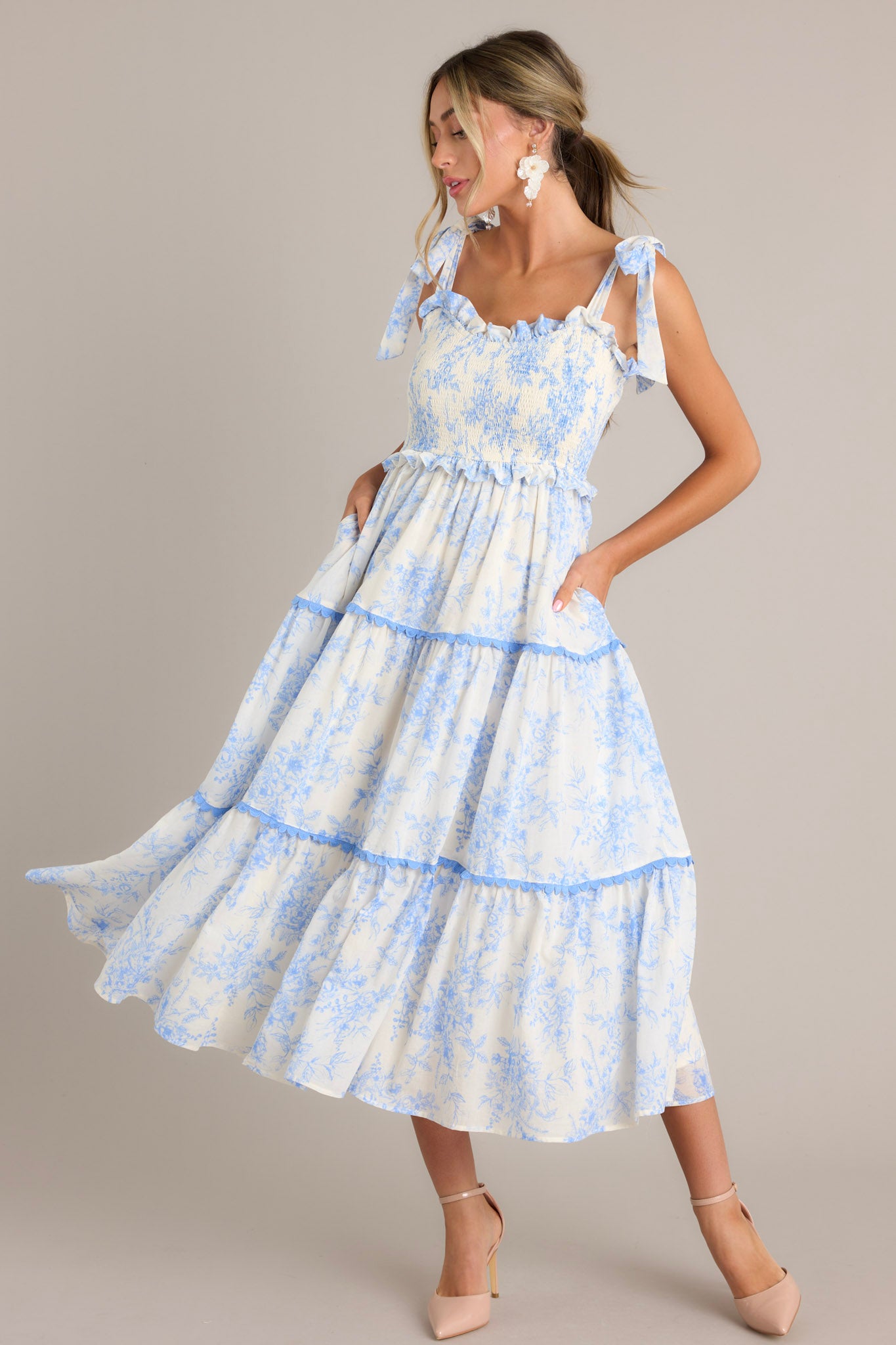 Experience a whimsical evening in the Meadow Serenade Blue Floral Toile Midi Dress. This flowy dress features a delicate floral toile print and tiers that add movement and charm to your outfit. Perfect for any occasion, this dress will make you stand out in a playful and chic way! This light blue midi dress features a ruffled sweetheart neckline, self-tie straps, a fully smocked bodice, functional hip pockets, and scalloped tiers.