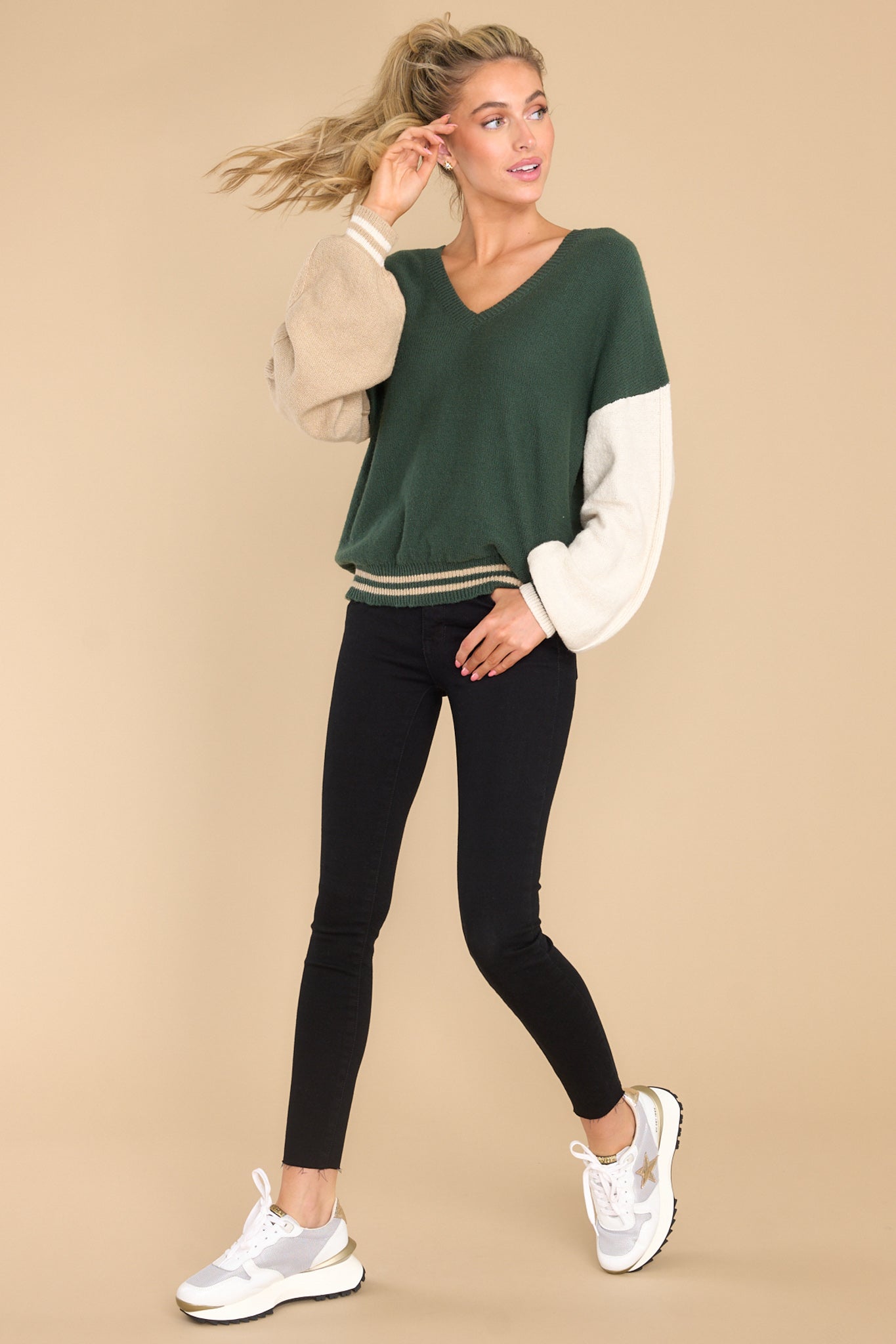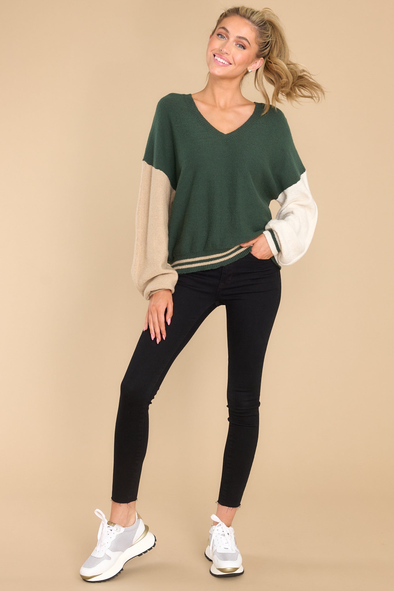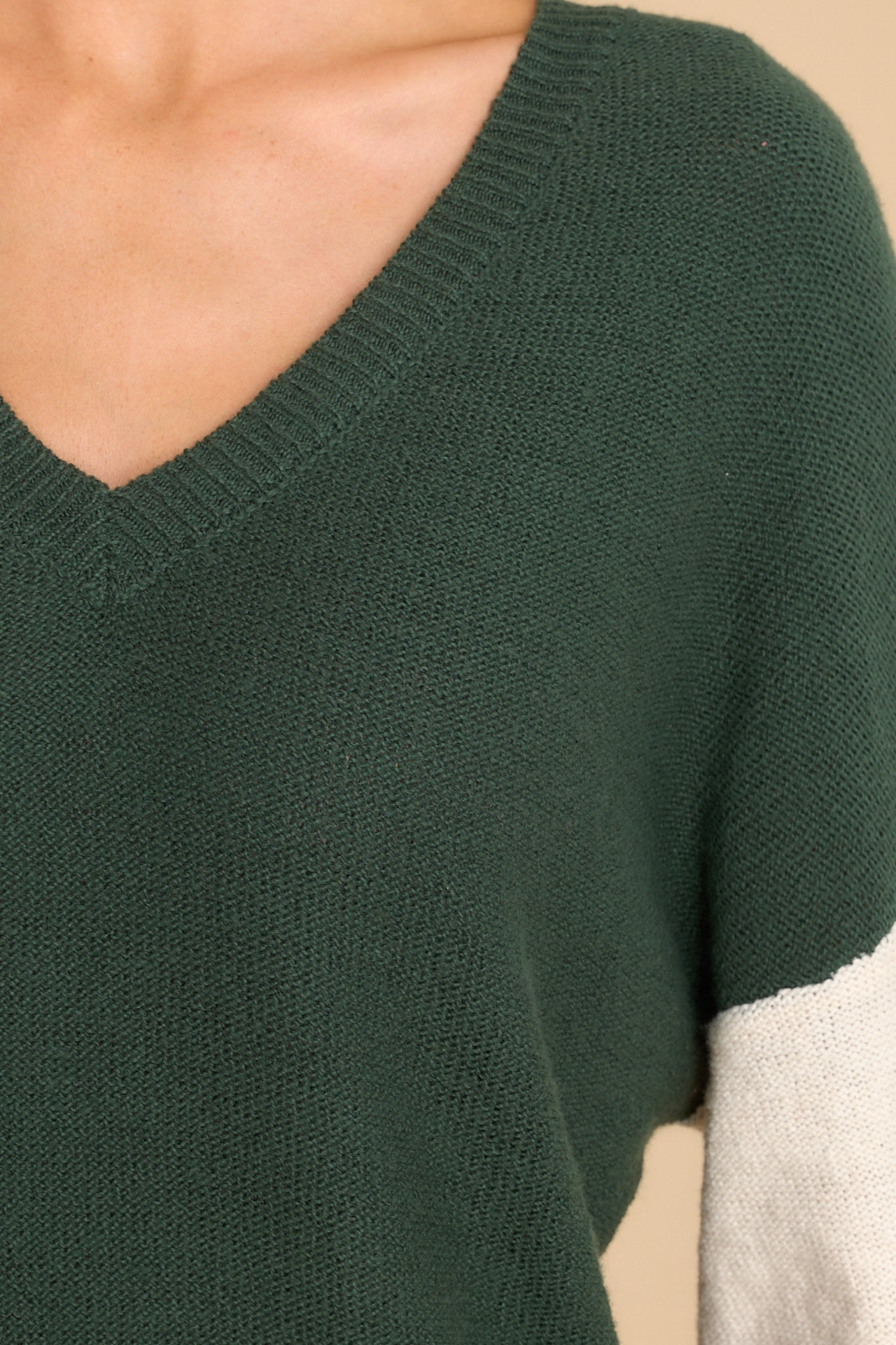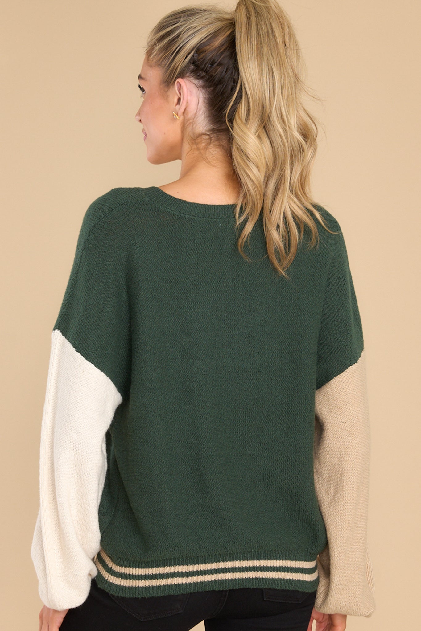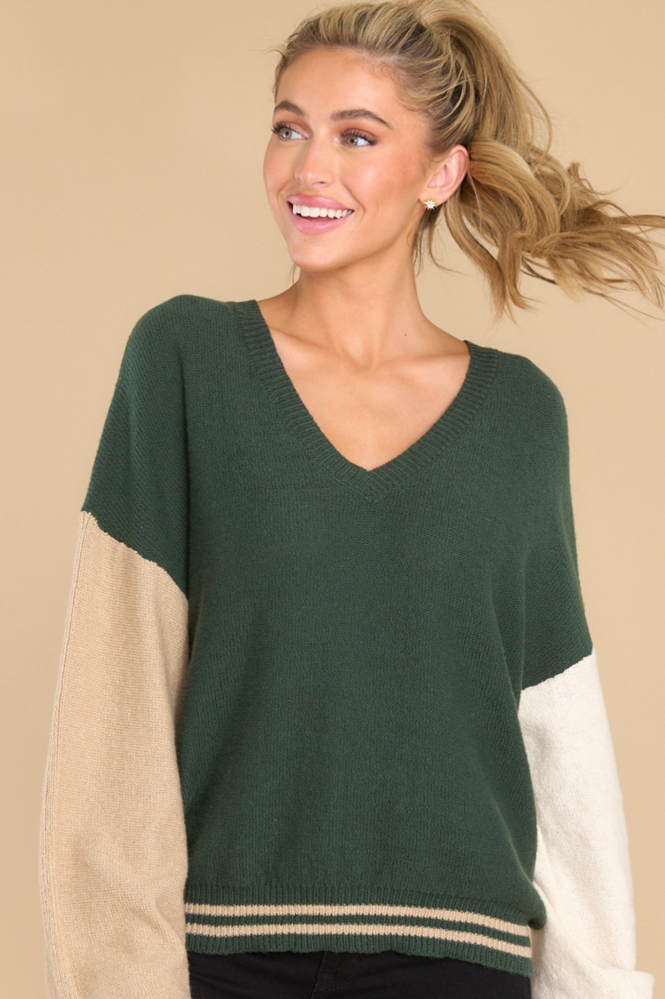 Stay cool at your next "Fair" in this Mean Something Hunter Green Sweater. It's the perfect way to stay cozy while you show off your unique style. Make sure your look stands out and turns heads with this one-of-a-kind piece! This sweater features a v-neckline, cuffed long sleeves, and a color block design. Model is wearing a size small. • 55% Cotton, 23% Acrylic, 22% Recycled Polyester • Hand Wash Cold • Imported