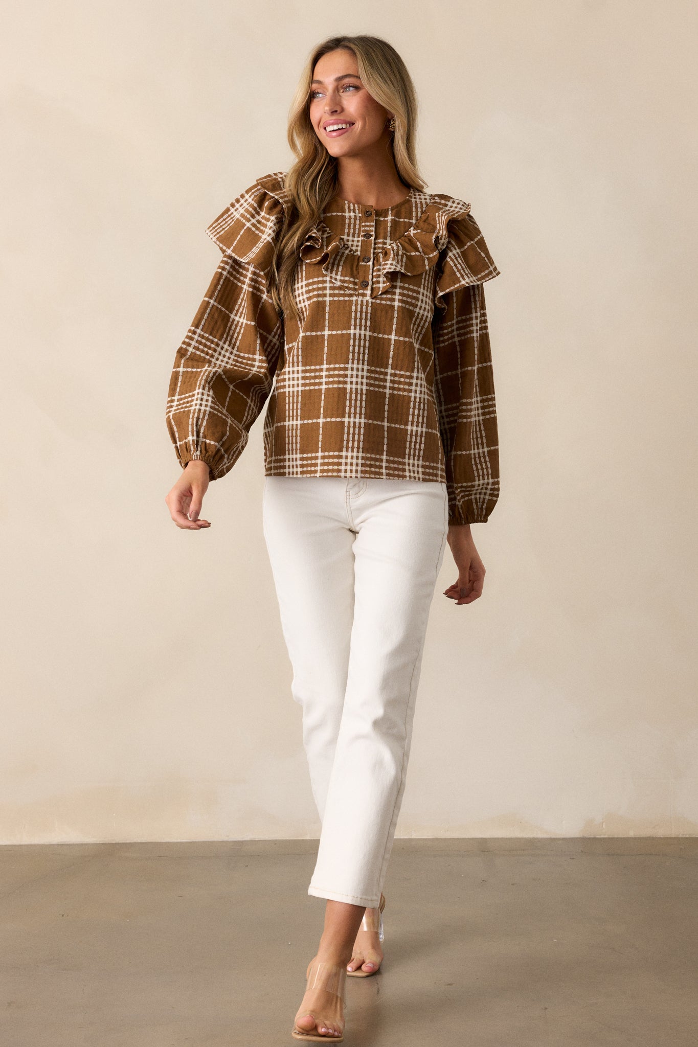 Indulge in comfort and style with our Mellow Moments Flutter Sleeve Blouse. Made with 100% cotton, this blouse offers a soft and breathable fit. The flattering flutter sleeves add a touch of femininity to any outfit. Perfect for a casual fall or winter day out! This mocha blouse features a rounded neckline with 4 functional buttons, ruffle detailing along the front and shoulders, a boxy fit, plaid pattern, and long puff sleeves with flutter detailing.