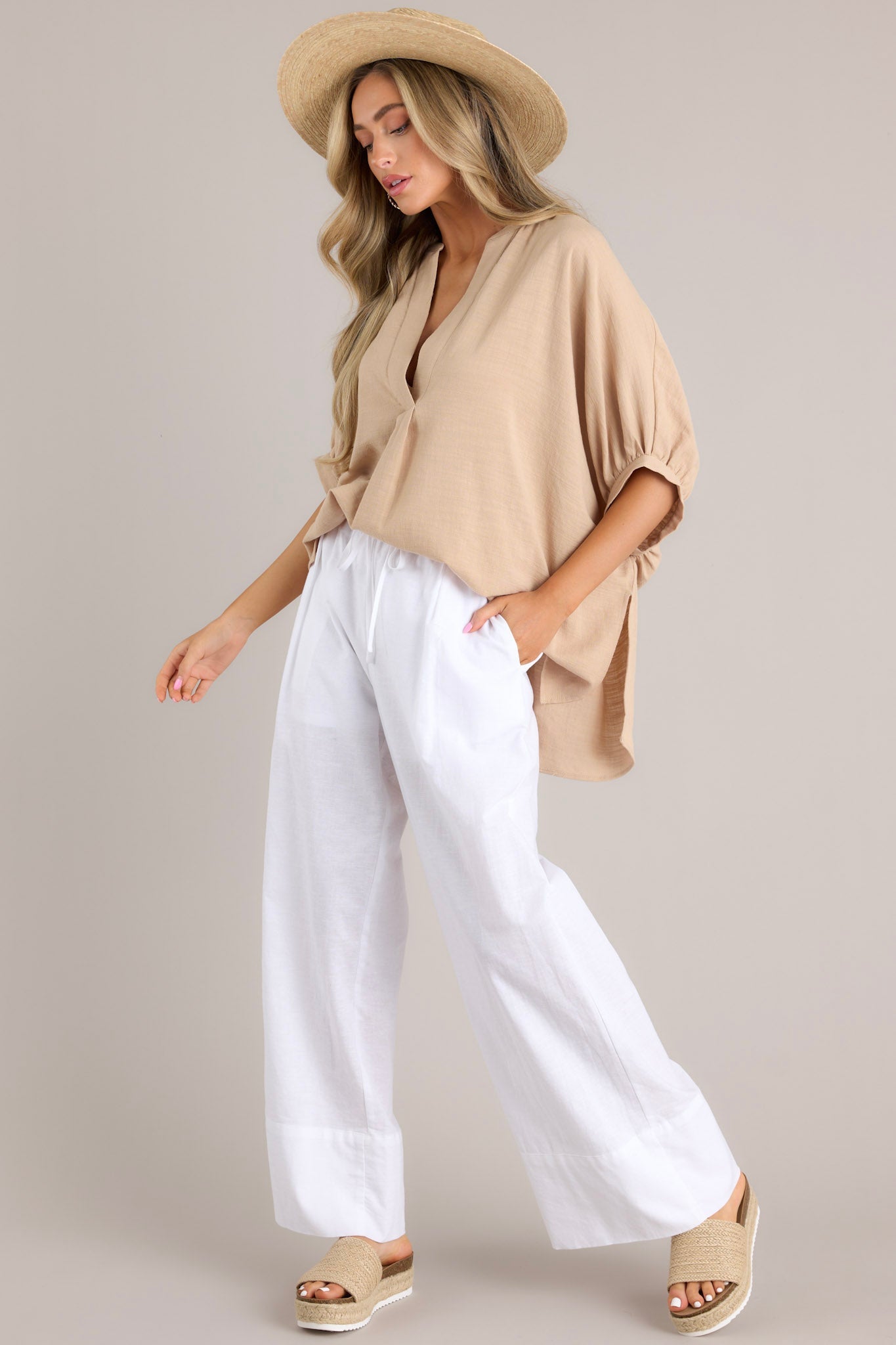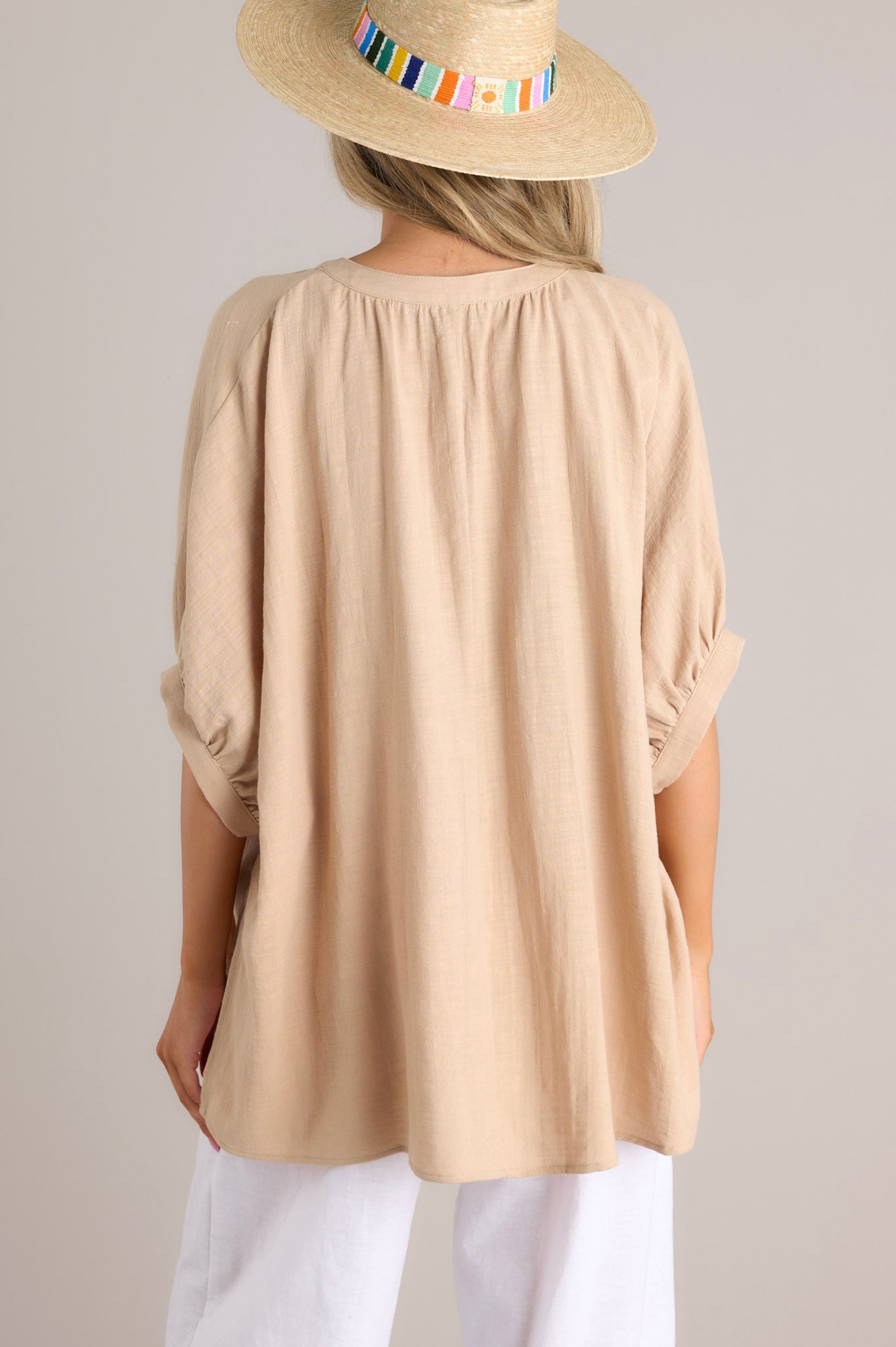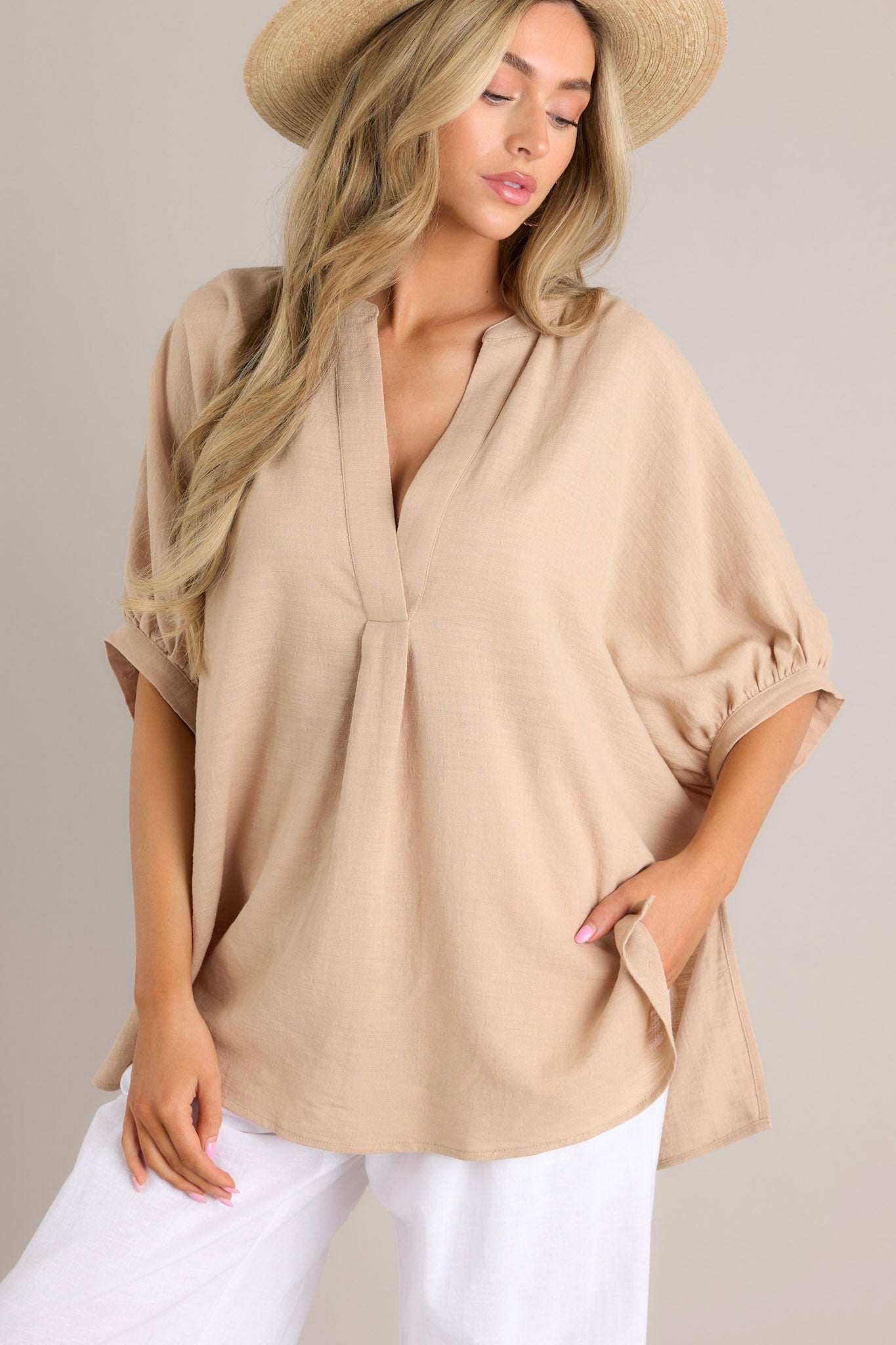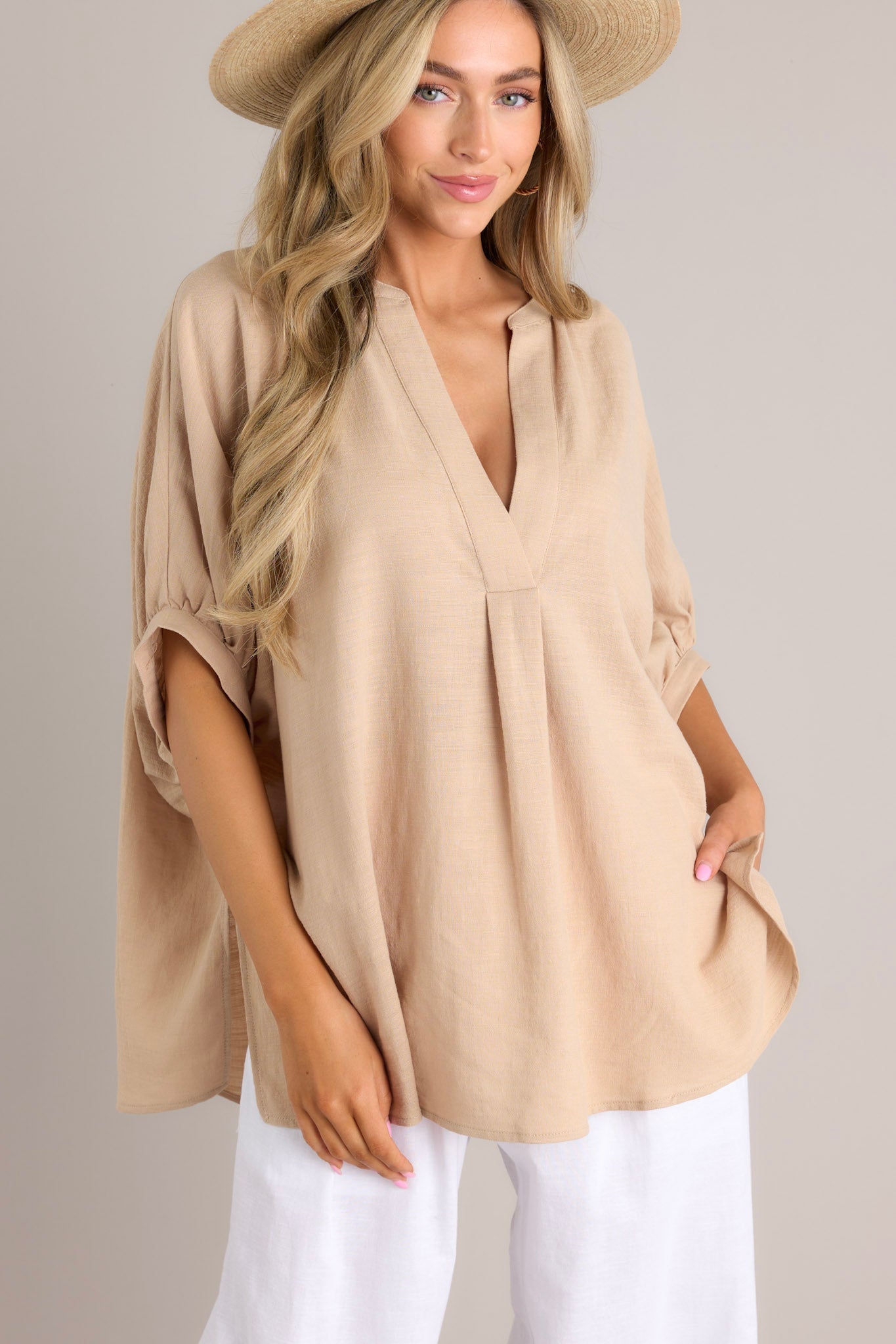 Embrace your inner dreamer with our Memoirs Of A Dreamer 100% Cotton Beige Top. The loose fit and soft fabric will have you feeling like you're floating on clouds, while the dolman sleeves add a touch of whimsy to your wardrobe. Let this top inspire your creativity and embrace your unique style. This top features a v-neckline, a lightweight material, a split hemline, and cuffed dolman sleeves.