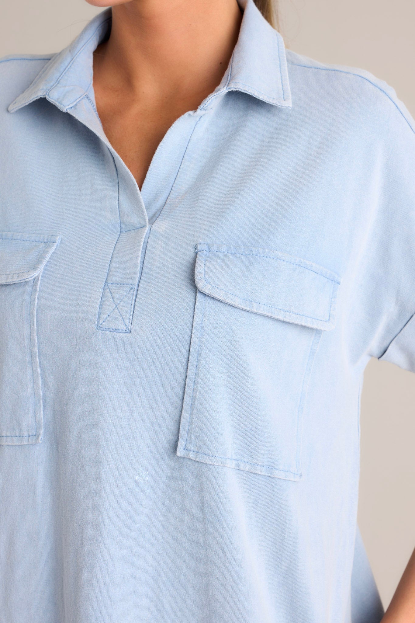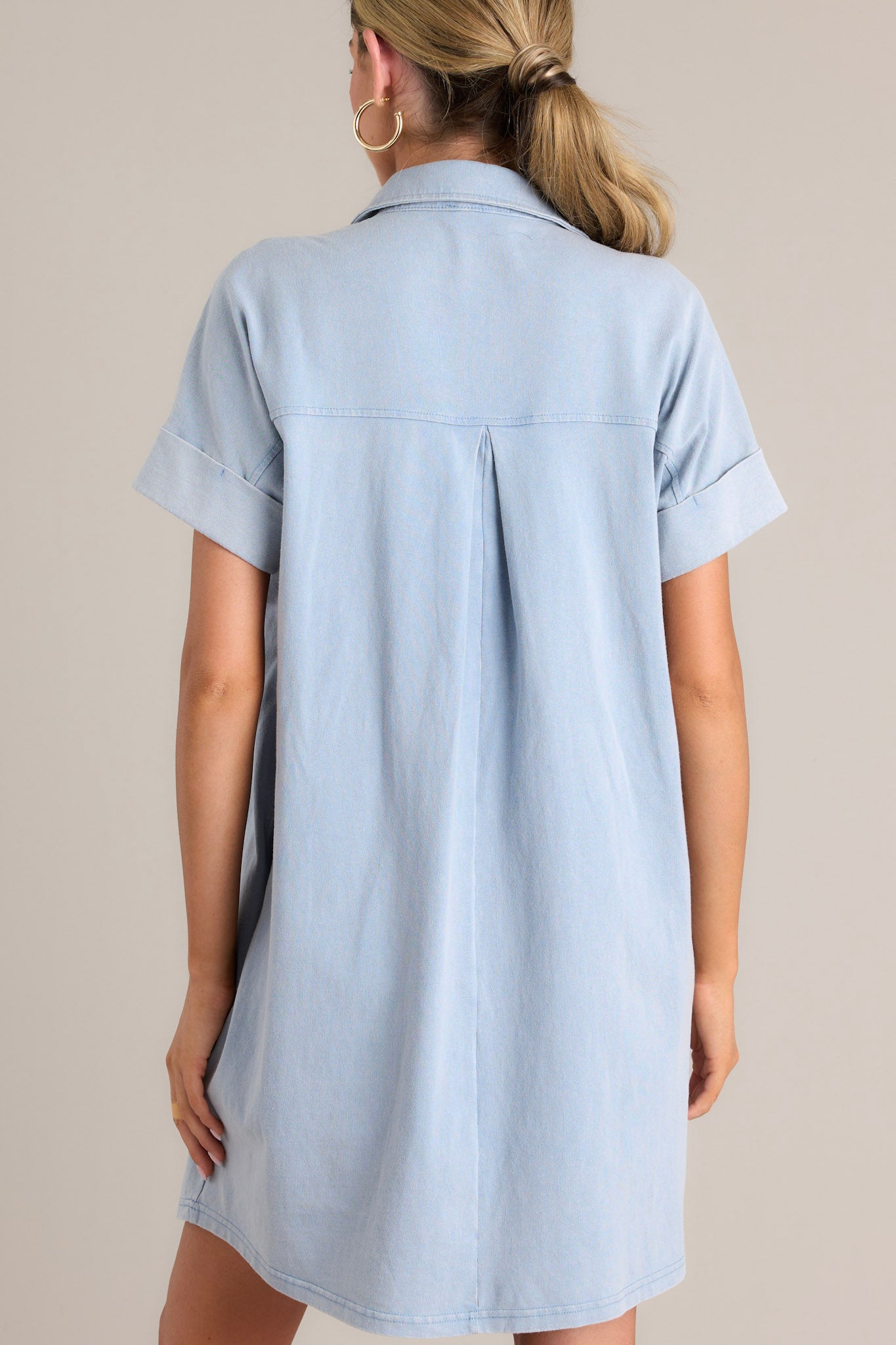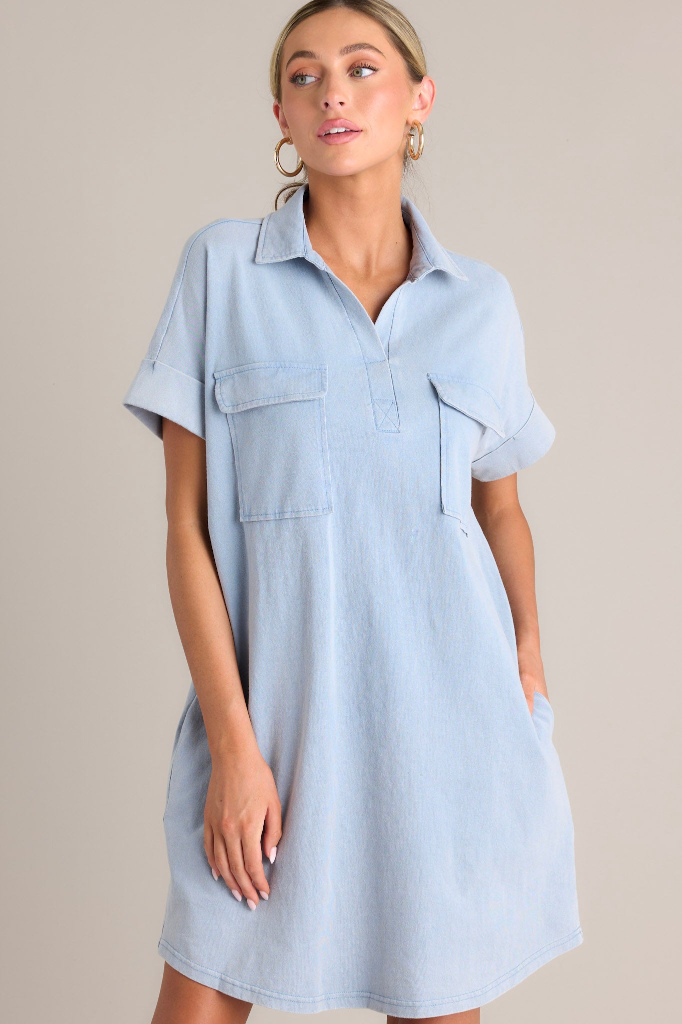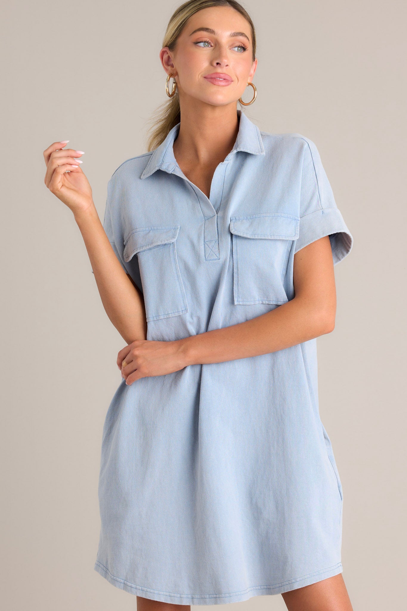 Shine bright in the Metropolitan Mood Light Chambray Collared Mini Dress! This playful dress features a chambray material with a collared neckline, perfect for channeling your inner style guru. Whether for a brunch date or a night out, this dress will be sure to turn heads and make a statement. This light chambray mini dress features a collared neckline, functional breast & hip pockets, a relaxed fit, and cuffed short sleeves. *The belt pictured is for styling purposes only and is NOT included.