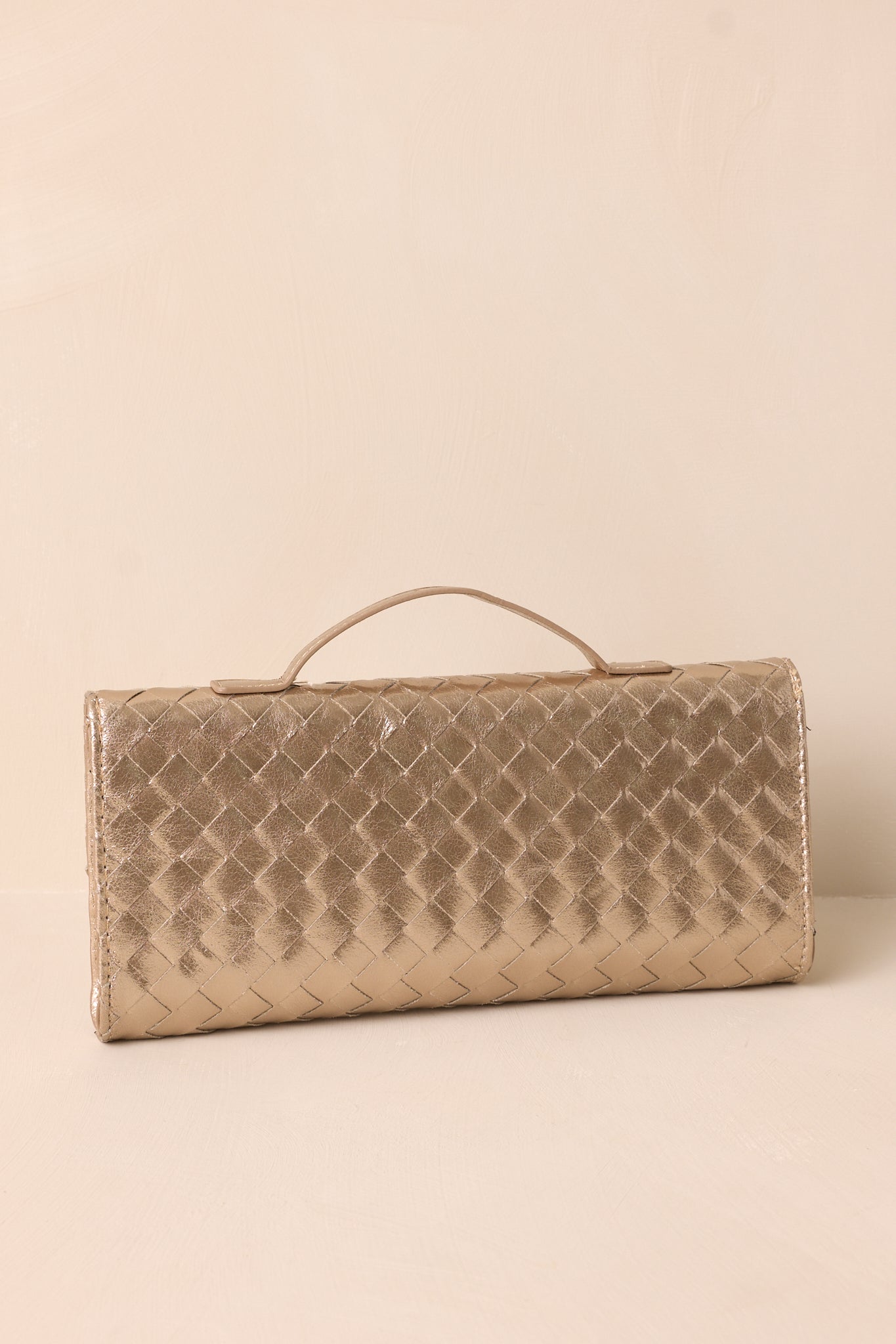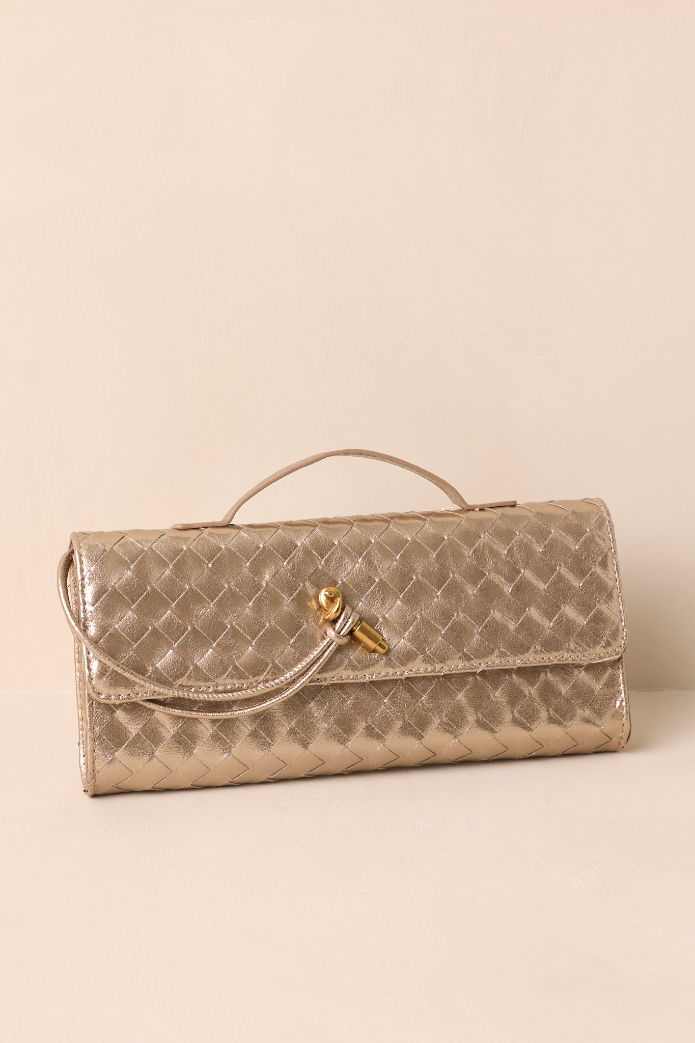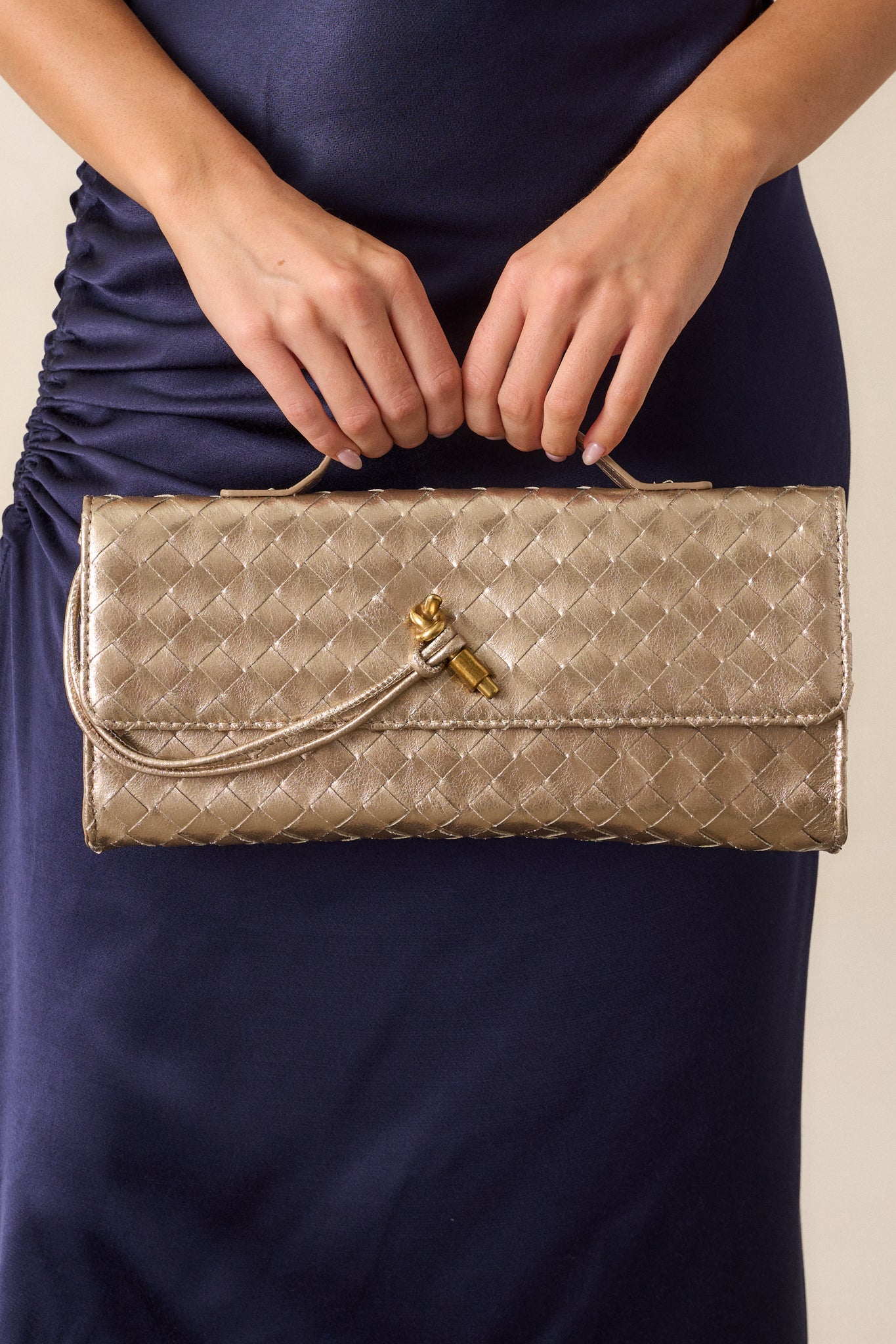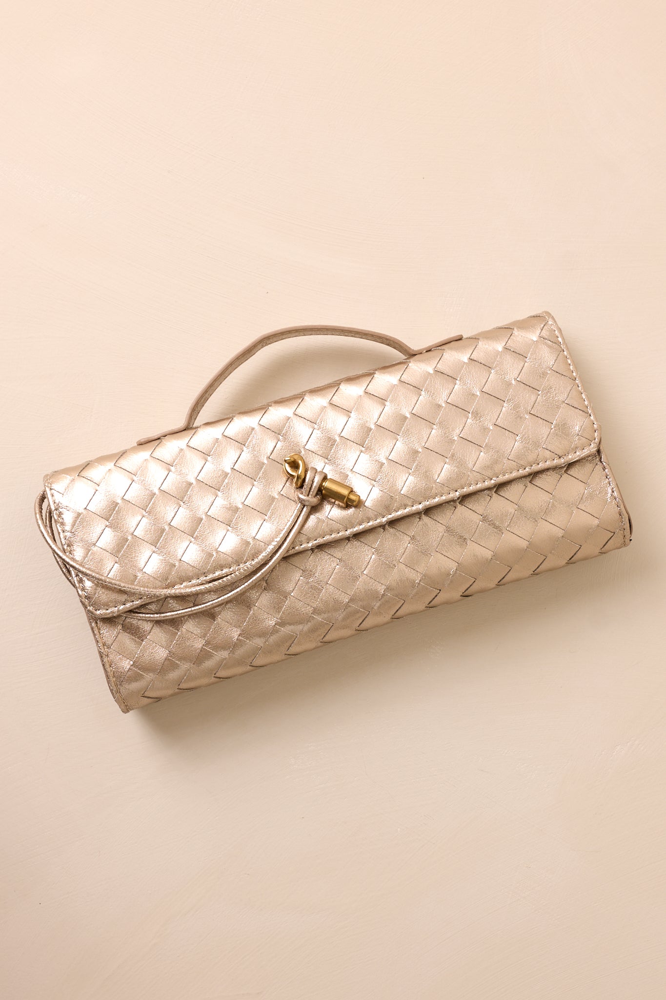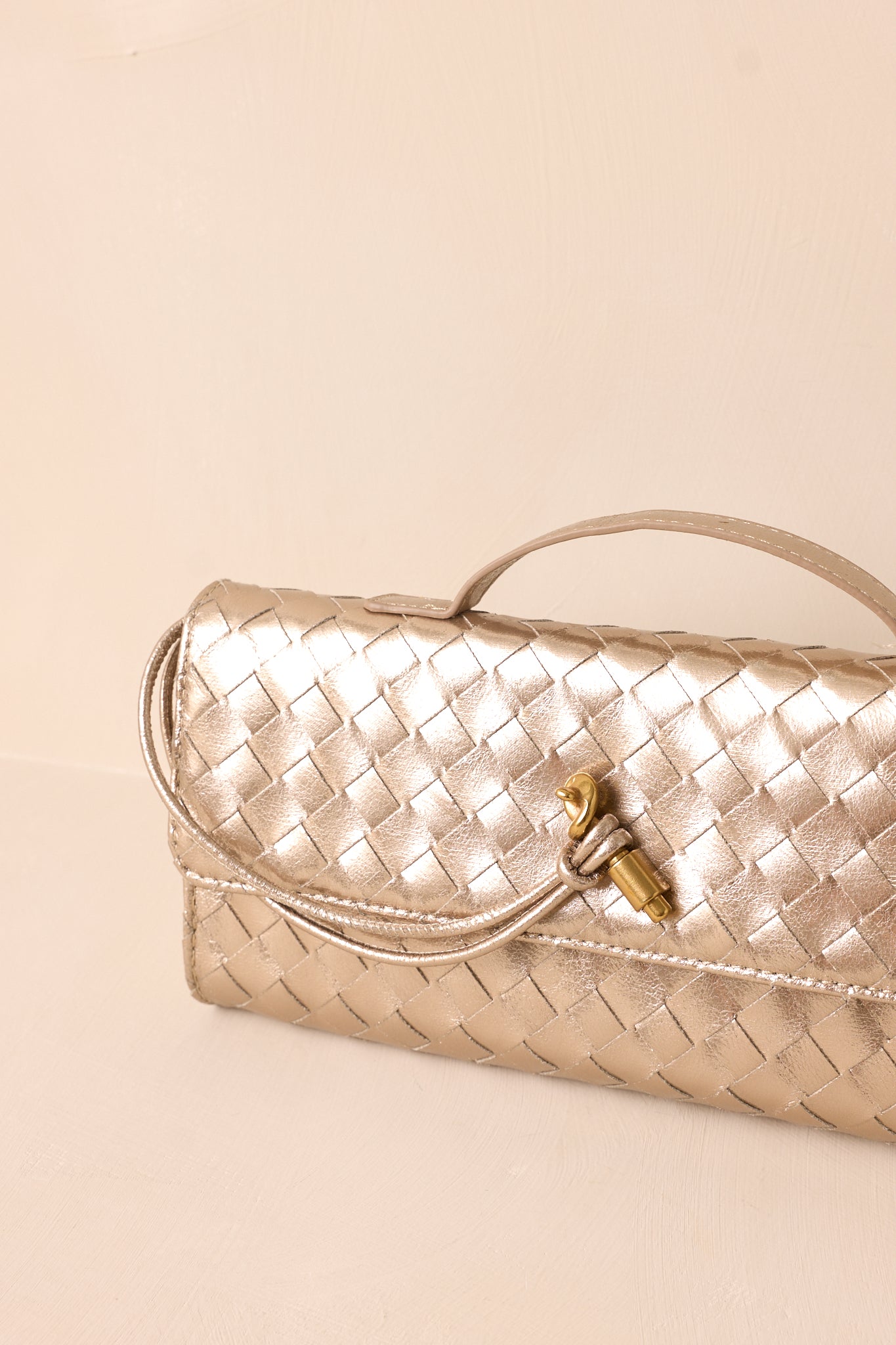 This Midnight Sun Gold Woven Handbag is handcrafted with a unique woven design. The lightweight material makes it perfect for any occasion, while the spacious interior provides ample room for all your essentials. Elevate your style and fashion with this handbag. This gold handbag features a rectangular shape, a gold handle on top of the bag, a gold accent front piece, a magnetic fold over closure, a large inside pocket, a small built in card holder and gold side hoops for the optional crossbody strap.