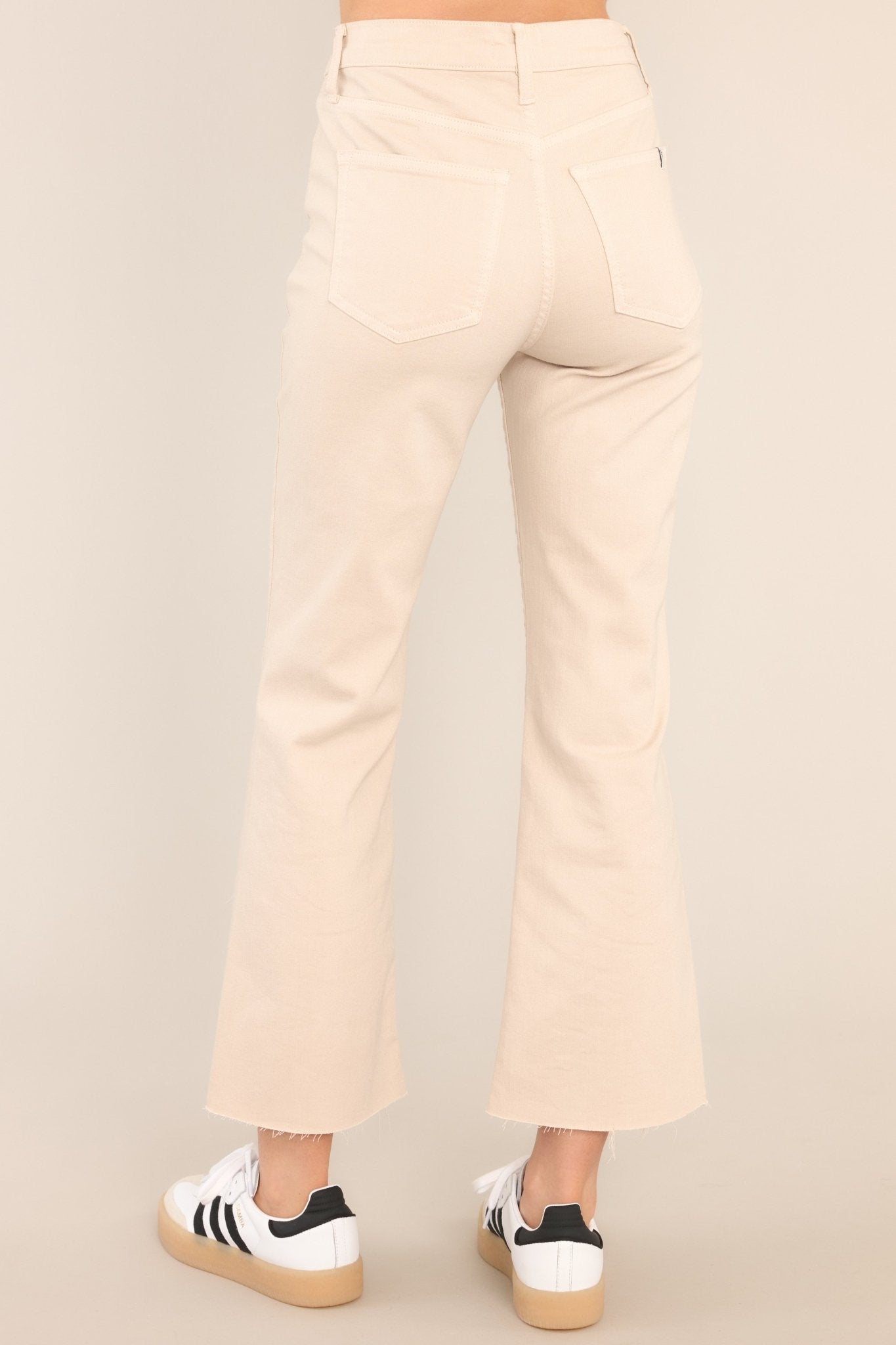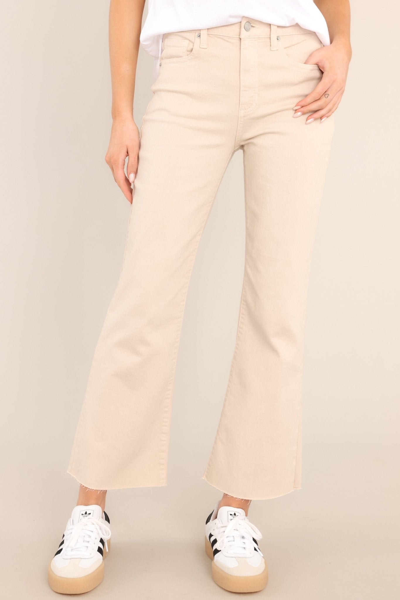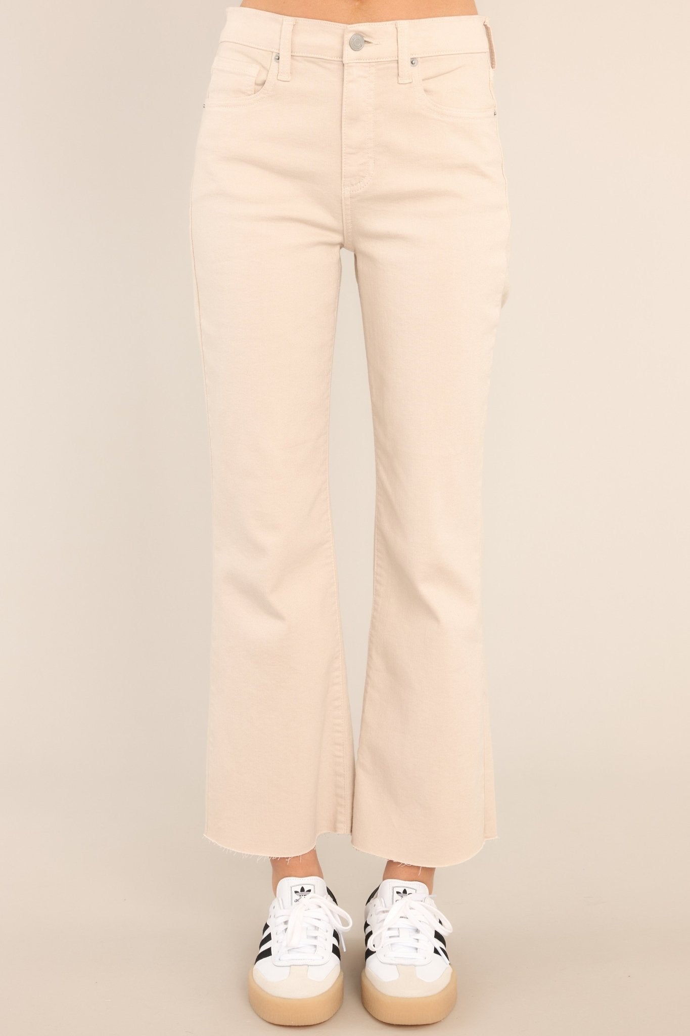 Stay stylishly sharp in these Mind The Thorns Beige Cropped Flare Jeans. With a flattering cropped flare cut, these jeans will add a playful edge to any outfit. Made with high-quality denim for comfortable wear and durable style. No more boring jeans for you! These jeans feature a high waisted design, classic zipper and button closure, functional pockets, and a raw cropped hemline.