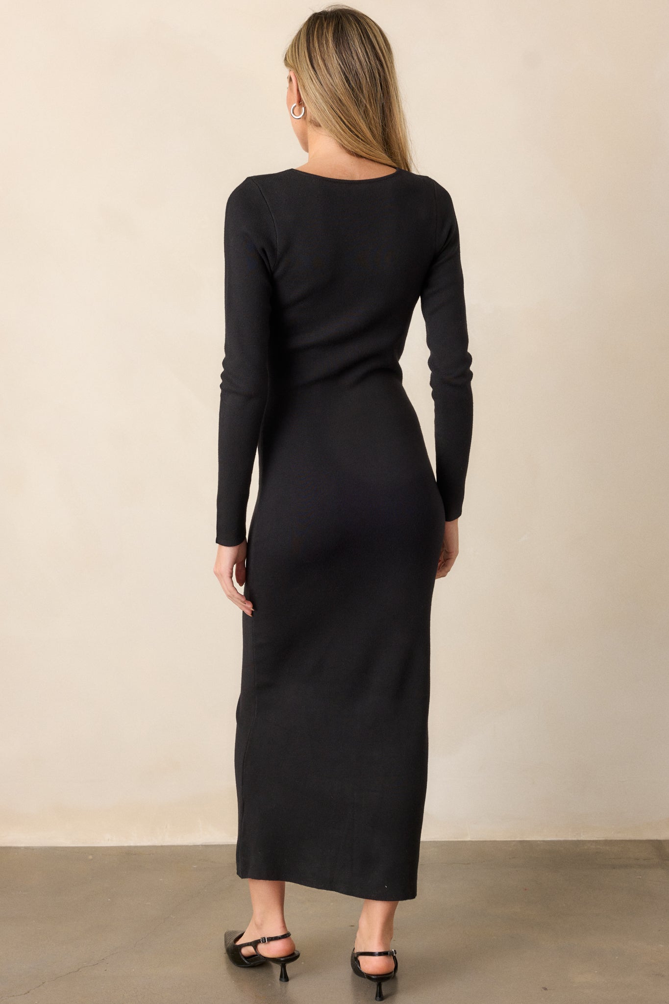 Stay warm and stylish this winter with our MINKPINK Isabel Black Knit Maxi Dress. Made with quality knit fabric, this dress offers both comfort and chic design. Perfect for day-to-night wear, it's versatile and sleek. Upgrade your wardrobe with this must-have piece. This black dress features a henley neckline, a knit fabric, a faux button front, a front slit, and long sleeves.