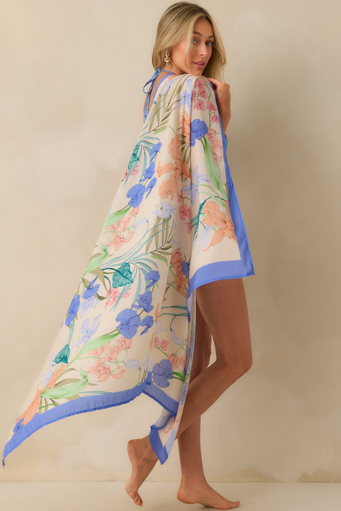 The MINKPINK Ivory Floral Print Ravina Sarong is made for warm days and sun-soaked escapes. Whether you're heading to the beach or lounging poolside, it adds an effortless layer of style to every laid-back moment. This ivory sarong features an exclusive MINKPINK multicolor floral print, solid periwinkle border, lightweight 100% cotton fabric, and a large rectangle shape.