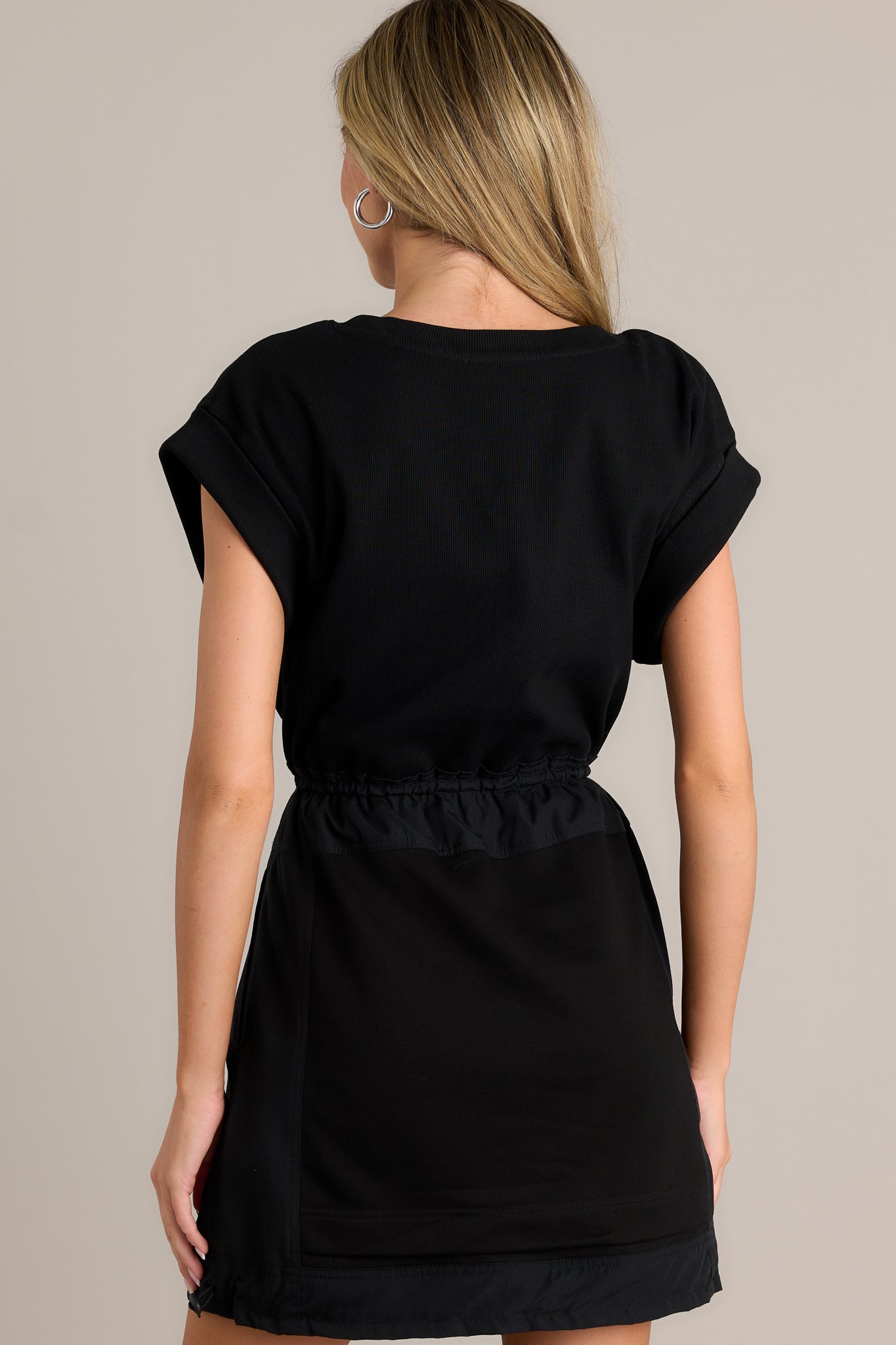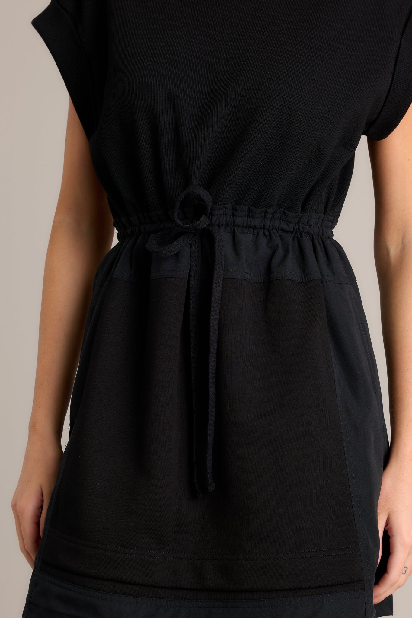 Be effortlessly chic in our Modern Minimal Black Mini Dress. With its sleek design and flattering fit, you'll turn heads at any occasion. Plus, the lightweight material makes it perfect for any weather. Time to add this versatile piece to your wardrobe! This black mini dress features a rounded neckline, a ribbed bodice, a self-tie drawstring waist, functional hip pockets, and an adjustable hemline.
