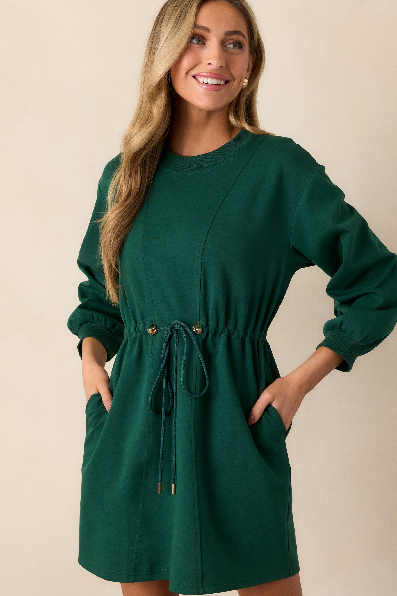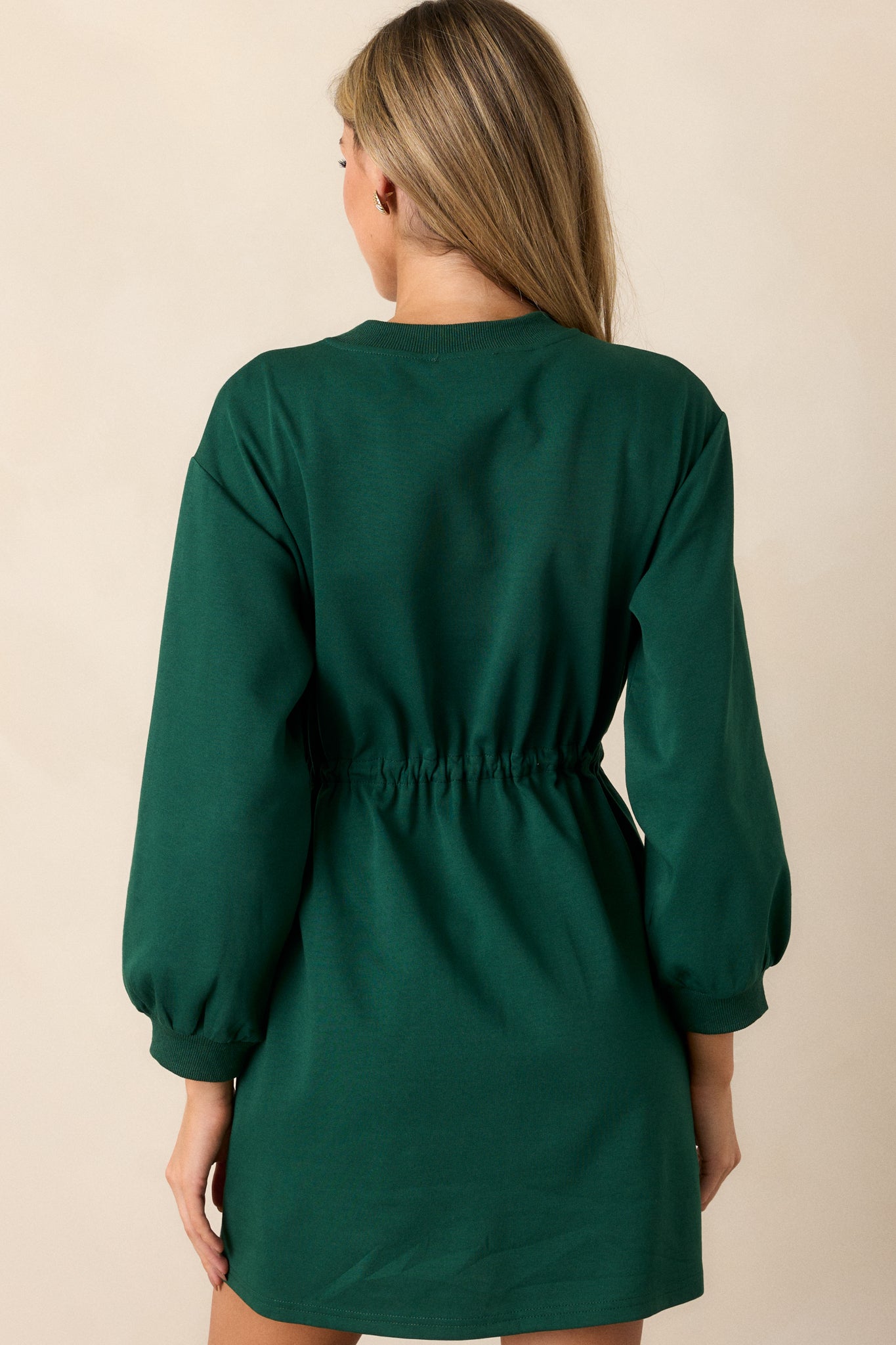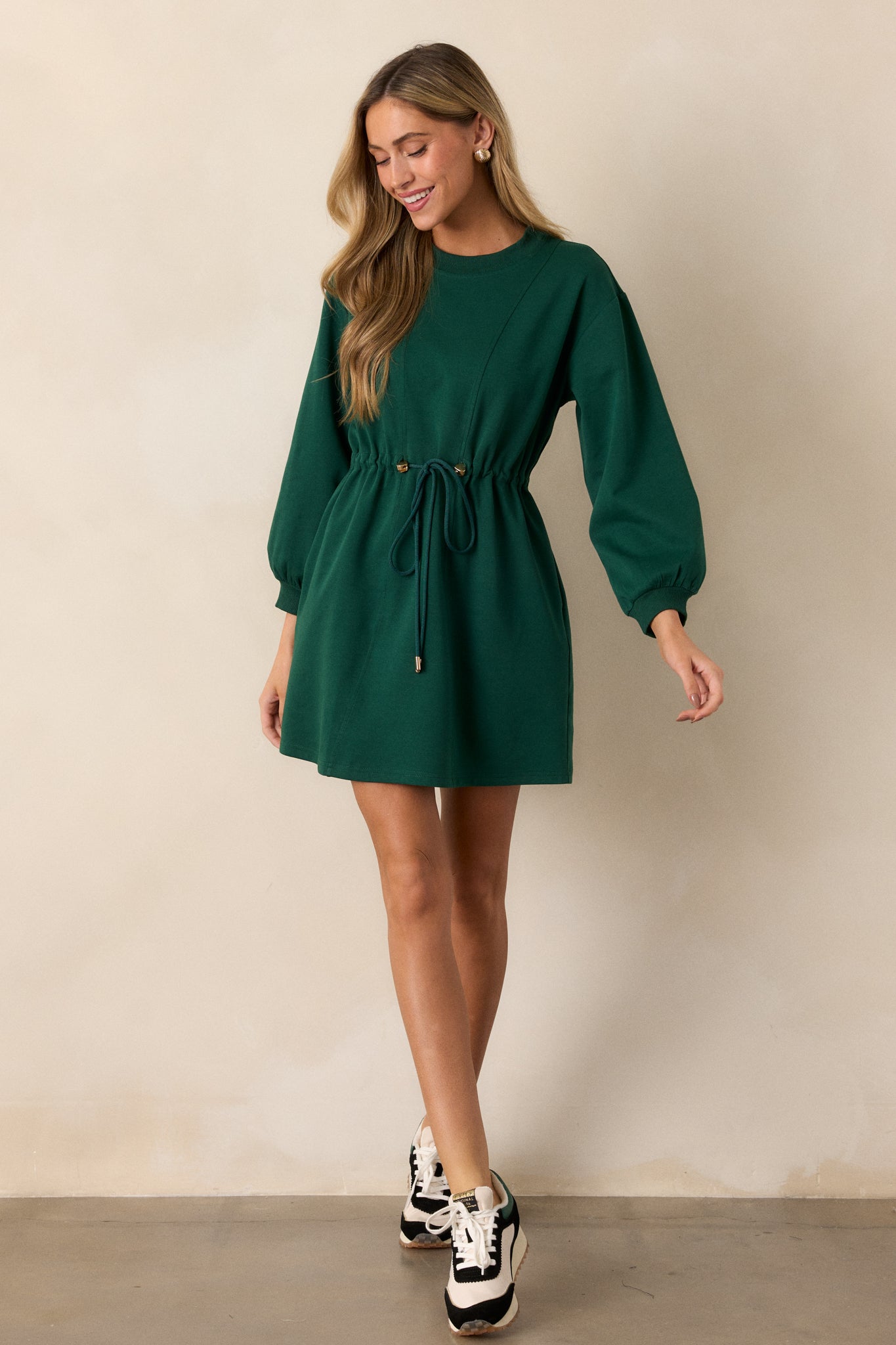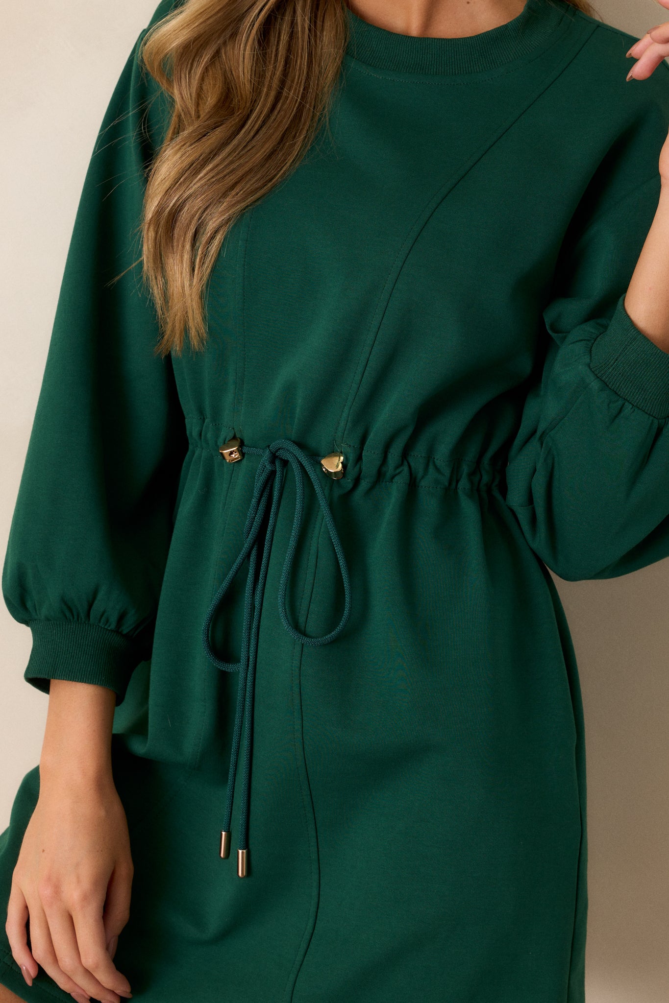 Unleash your playful side with our Mossy Haven Green Long Sleeve Sweatshirt Mini Dress. Made from the comfiest fabric, this dress is perfect for all-day wear. The cute heart detailing on the strings adds a touch of sweetness to complete the look. Get ready to turn heads and feel confident in this must-have dress! This green dress features a ribbed crew neckline, an adjustable drawstring waistband, gold heart string embellishments, and long sleeves with ribbed cuffs.