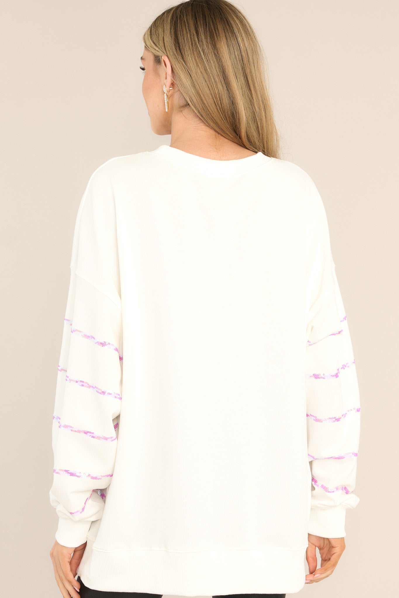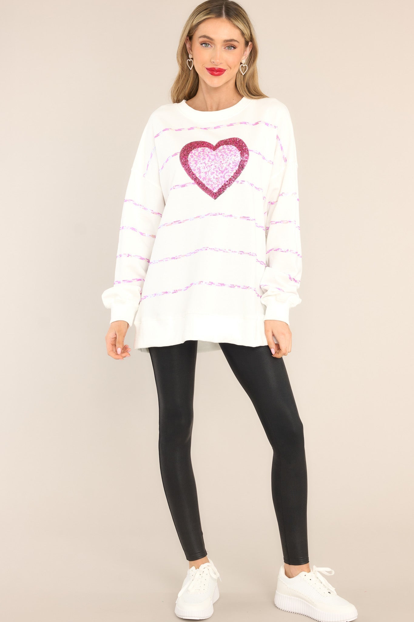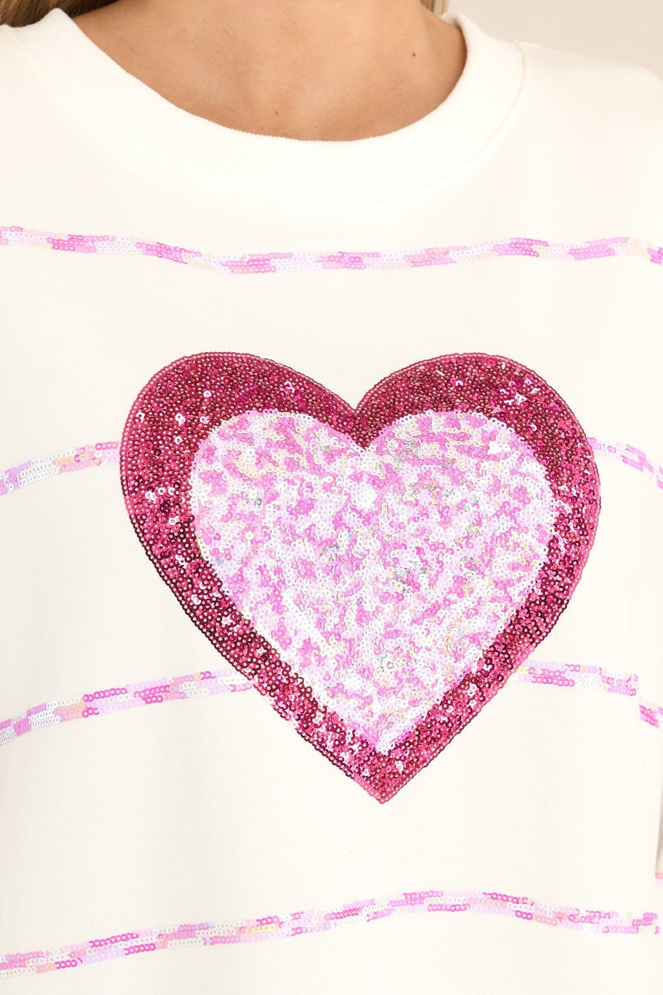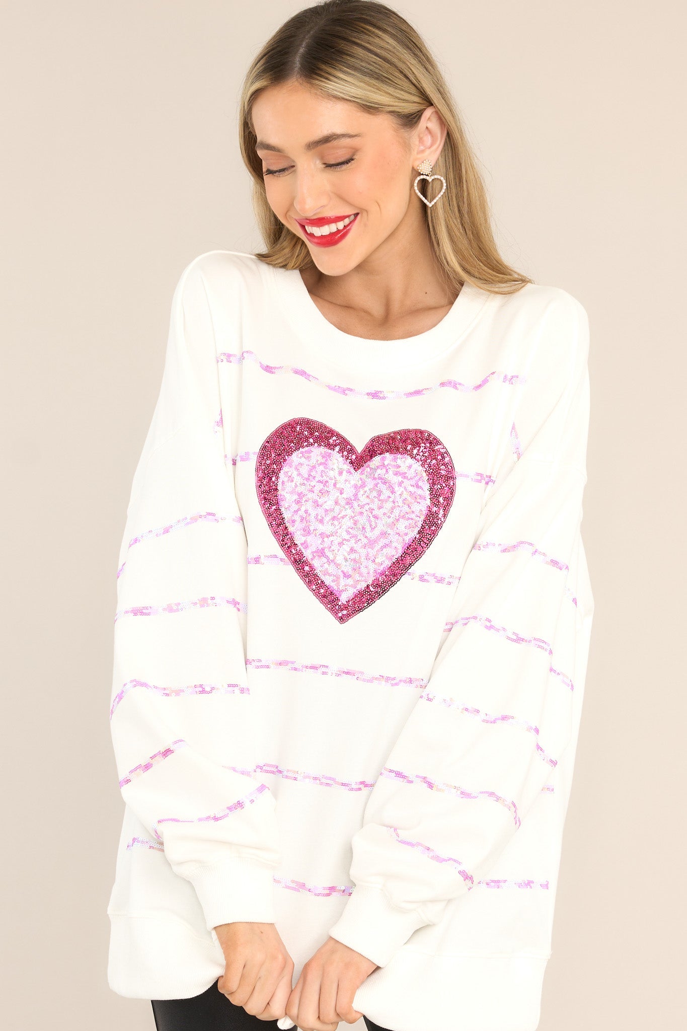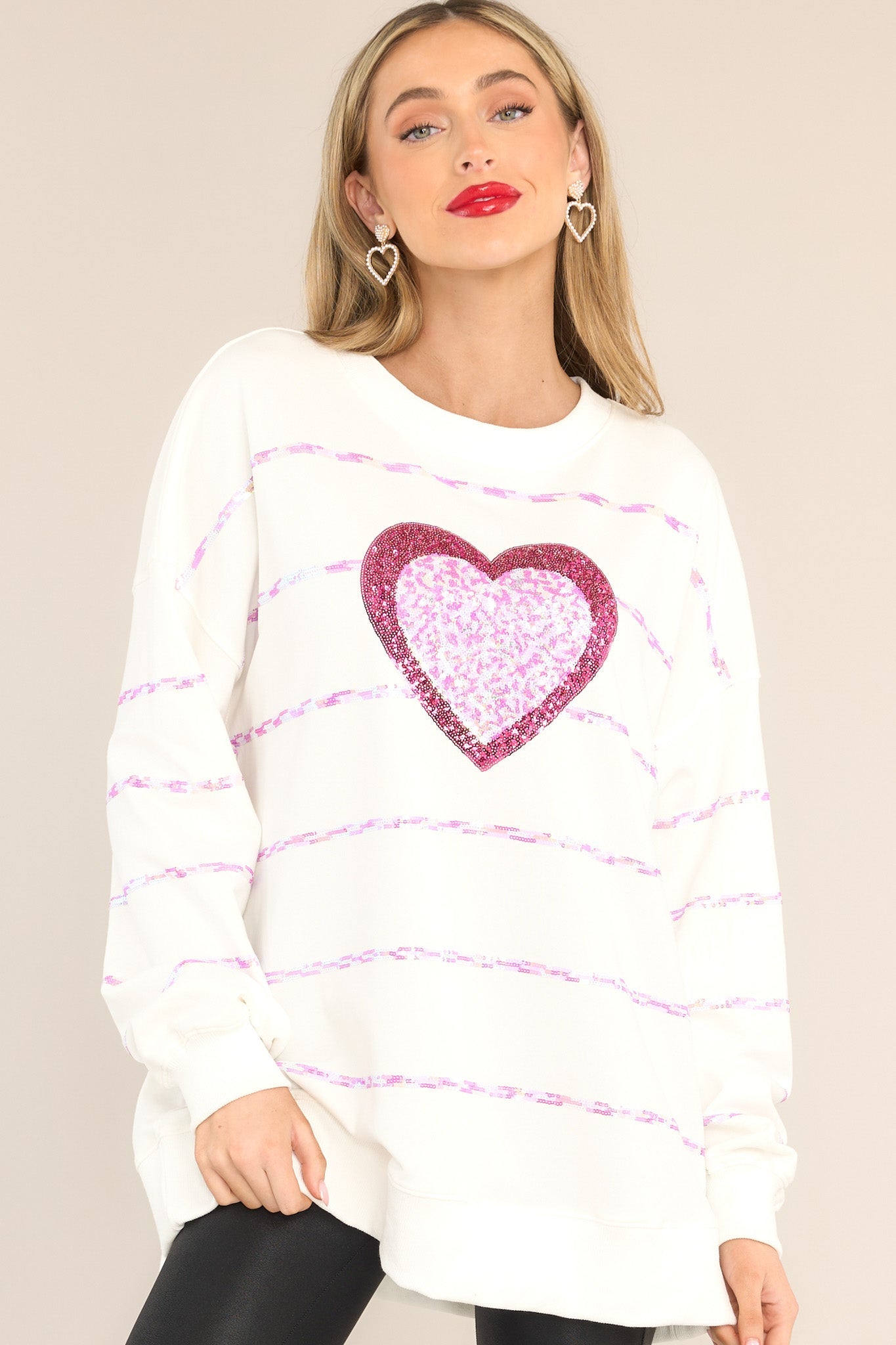 Declare your love in style with our My Heart Is Yours White Top! This adorable top adds a playful touch to any outfit. With its soft, comfortable fabric, you'll feel as good as you look. Show off your love with this must-have top! This top features a crew neckline, sequin stripes and heart detailing, ribbed cuffed long sleeves, and a ribbed hemline.
