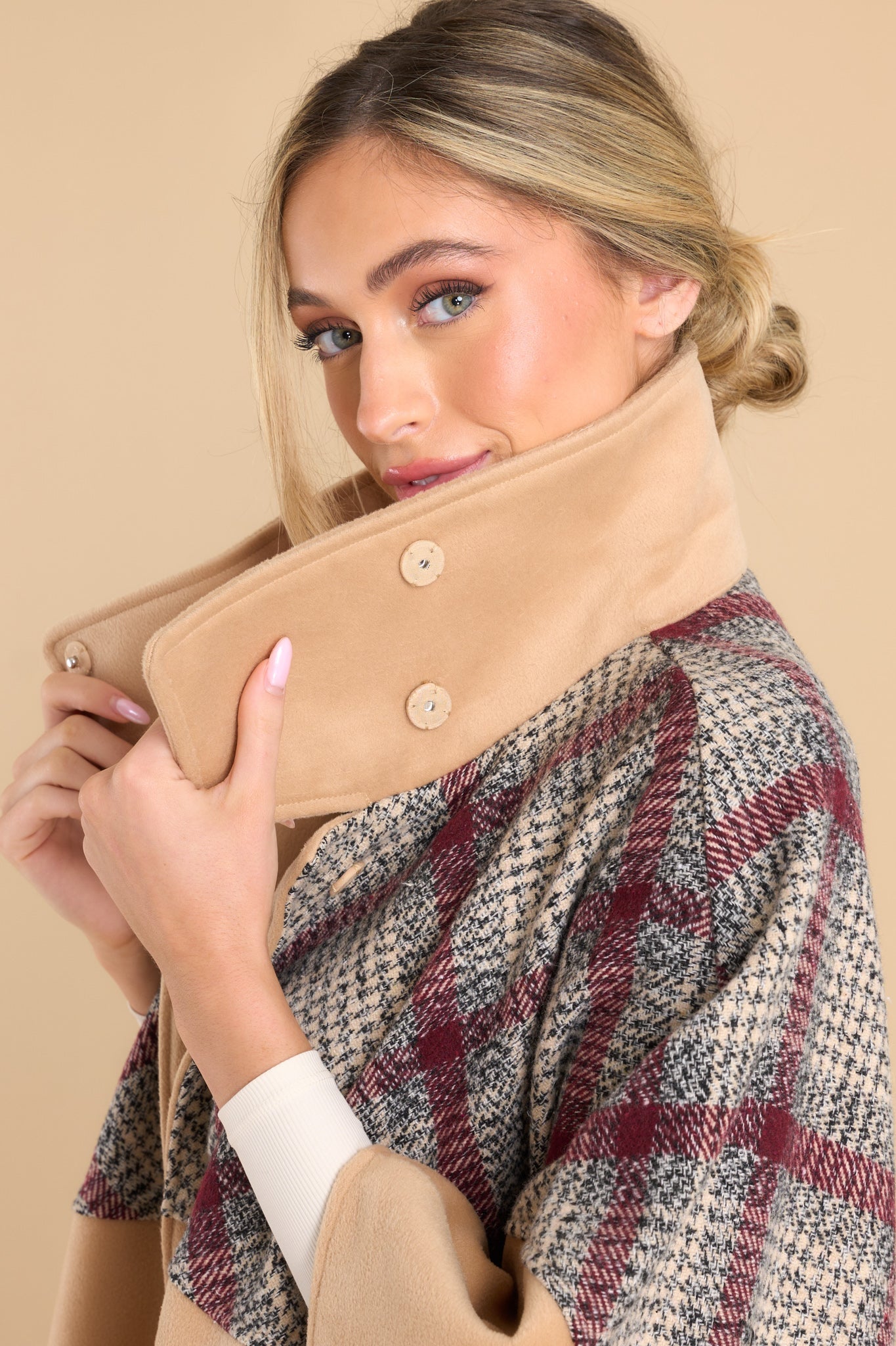 Stay warm - and stylish - in this My Own Plans Beige Multi Plaid Coat. Get ready to make a plaid statement - without saying a word! Its unique plaid design will have you looking chic and cozy all winter long. So don your new coat and stride through the season with confidence! This coat features a wide-collared neckline with a button closure in the front, open sides with a single button closure to create the sleeve slits, a plaid and houndstooth panel along the shoulders, two functional pockets, and a wide, oversized fit. Model is wearing a small/medium. • 80% Polyester, 20% Viscose • Hand Wash Cold • Unlined • Imported