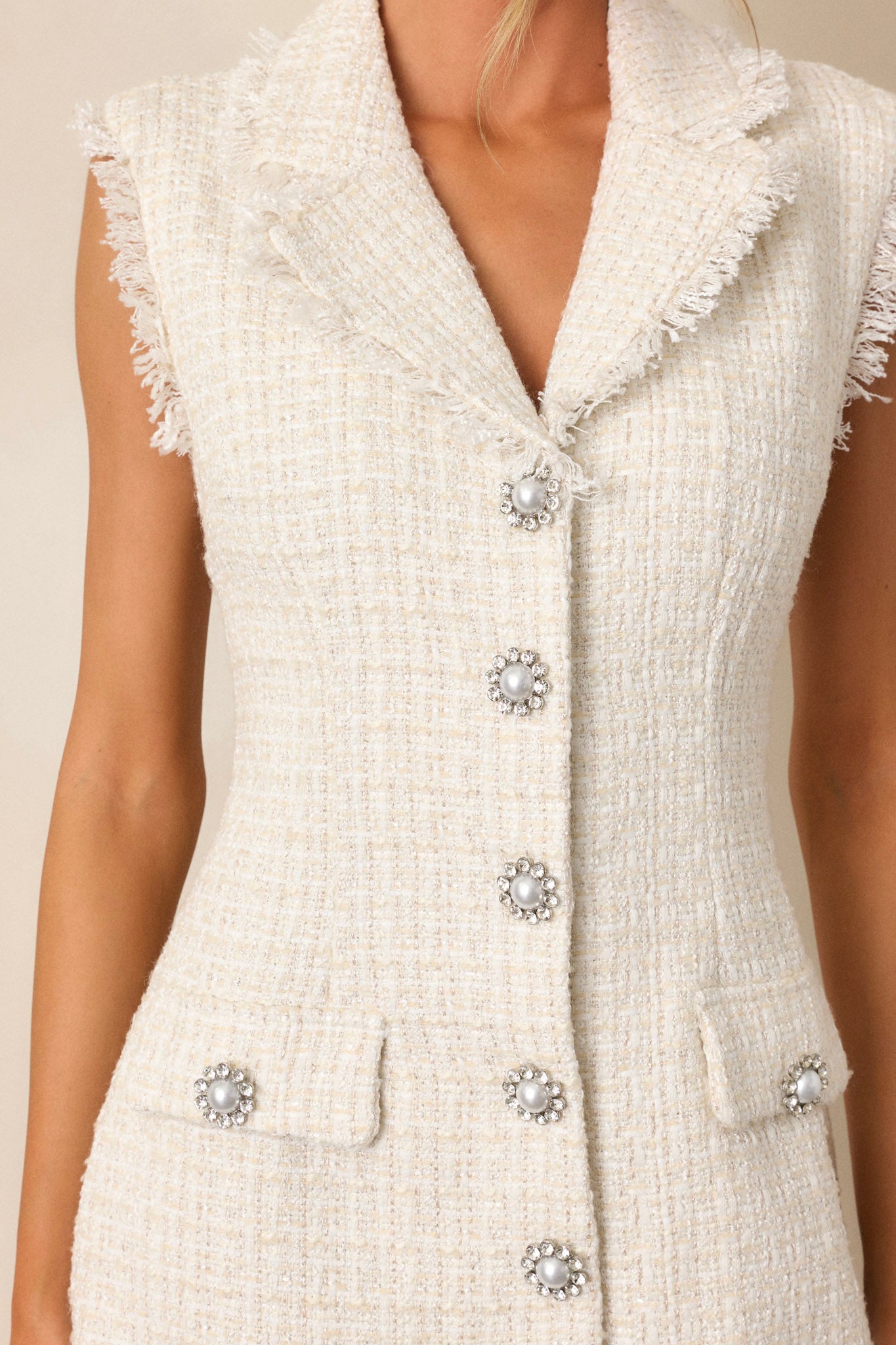 Transform your wardrobe with the My Own Ways Ivory Tweed Mini Coat Dress. This stunning sleeveless dress combines the sophistication of a coat with the elegance of a dress. Perfect for any occasion, this dress will turn heads and make you feel confident and stylish. Upgrade your look with this versatile and chic piece. This ivory mini dress features a sleeveless tailored coat silhouette, a v-neckline with a notched lapel collar, frayed hem detailing, a functional snap button front, decorative faux pearl and rhinestone buttons, and a chic mini length.