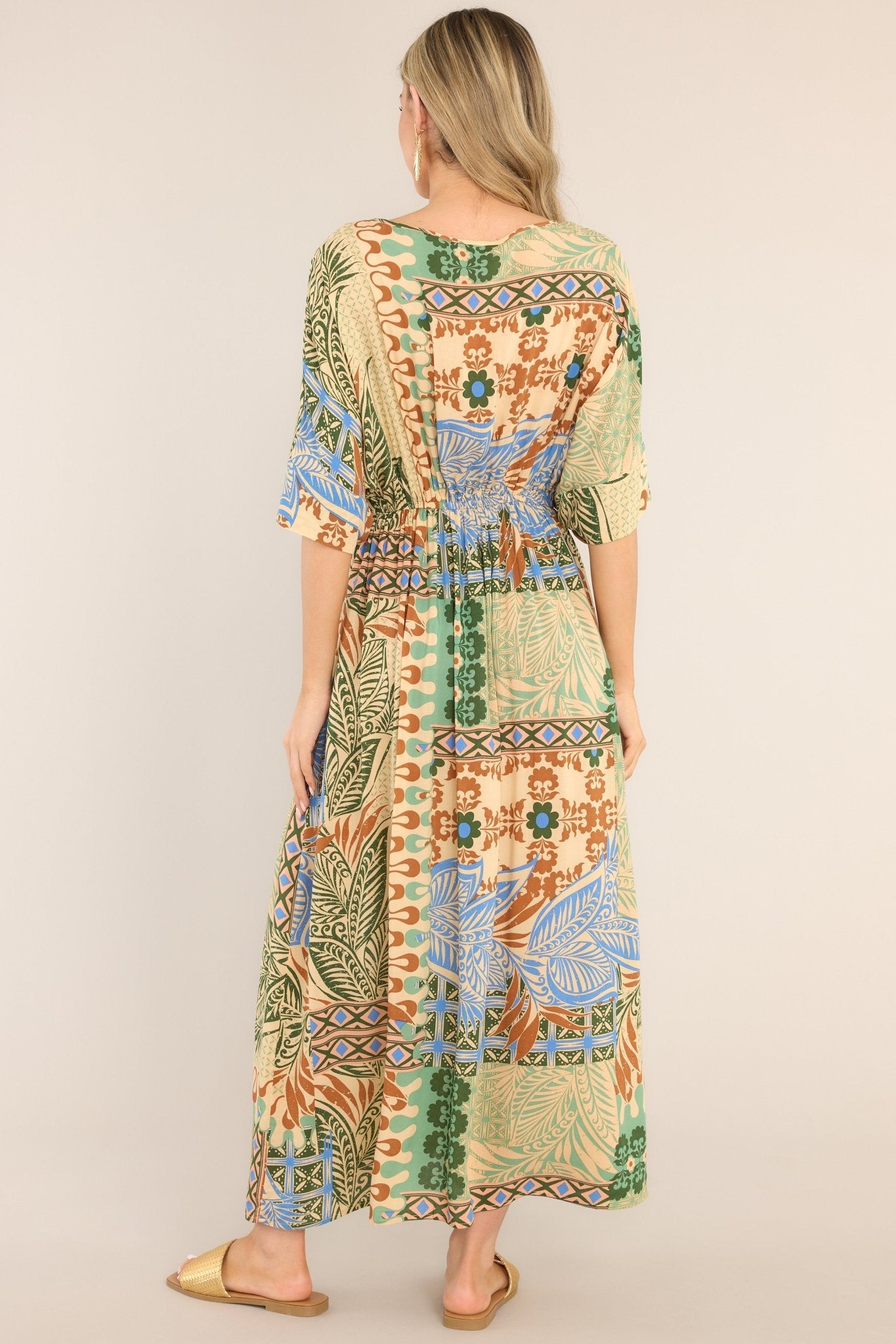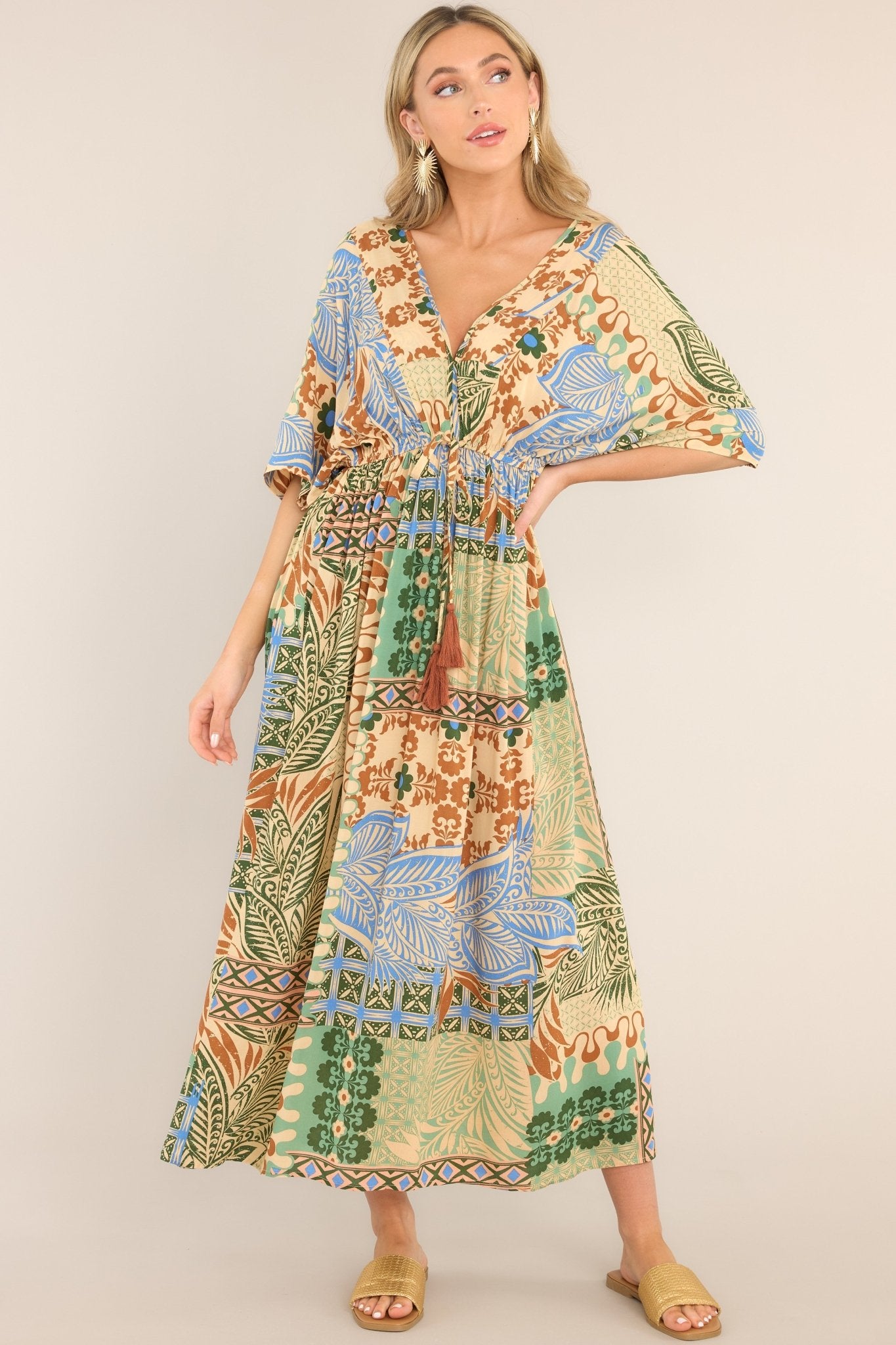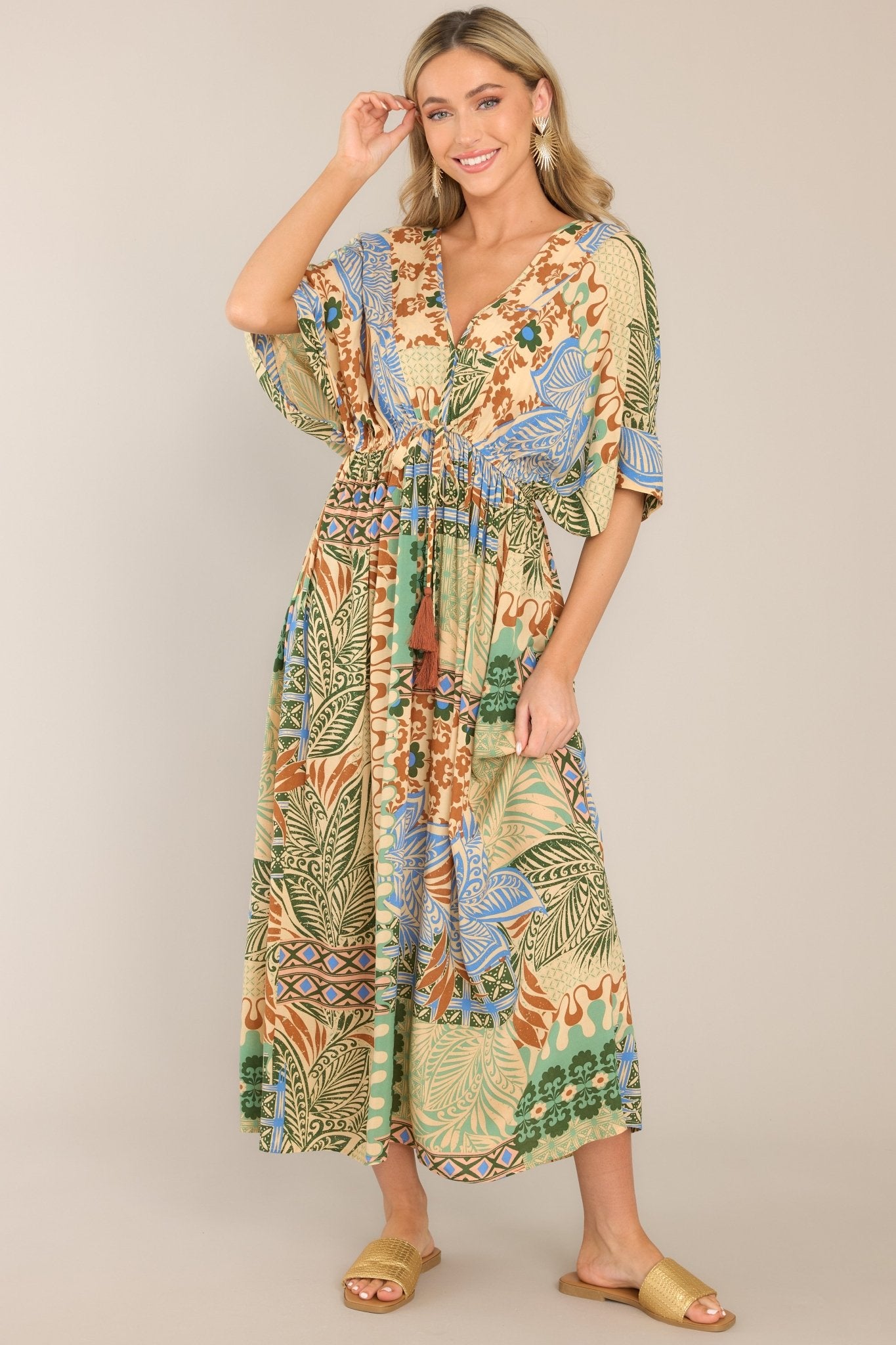 Get ready to be the life of the beach party with My Top Five Beige Tropical Print Maxi Dress. This dress features a playful tropical print that will make you stand out in every crowd. Its flowy maxi length is perfect for twirling on the beach, making it the perfect addition to your summer wardrobe!