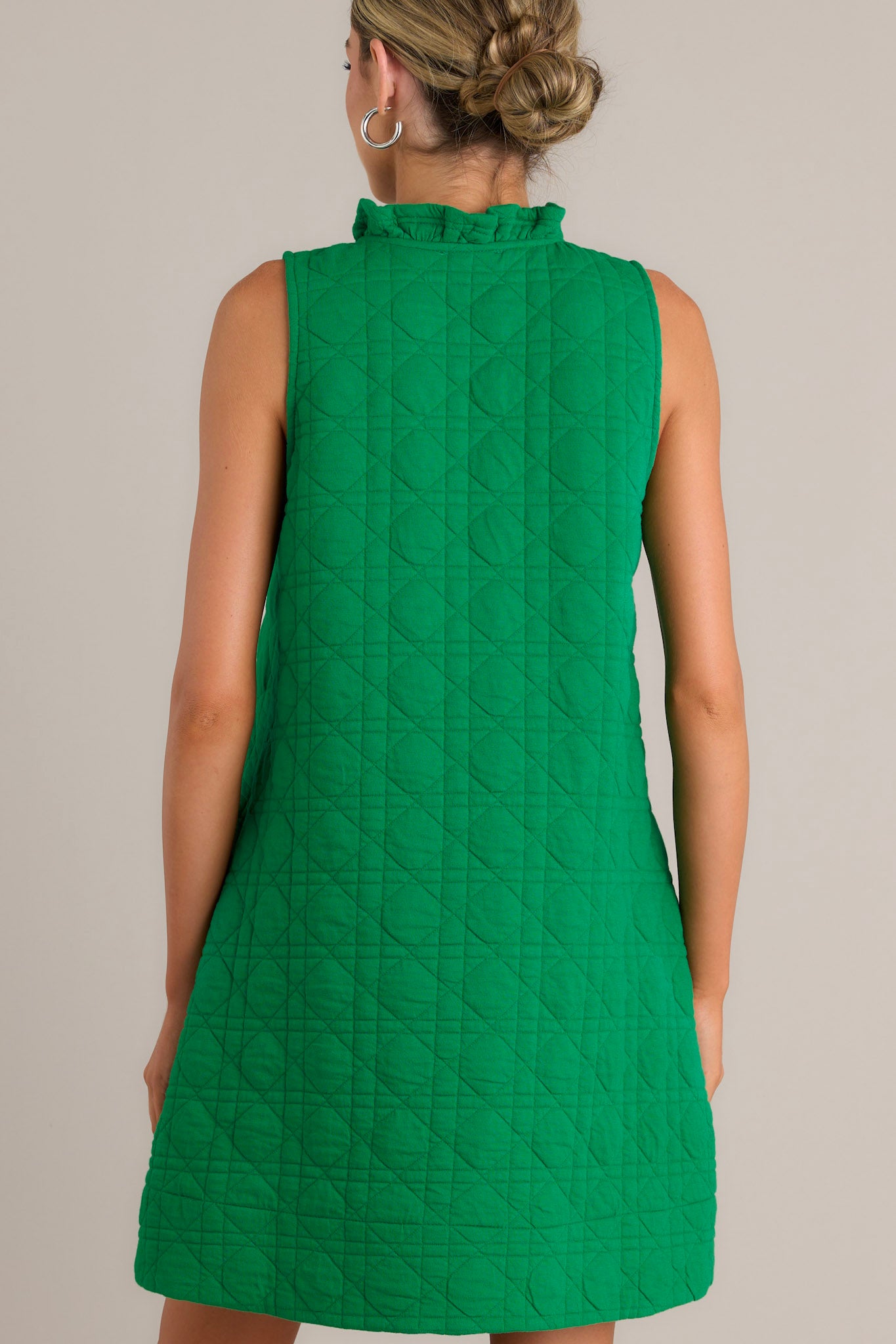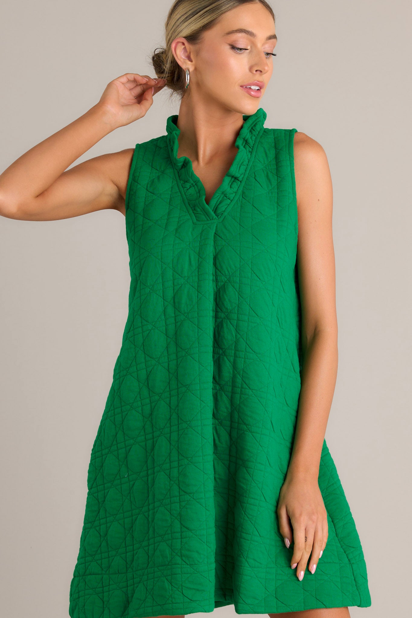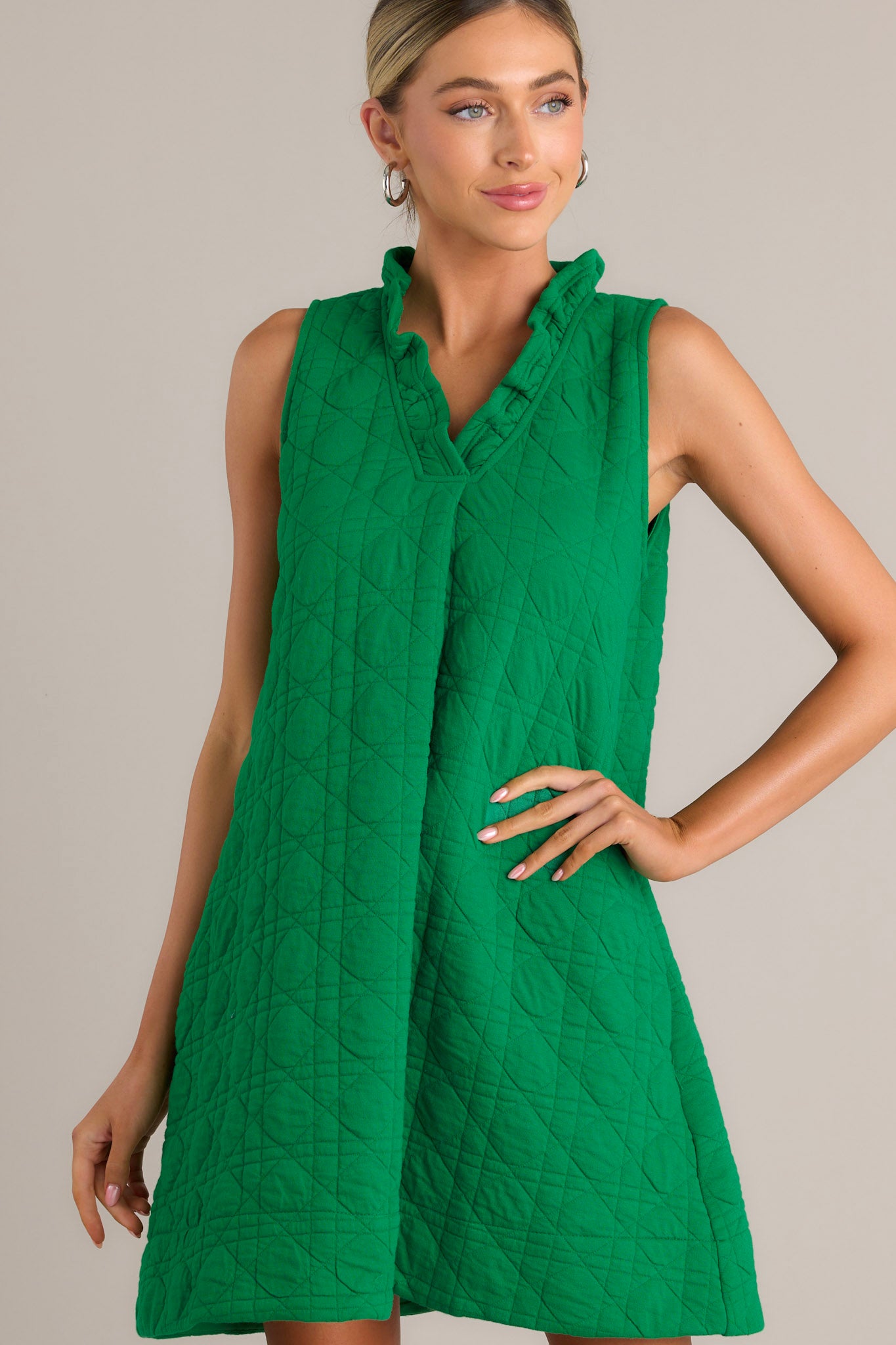 Get ready to dazzle in the Mystic Jewels Kelly Green Quilted Mini Dress! This playful and quirky dress features a bold green color with a unique quilted design that adds texture and dimension. The mini length and flattering silhouette make it perfect for a night out on the town. You'll receive compliments all night long! This green mini dress features a ruffled v-neckline, a unique quilted material, functional hip pockets, and a sleeveless design.