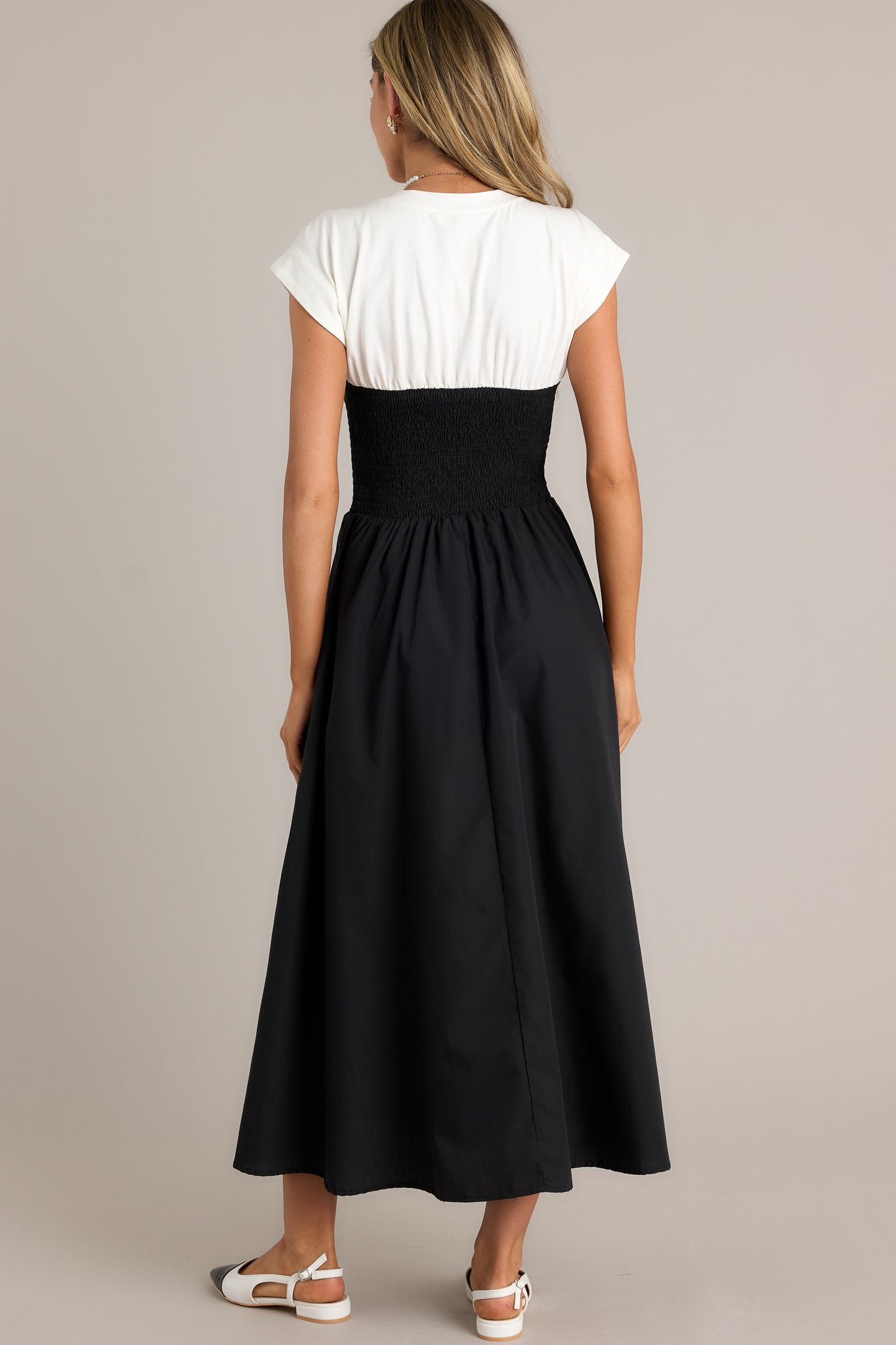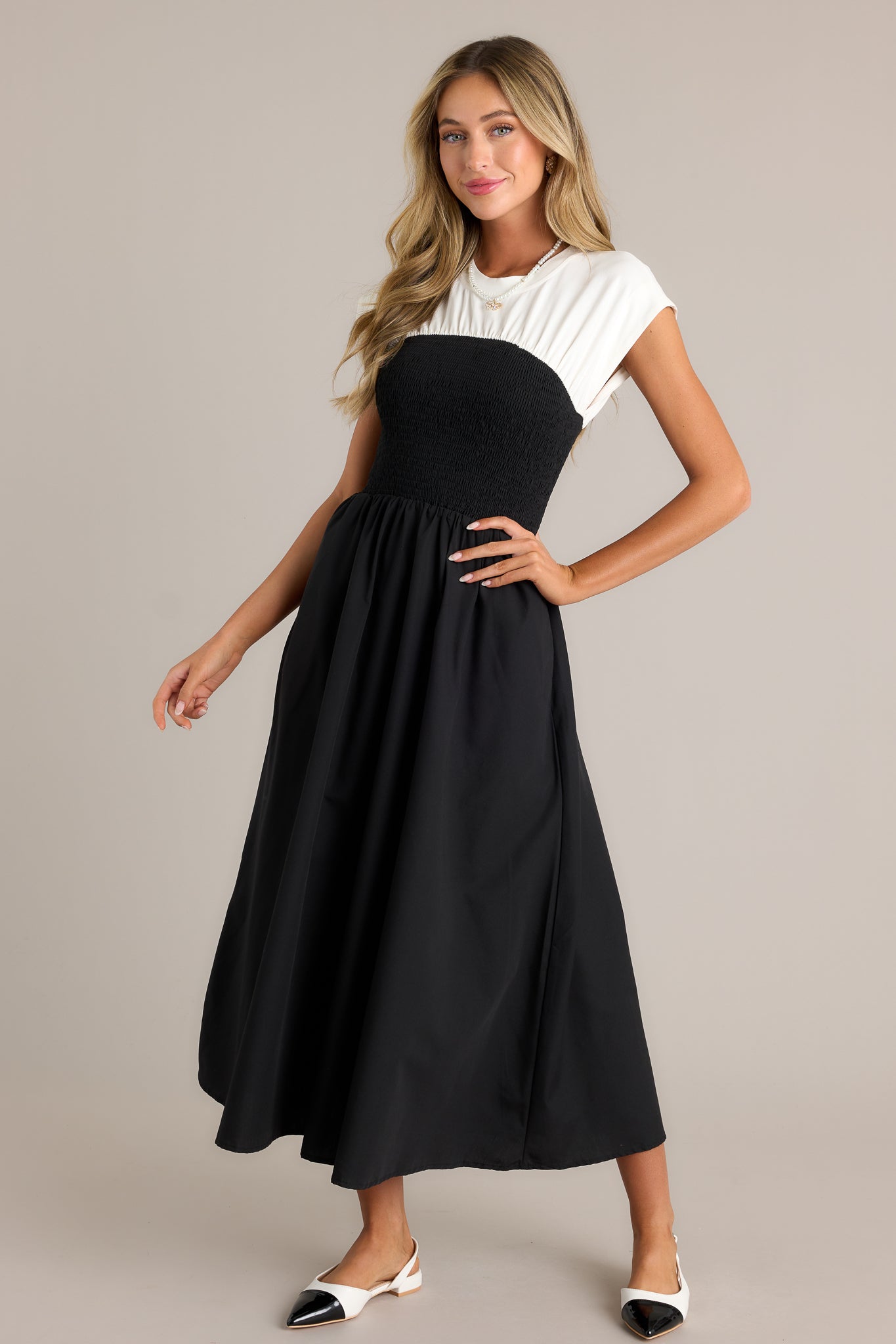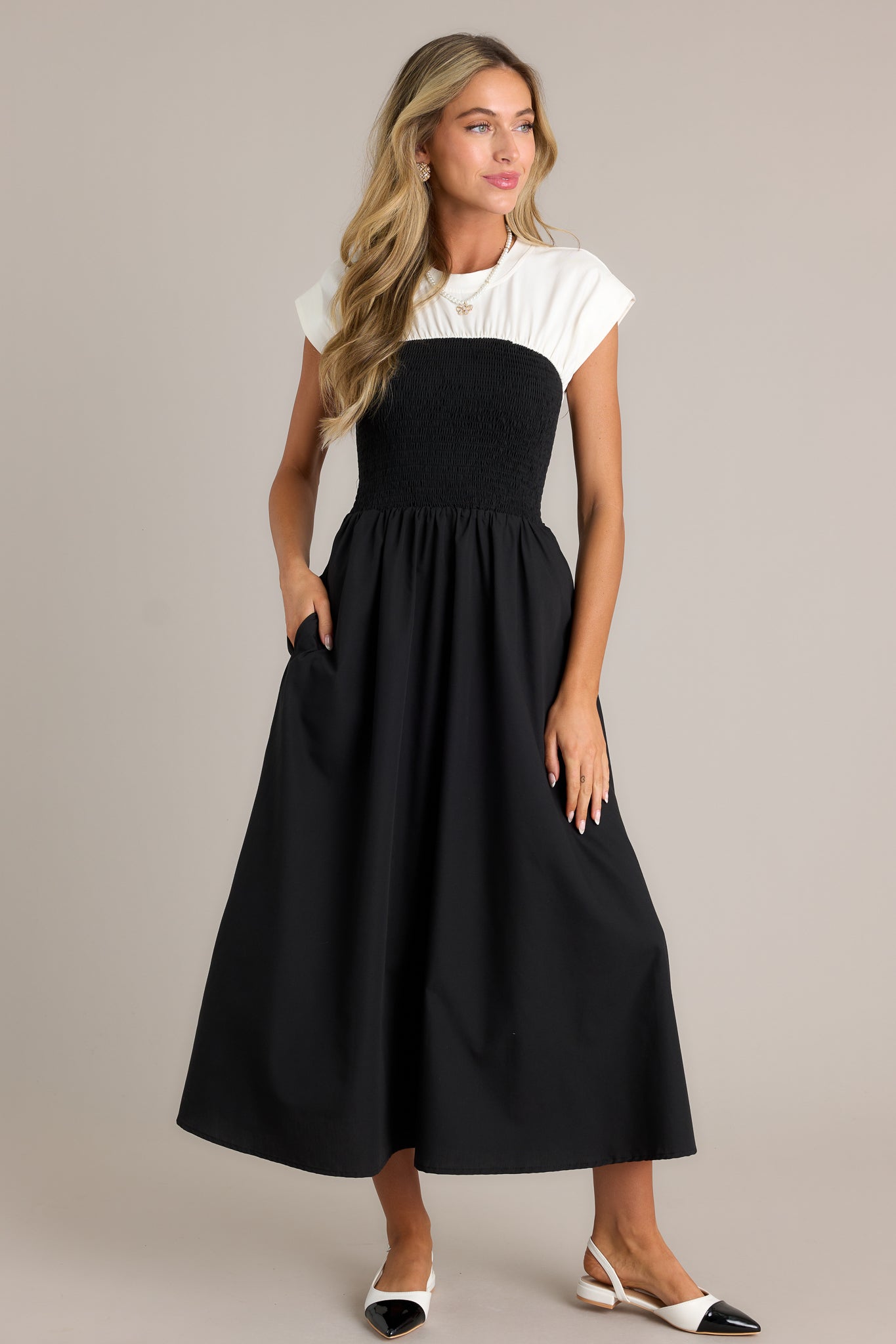 Steal the spotlight with the Never Disappear Black & White Smocked Midi Dress. Its smocked design ensures a flattering fit, while the black and white color combo adds a touch of chic sophistication. Perfect for any occasion, this dress will make you stand out (in a good way, of course). This black and white dress features a round neckline, a smocked waist, functional hip pockets, a white color blocked top and a flowing silhouette.