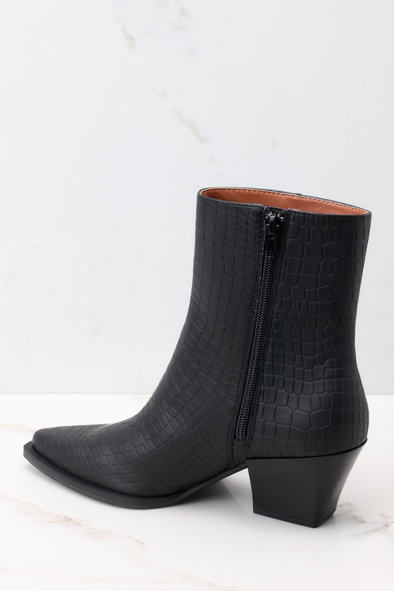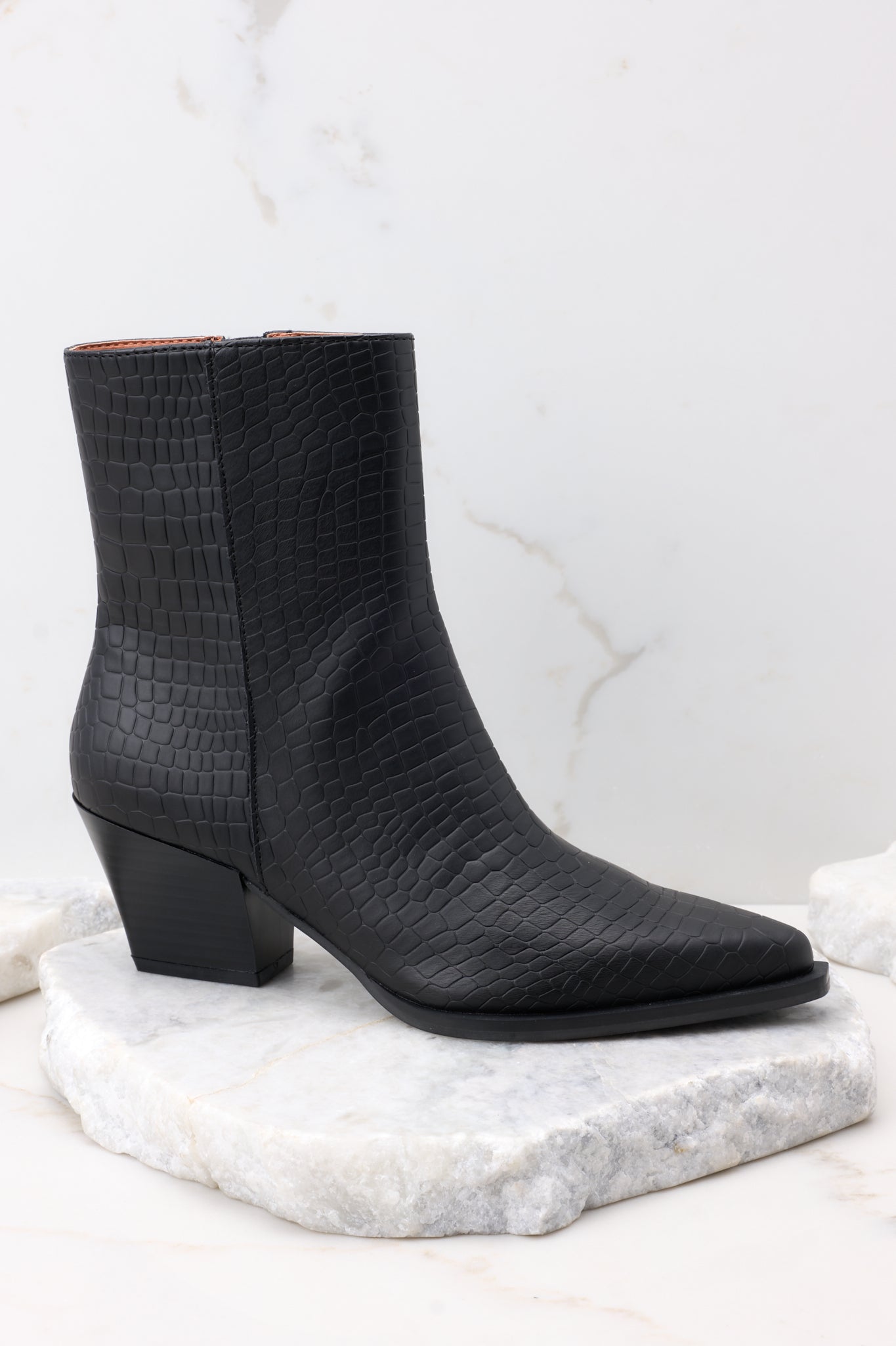 Be victorious in style with our Never Stop Fighting Black Boots! This chic, classic style is perfect for any occasion, while the low-key design will make sure everyone knows you’re ready for anything. Feel like you can conquer the world with every step! These boots feature a pointed toe, side zipper, textured snakeskin style faux leather, and a block heel. • Heel measures 2.75" • Leather upper, man-made sole • Non-skid sole • Imported • Runs narrow • Wider feet size up