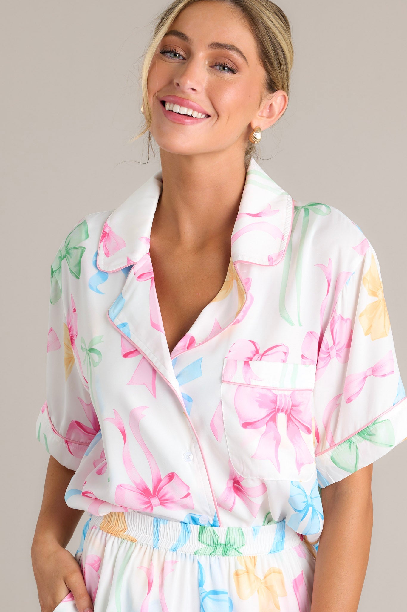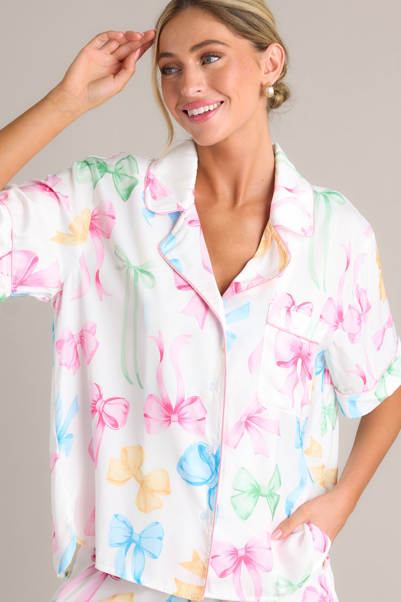 Get ready for a stylish and comfortable night's sleep with our Nightly Necessities White Multi Bow Pajama Top! Made with soft and breathable material, you'll drift off into dreamland feeling cozy and chic. This white pajama top features a notched lapel collared neckline, a chest pocket, a full button front, a fun multi color bow print, and a split hemline.