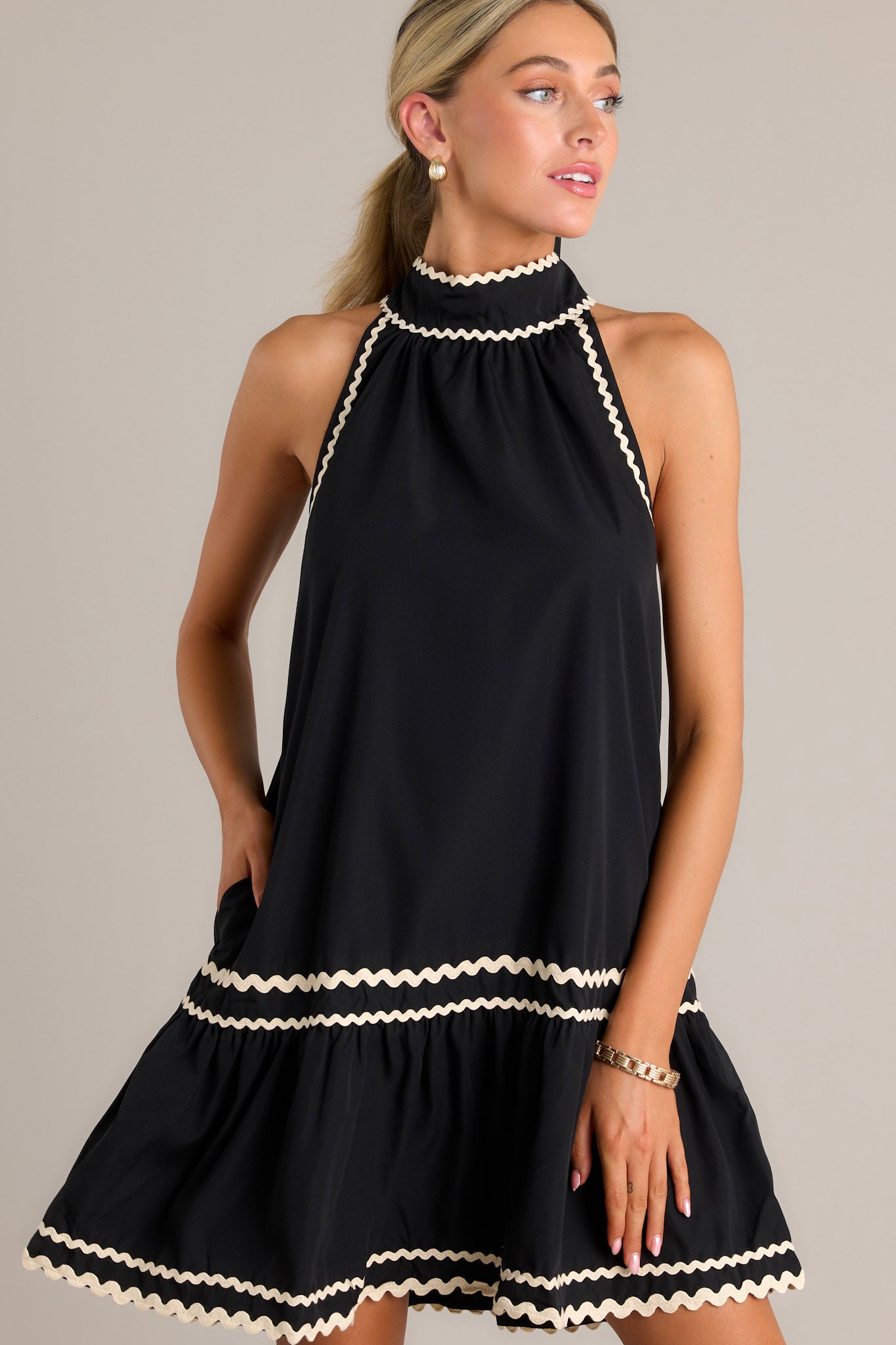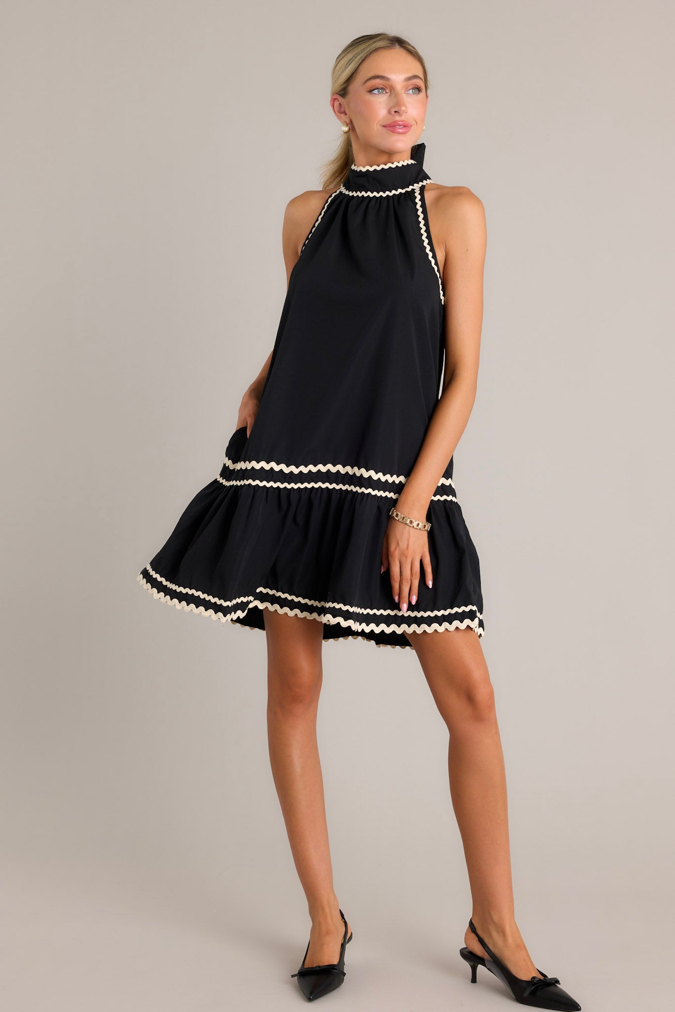 Unleash your inner enchantress with our Noir Enchantment Black Ricrac Mini Dress! This unique piece features playful ricrac trim and a mini length, perfect for adding a touch of whimsy to any occasion. Show off your quirky side in this dress, and make a statement wherever you go! This black midi dress features a high self-tie neckline with a keyhole cutout, ivory ricrac detailing throughout, functional hip pockets, a single tier, a ricrac hemline, and a sleeveless design.