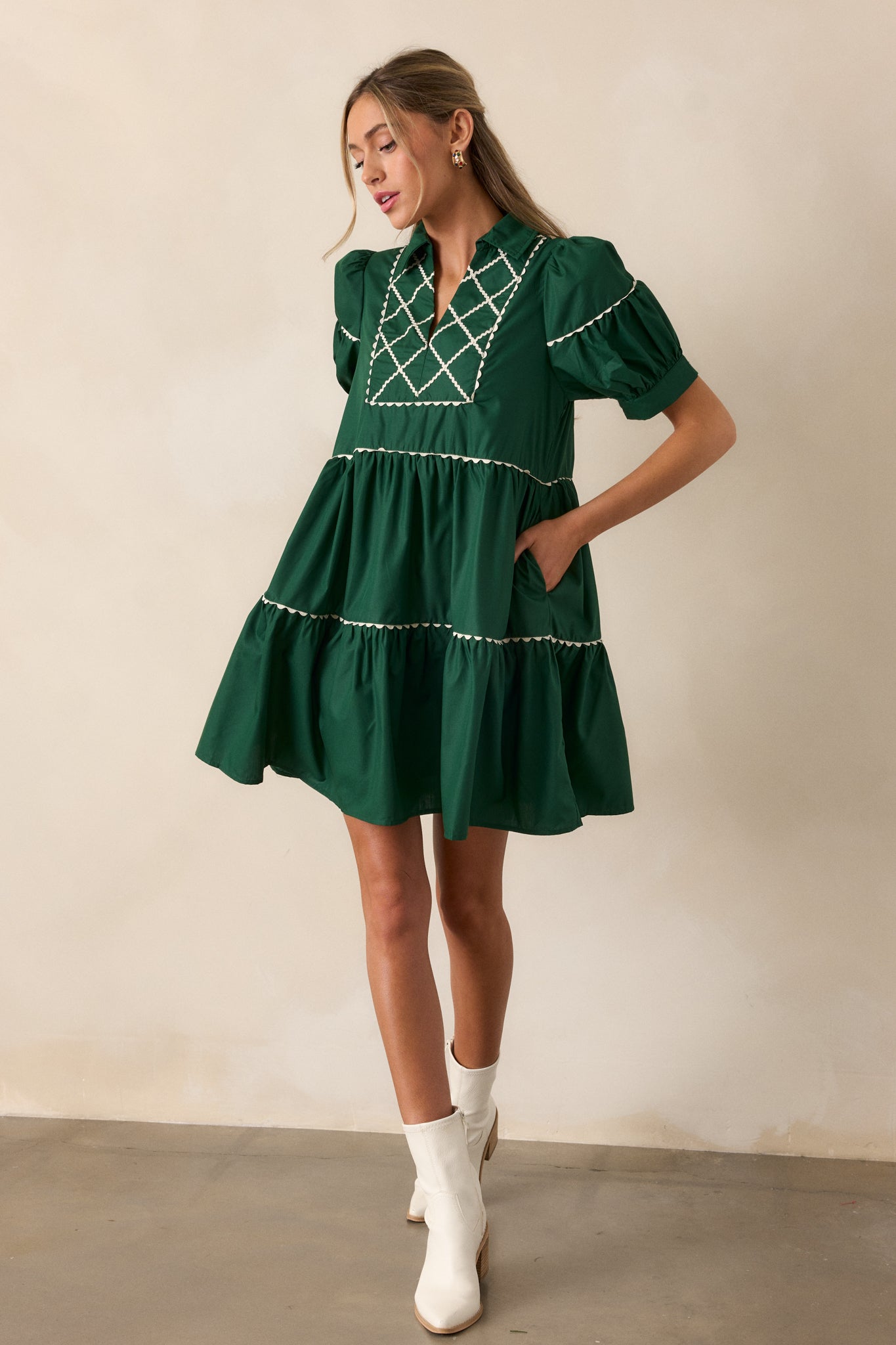 Get ready to make a stylish statement with the Now Or Never Emerald Puff Sleeve Mini Dress. This dress is perfect for adding a touch of glamour to any occasion. Don't miss out on this must-have dress that will elevate your wardrobe. This emerald dress features a collared split neckline, white cross stitch yoke detailing, white scalloped hem detailing, a tiered design, and puff sleeves.