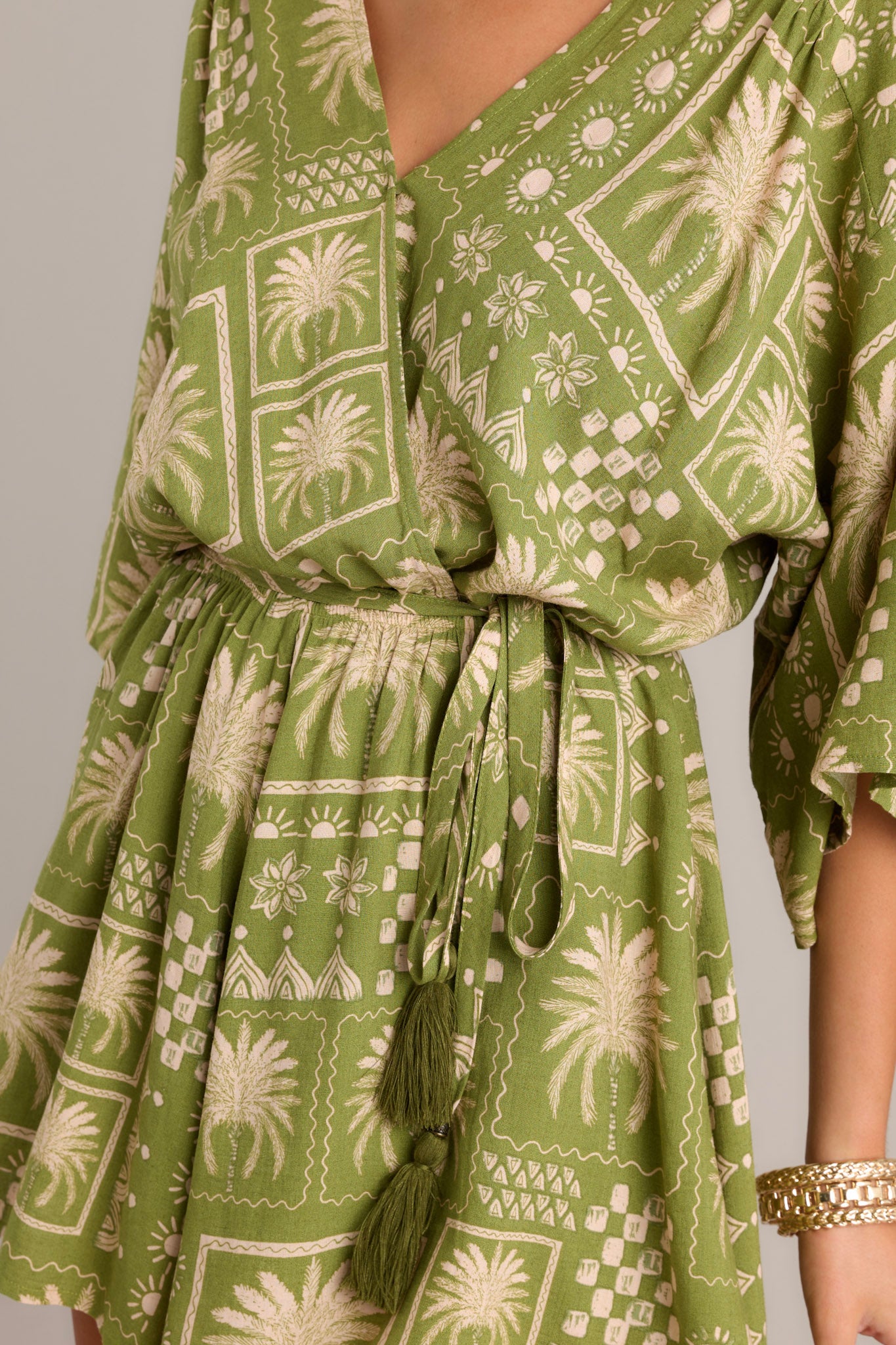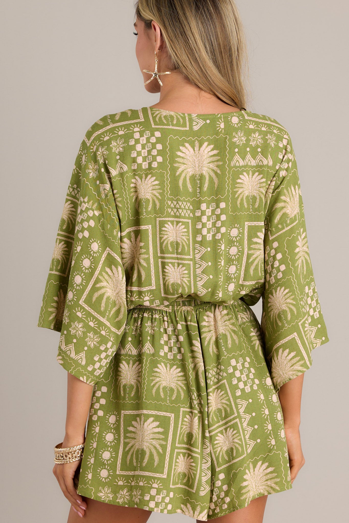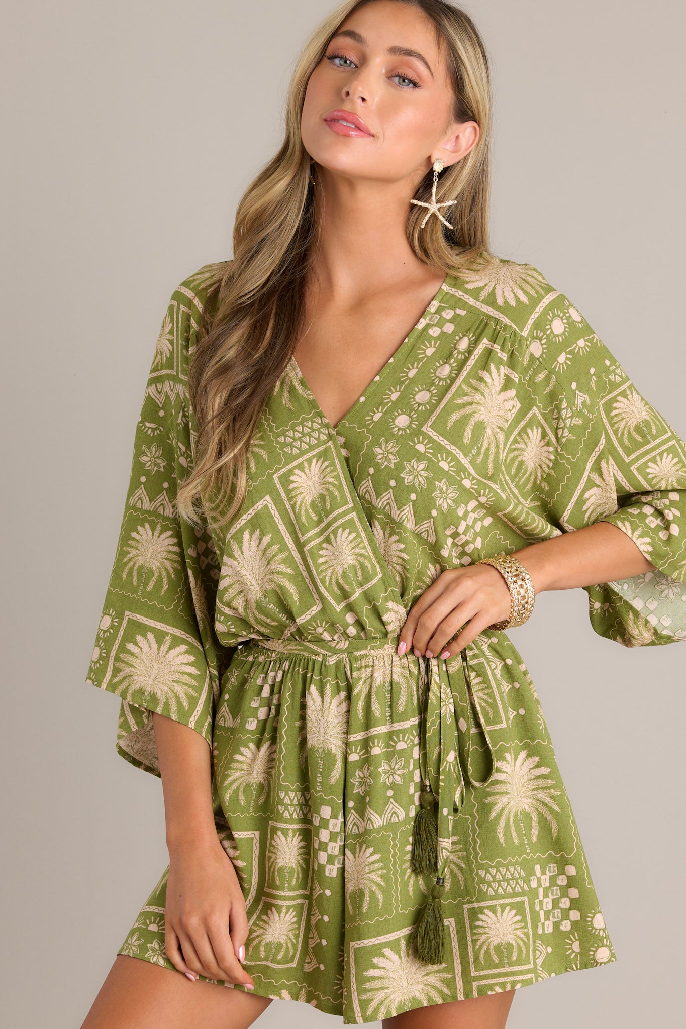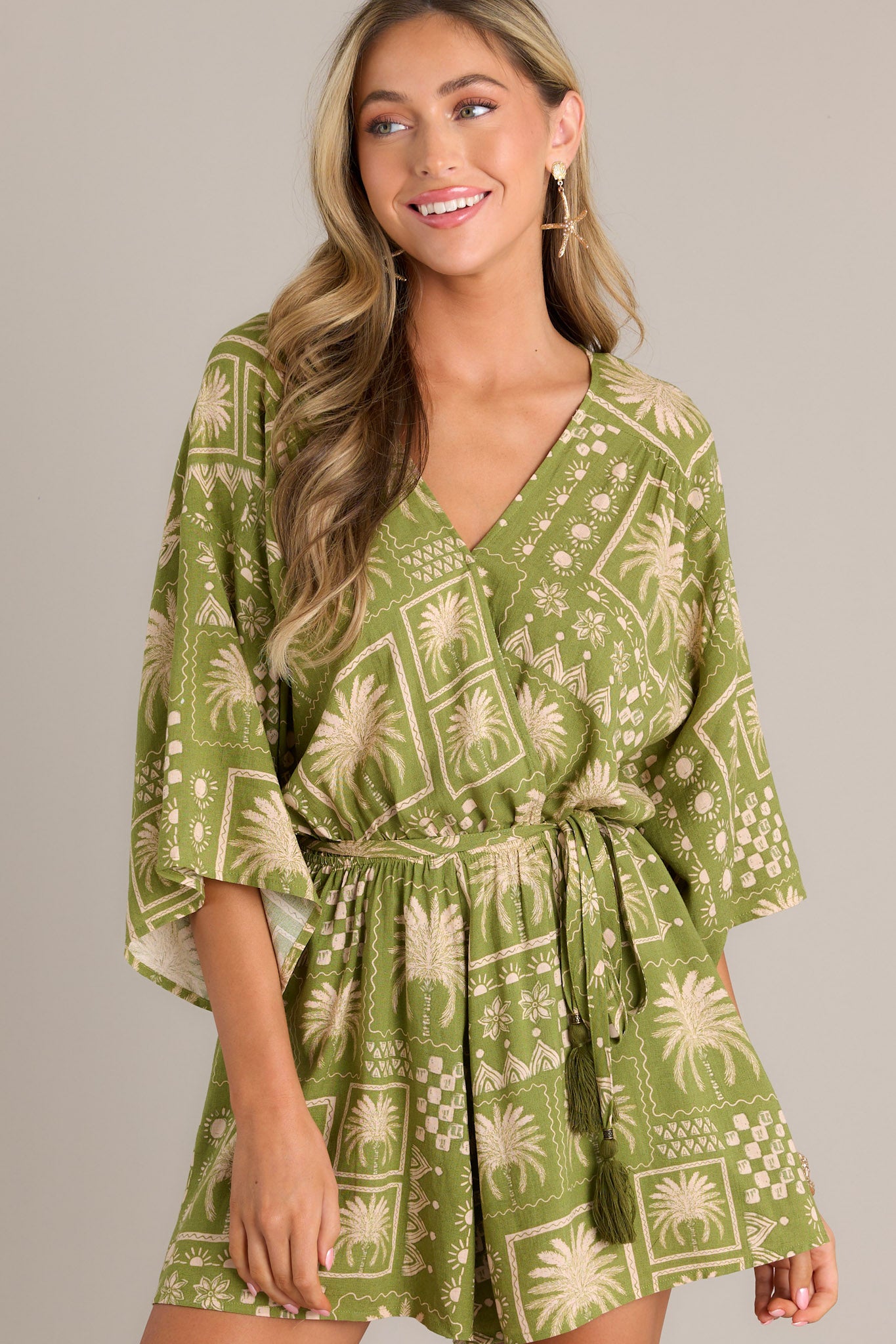 Get ready to be whisked away to paradise with our Oasis Dream Green Tropical Print Romper! This playful one-piece features a vibrant tropical print that will make you feel like you're on vacation. Made from soft and breathable fabric, it's perfect for warm summer days. No travel required! This green romper features a v-neckline, a functional snap button closure, an elastic waistband, a self-tie belt, and quarter length dolman sleeves.