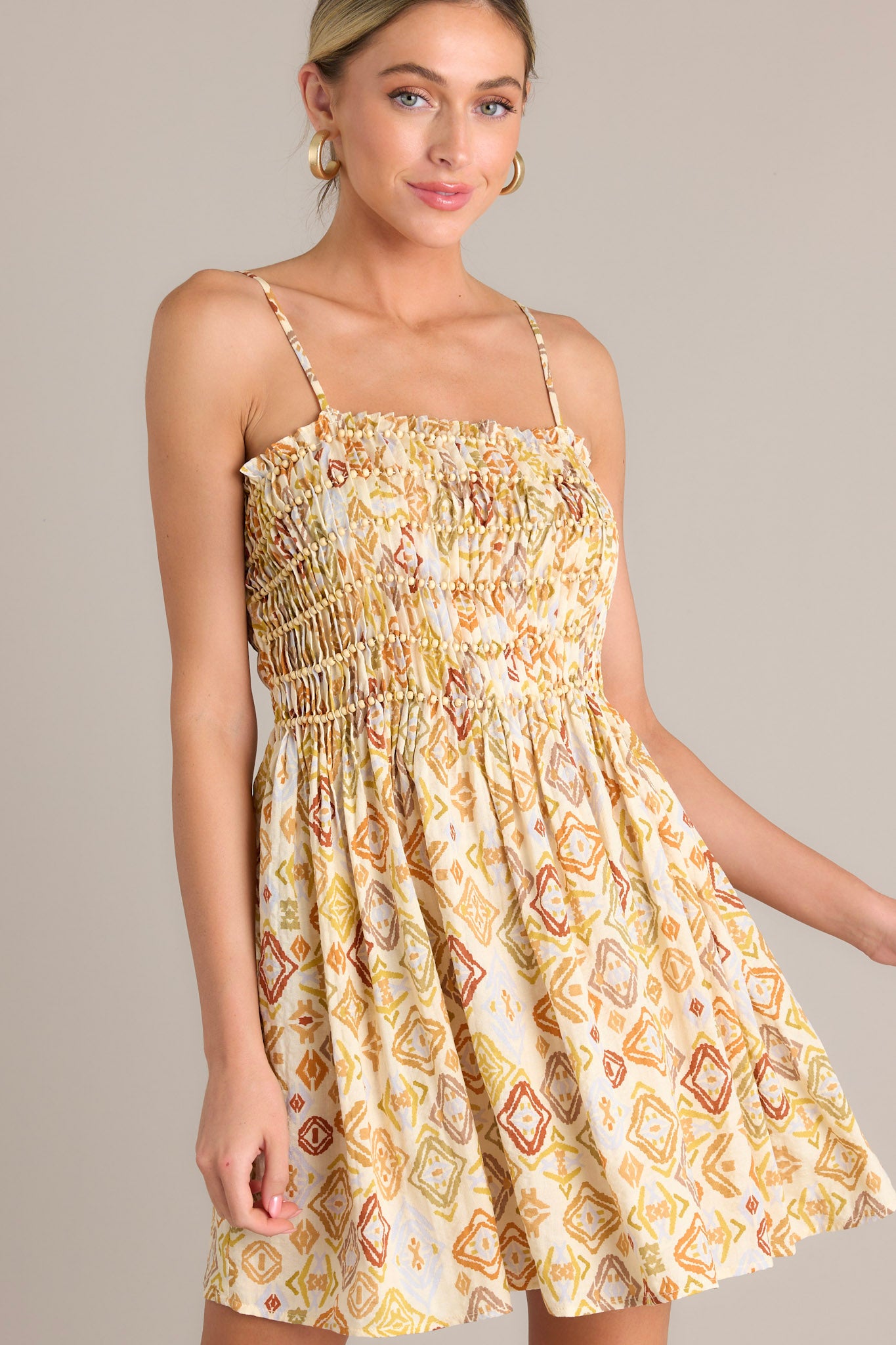 Go with the flow in the Oceanic Opulence Beige Multi Print Mini Dress. With a unique print and a flowy fit, this dress is perfect for a day by the beach or a night out. Be the life of the party in this quirky, playful dress. This beige mini dress features a square neckline, thin adjustable straps, a fully smocked pleated bodice with beaded detailing, and a flowing skirt.
