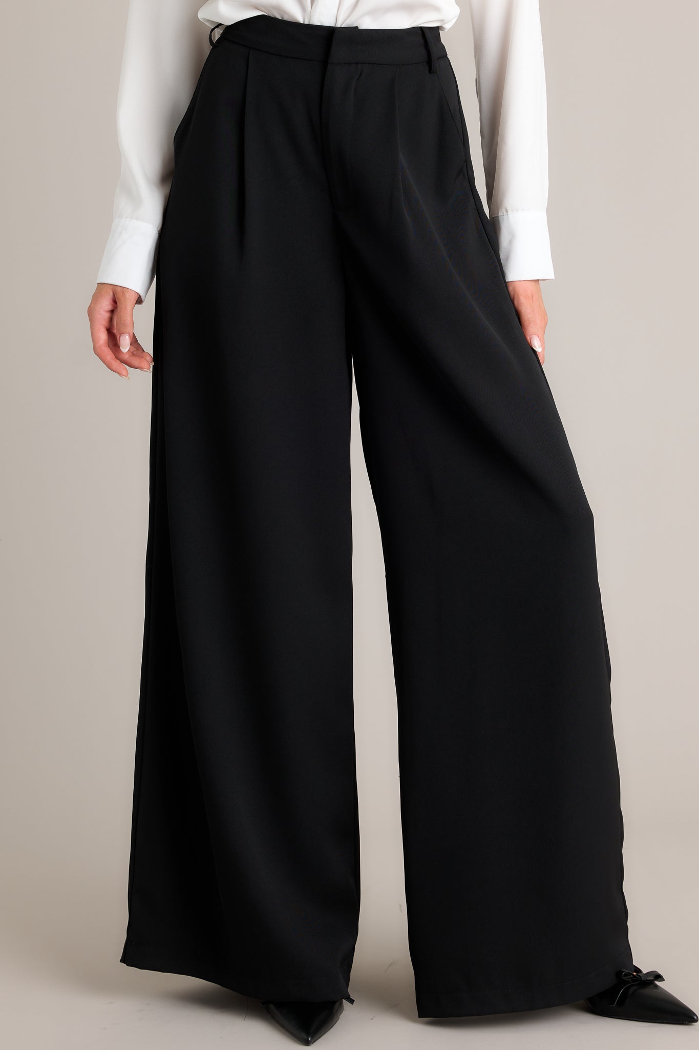 Be the talk of the office in these Office Chic Black Pants! Show 'em who's boss while flaunting your fashion in these timeless versatile black trousers - guaranteed to keep you chic and professional for any occasion. Look effortless when you step into the office. These black pants feature a high waist fit, a hook and bar closure, belt loops, pockets, and a wide leg.