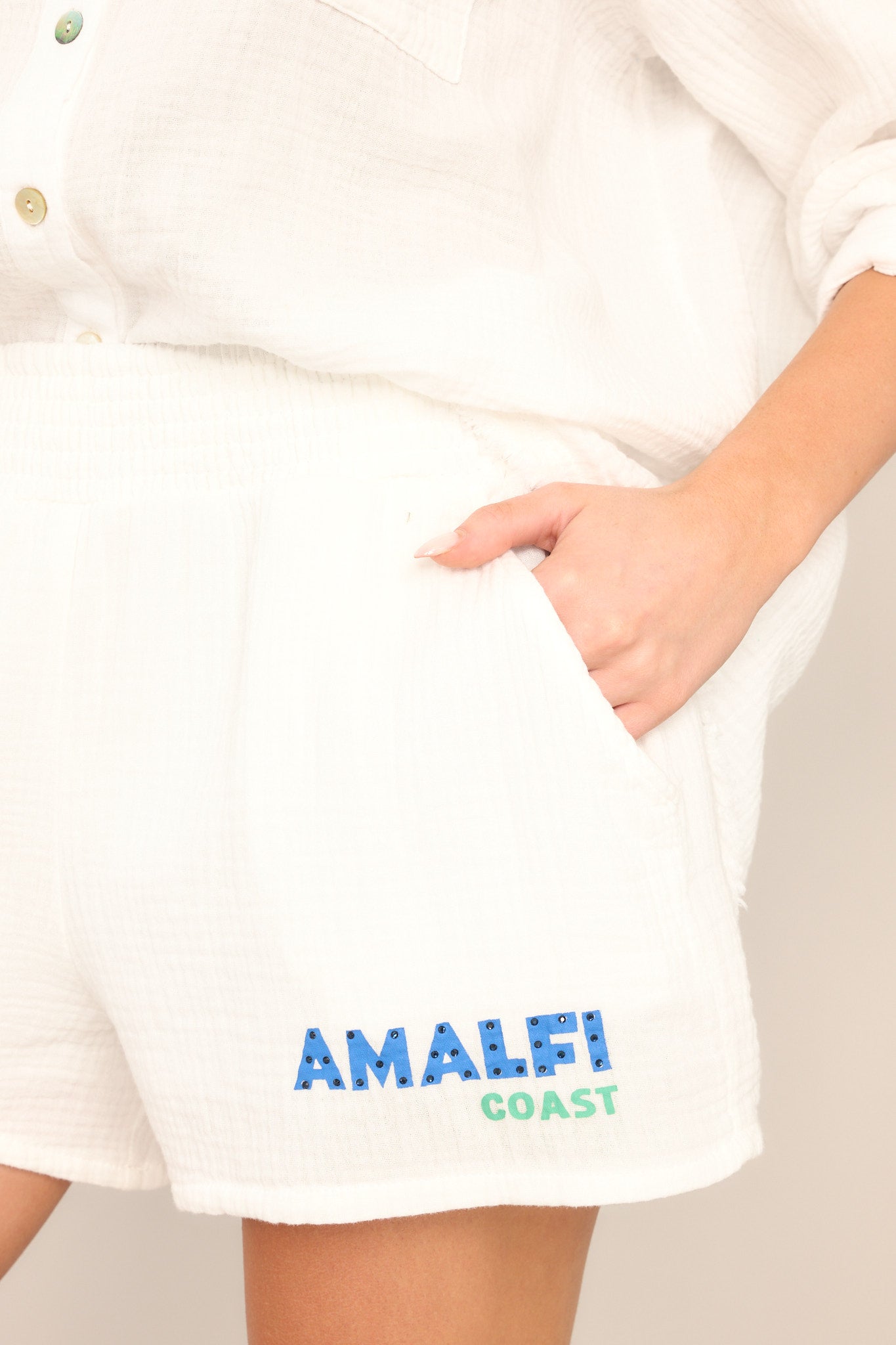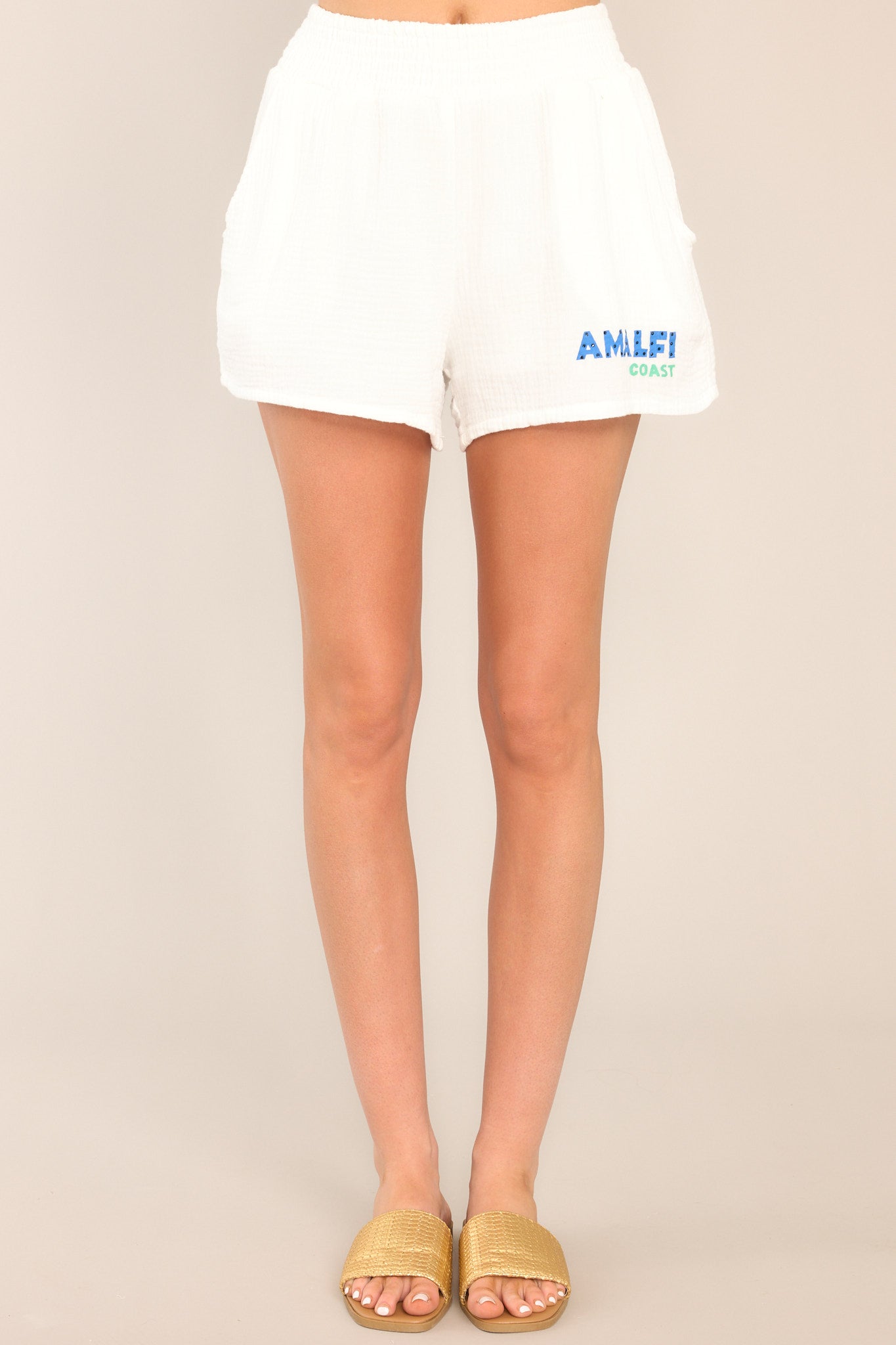 Go with the flow in our On The Coast White Gauze Shorts. These lightweight shorts are perfect for a day at the beach or a casual summer outing. The loose, airy fit will keep you cool in the summer sun. Don't miss out on these versatile and comfortable shorts! These shorts feature a high waisted design, a smocked elastic waistband, functional pockets, and colorful rhinestone wording.