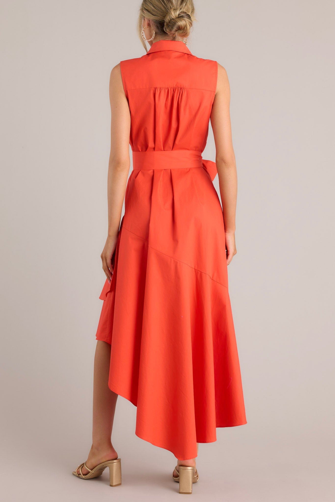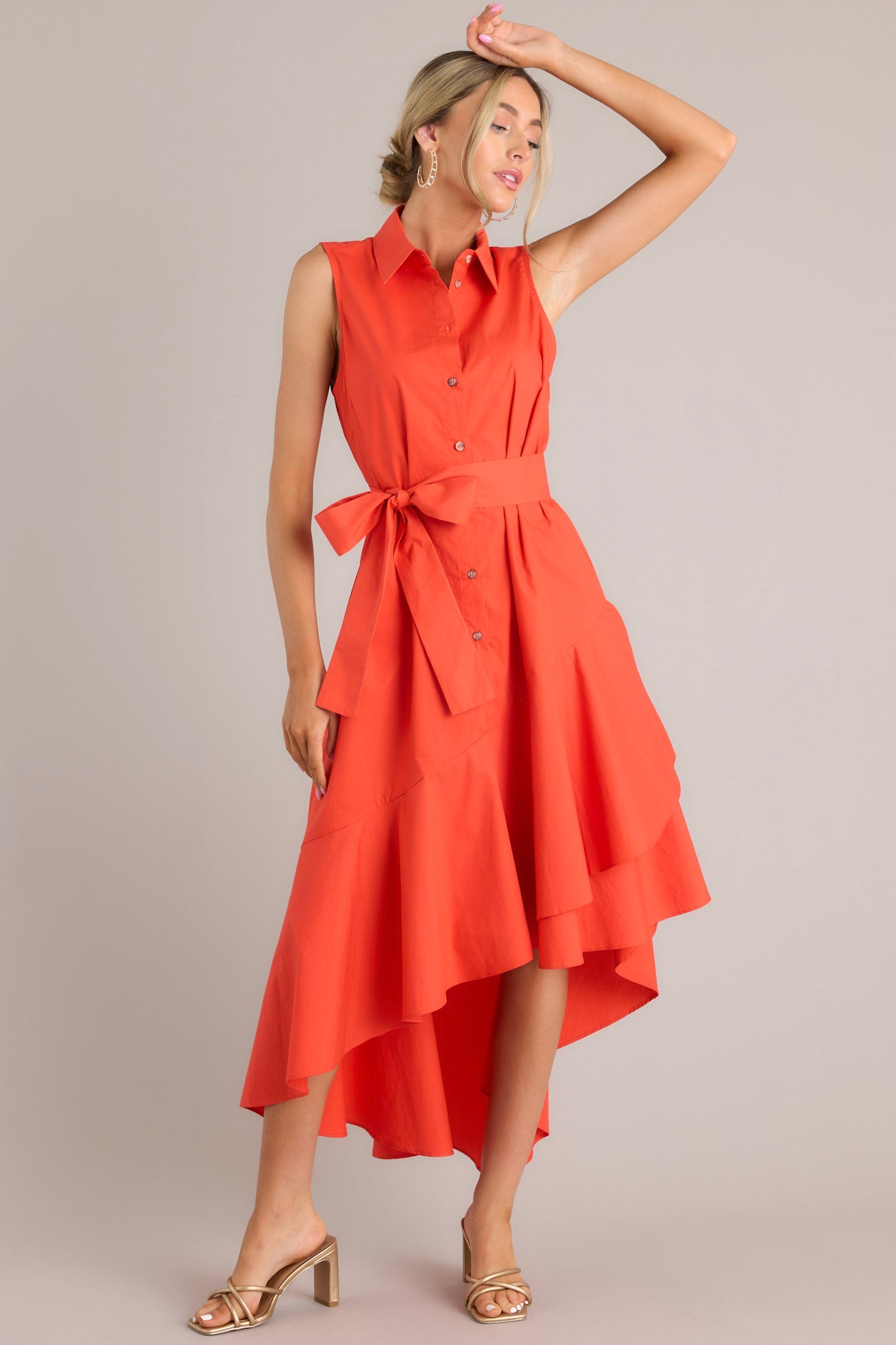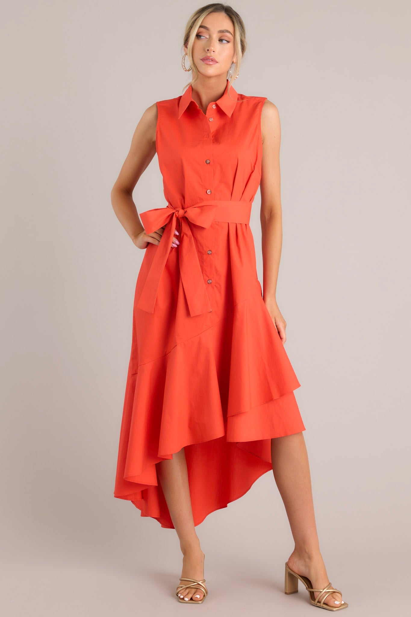 Say goodbye to fashionably late and hello to always on time with our On Time Tomato Red Asymmetrical High Low Dress! With its bold tomato red color and unique asymmetrical design, you'll be sure to make a statement at any event. Perfect for those who like to stand out from the crowd in a fun and playful way! This tomato red shirt dress features a collared neckline, a functional button front, a self-tie waist belt, and a layered asymmetrical hemline.