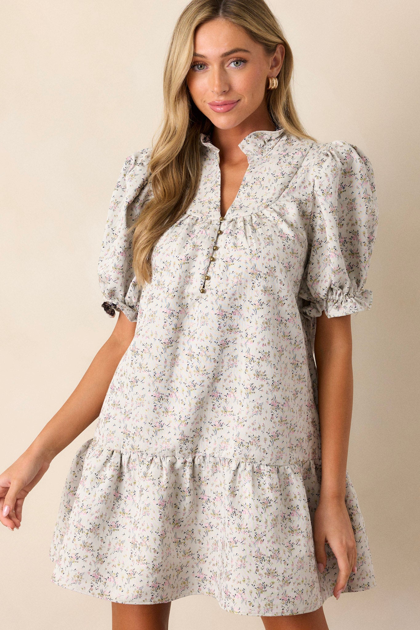 Get ready to turn heads in our Open Path Almond Floral Puff Sleeve Mini Dress! With its beautiful floral print and on-trend puff sleeves, this dress is the perfect combination of elegance and style. It's perfect for any occasion. Pair with your favorite heels for a stunning look. This almond floral dress features a ruffle collared neckline, a split neckline with a functional button up bust, a soft quilt texture, a small floral pattern, a tiered design, a ruffled trim and short elastic cuffed puff sleeves.