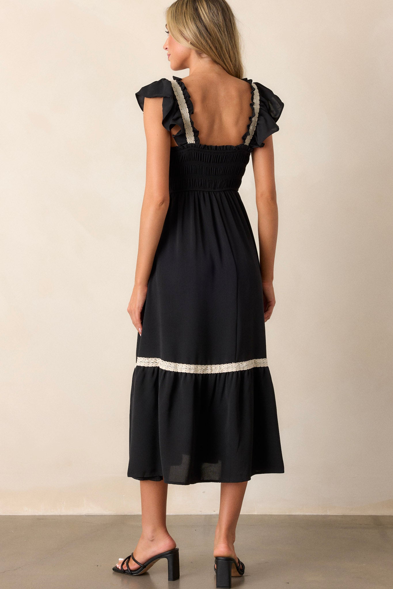 This Black Smocked Midi Dress is perfect for your next outing! The smocked bodice and flowy skirt are designed to flatter your figure, while the midi length adds an elegant touch. The lightweight fabric ensures comfort and style all day long, making it a must-have in your wardrobe. This black dress features a smocked bodice, a square neckline, a tiered design, white lace detailing on the sleeves and trim on the tier and short ruffle sleeves.