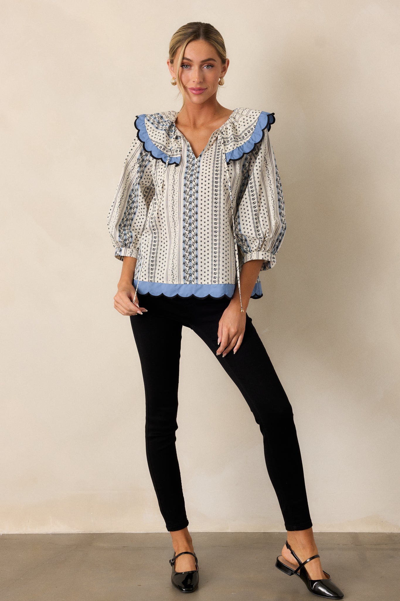 Keep your style in full bloom with our Pay Attention 100% Cotton Ivory Floral Scallop Hem Top. Made with soft and breathable cotton, this white top will have you feeling fresh and fabulous all day. Perfect for any occasion, this top is a must-have for any fashion-forward wardrobe. This ivory top features a scallop collar neckline, 3/4 length cuffed sleeves, a floral stripe print, and a scallop bottom hem.