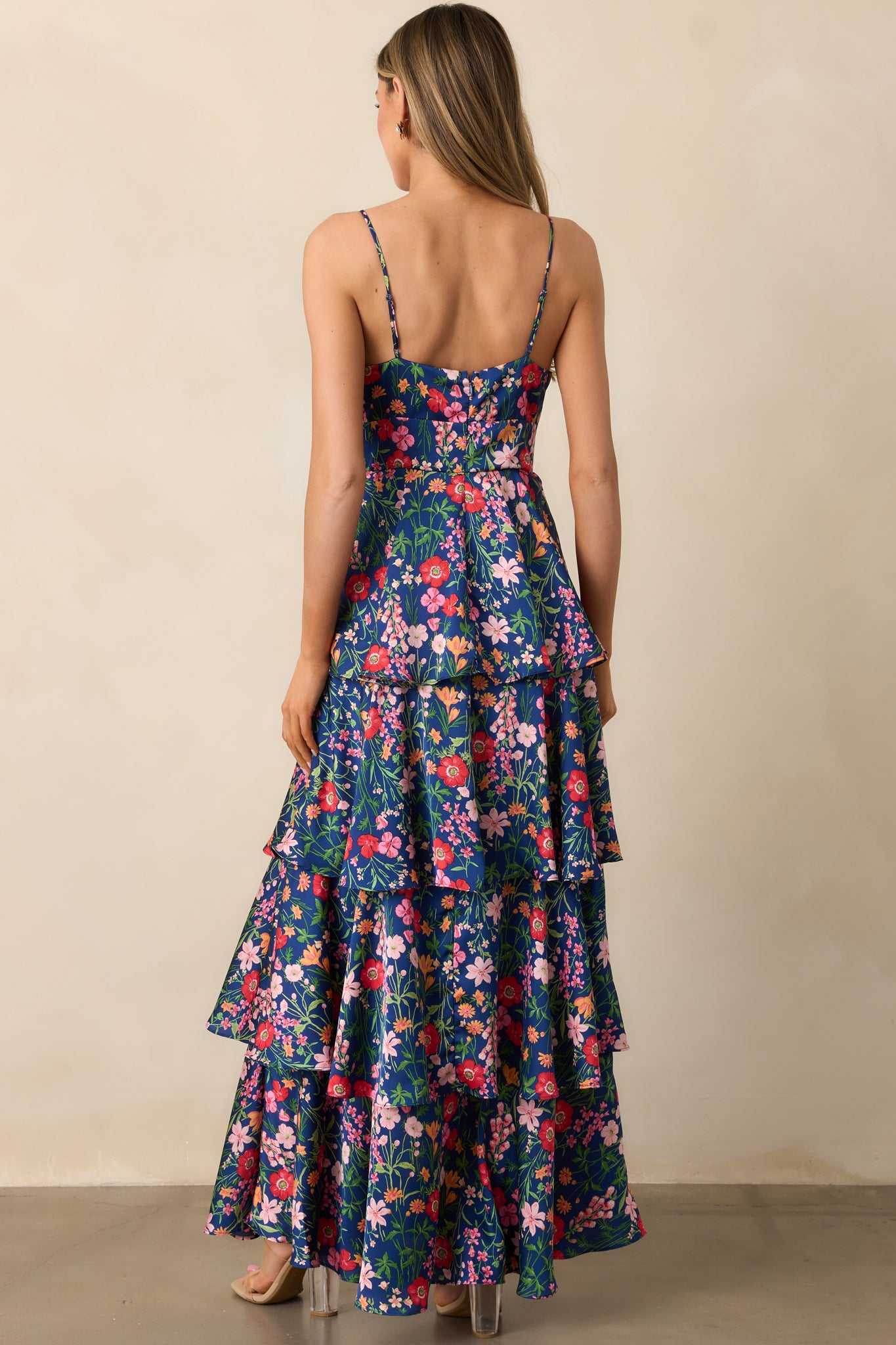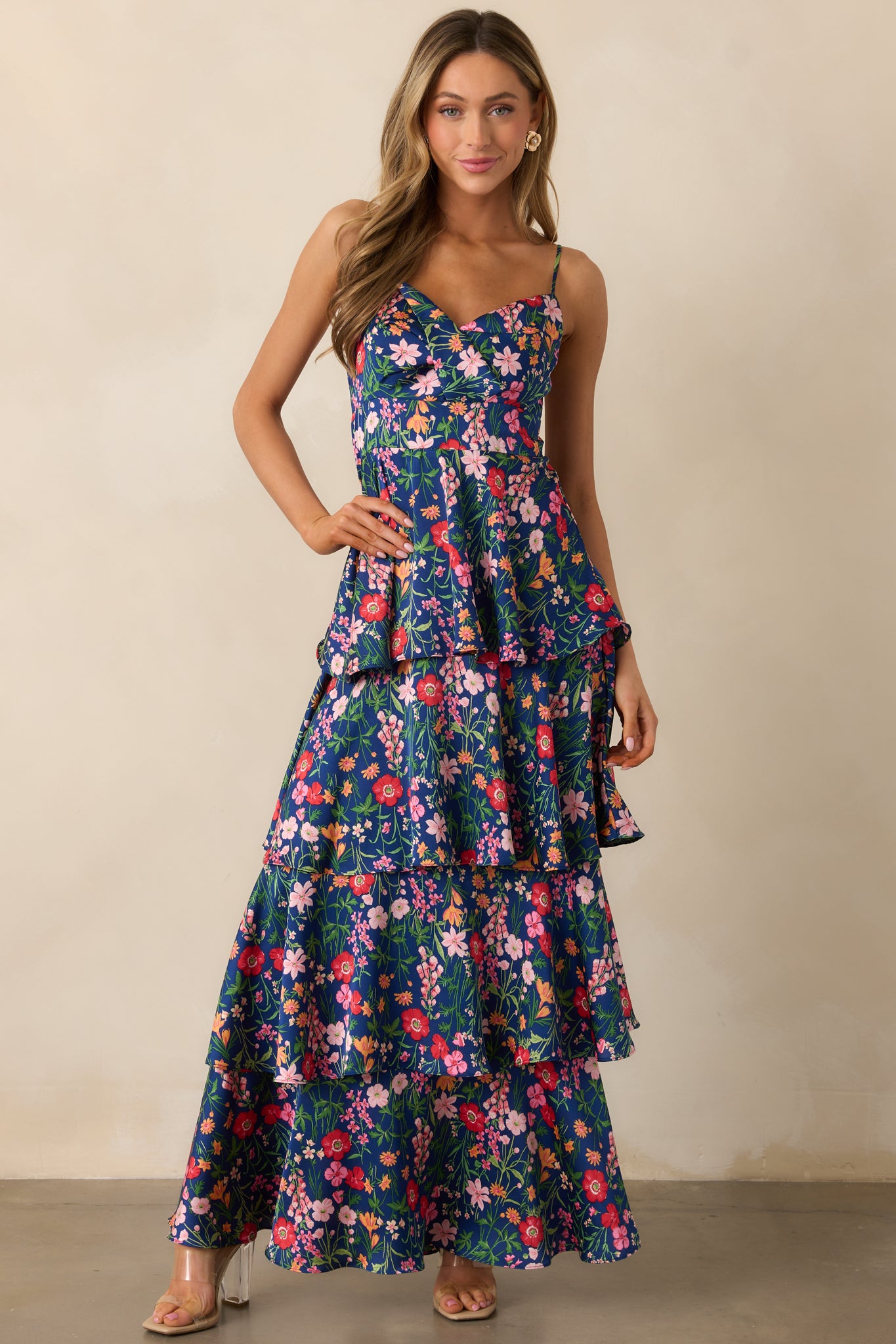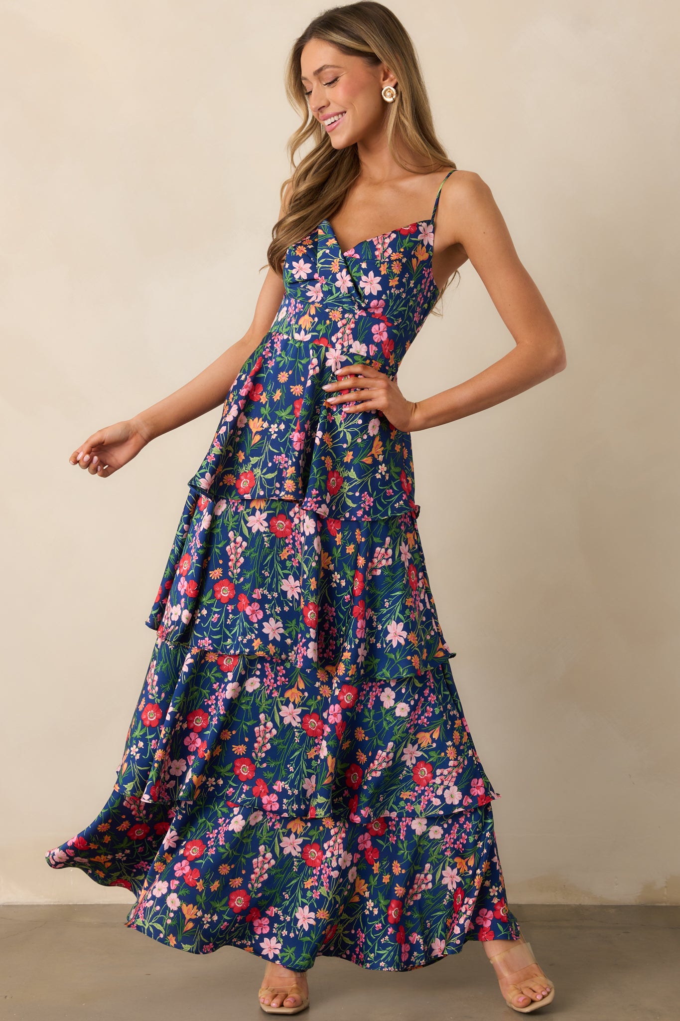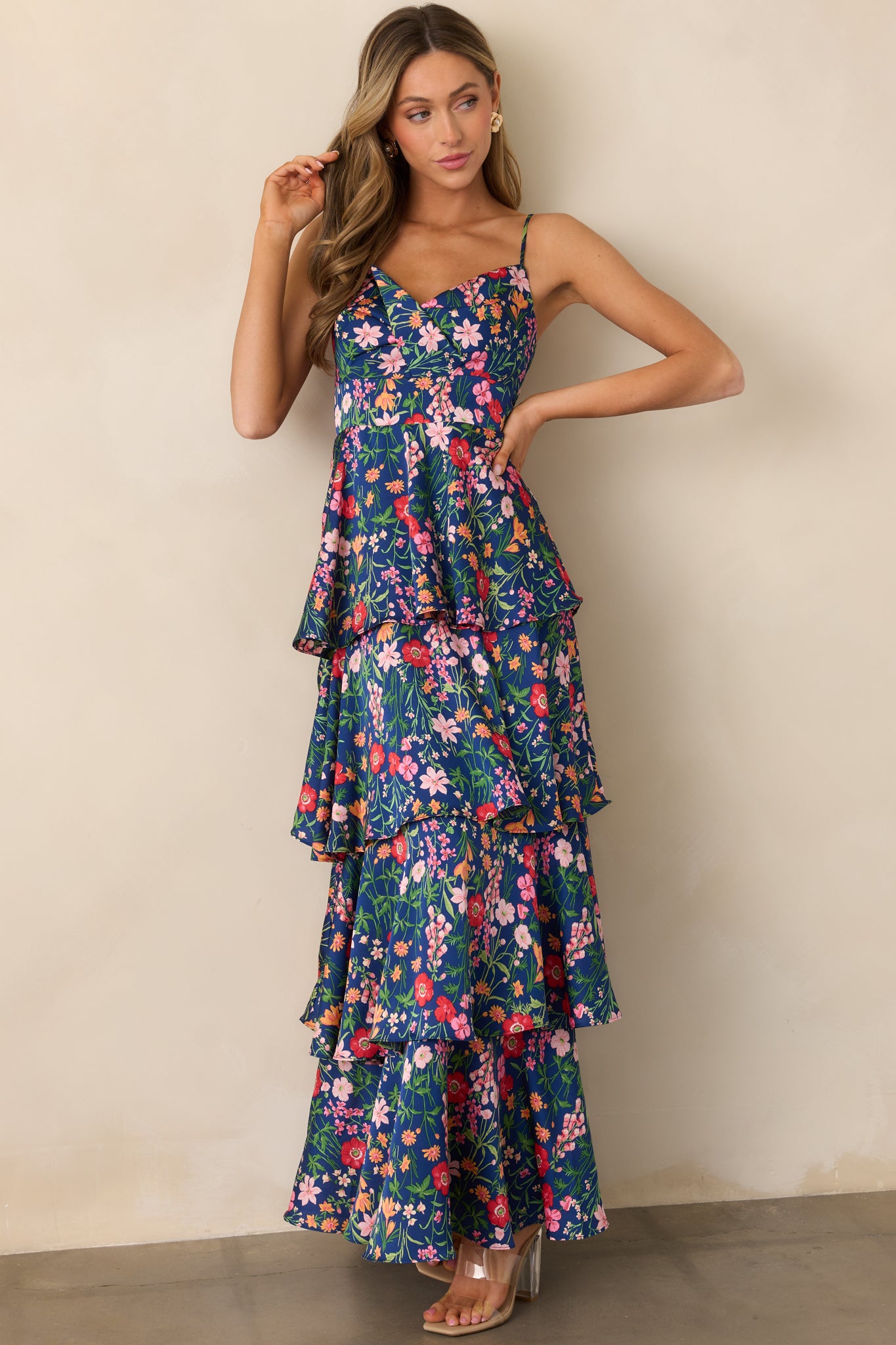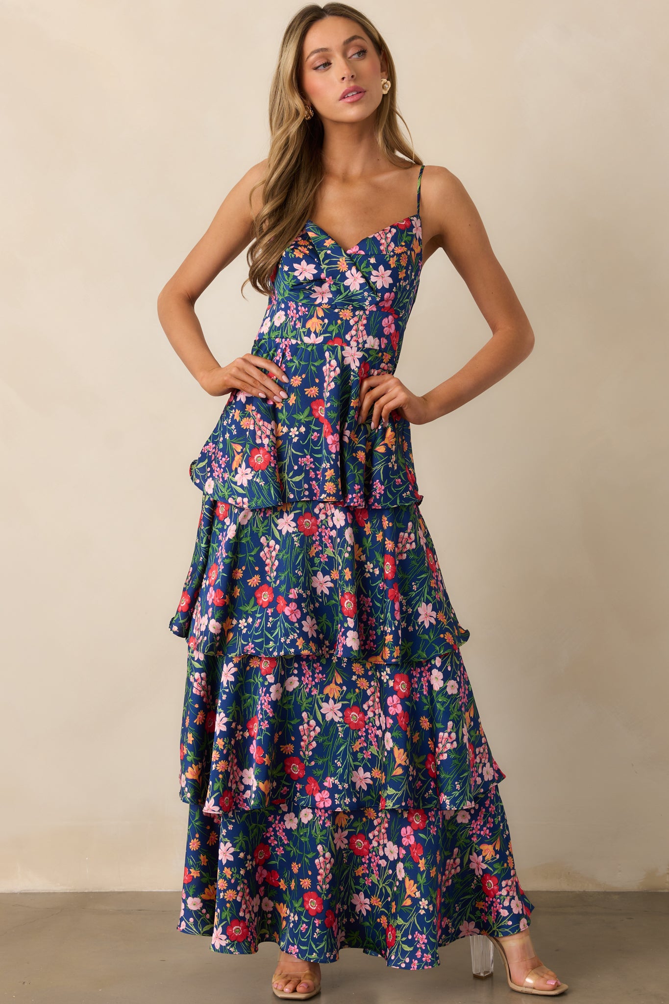 Make a statement in the Petal Parade Navy Floral Tiered Maxi Dress. This stunning piece is perfect for formal events or special occasions, offering a dramatic and elegant look. Its tiered design and beautiful floral print create a sophisticated silhouette, ensuring you stand out with poise and confidence. This navy dress features a pink floral print, a v-neckline, adjustable spaghetti straps, a tiered skirt, and a hidden back zipper.