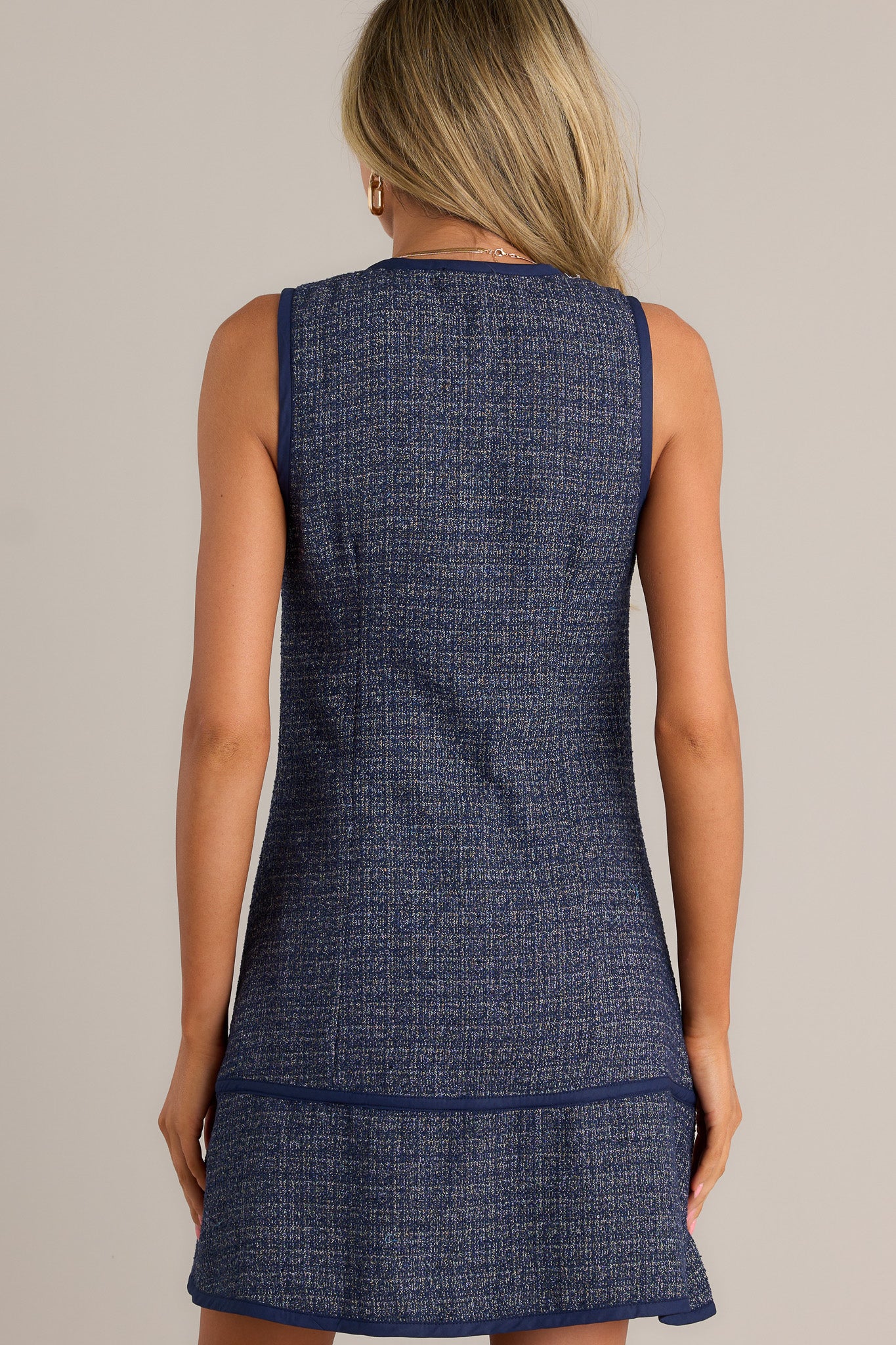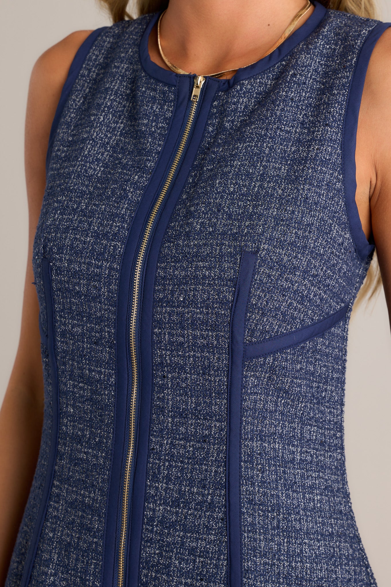 Unleash your inner posh with our Posh Perfection Navy Tweed Mini Dress! Its zip front design adds a touch of chic while the tweed material keeps you looking fabulous. Perfect for any occasion, this dress is a must-have in your wardrobe. This navy mini dress features a high crew neckline, a functional zipper front, thick front seams, a tweed material, and a sleeveless design.