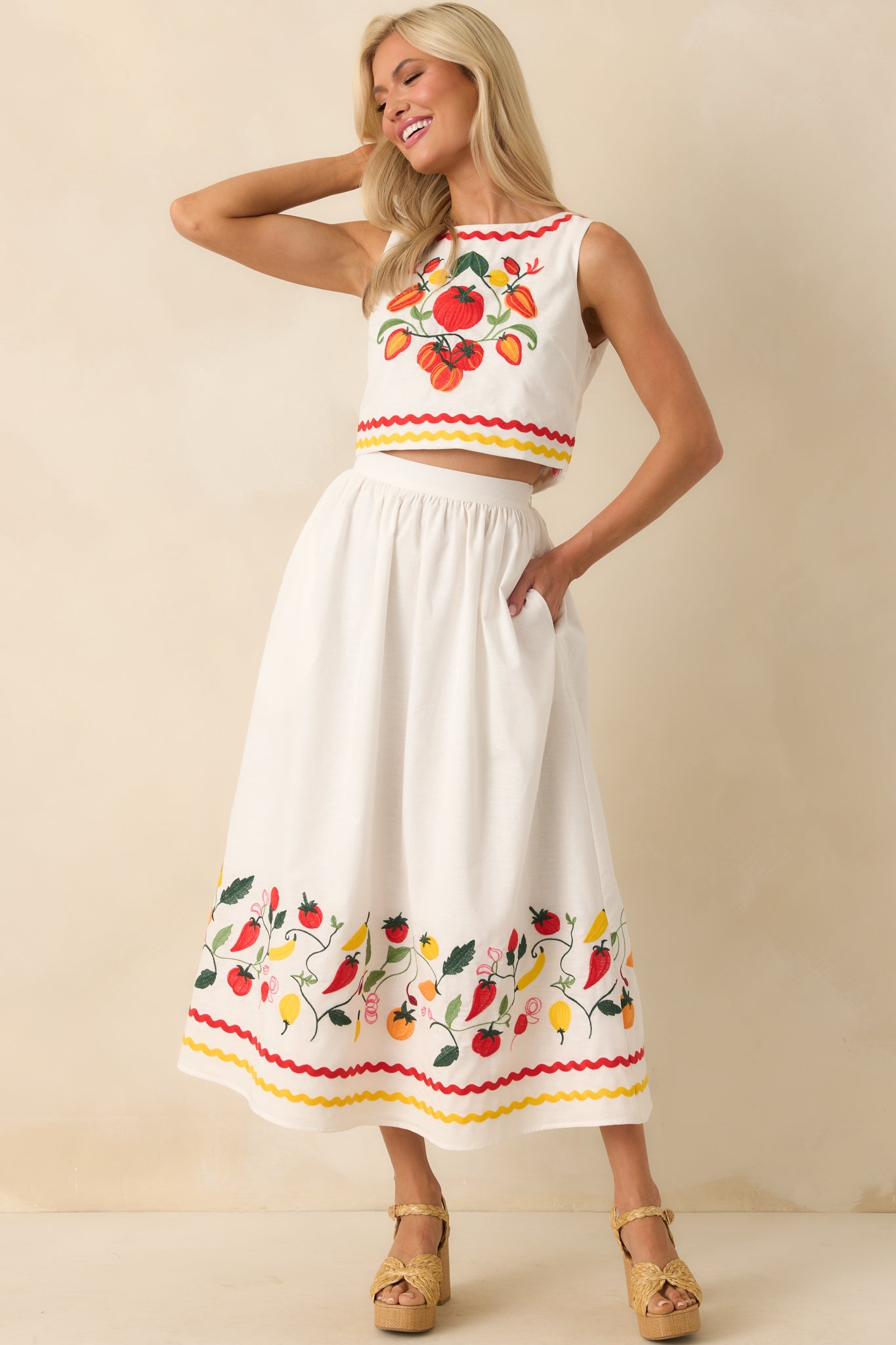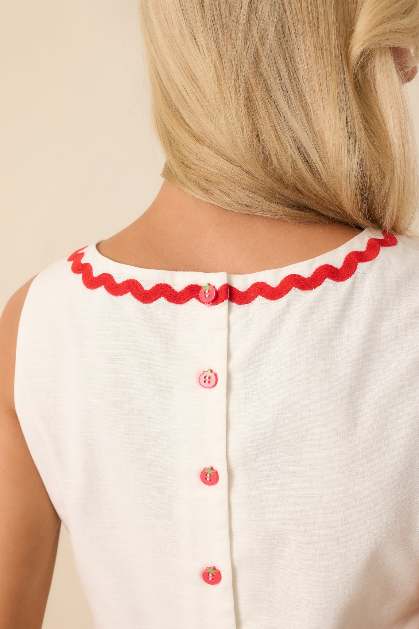 Prosperina Ellie Tomato Embroidered Ivory Cotton Top feels like a walk through a lively market—full of color, energy, and small, joyful discoveries. It’s made for days that invite a little extra spirit. This ivory top features a multicolor vegetable vine embroidery on the front, ric rac stripe detailing along the bottom hem, round neckline with red ric rac trim detail, sleeveless design, slightly cropped length, lightweight cotton-linen blend fabric, hidden side zipper, and functional tomato button back.