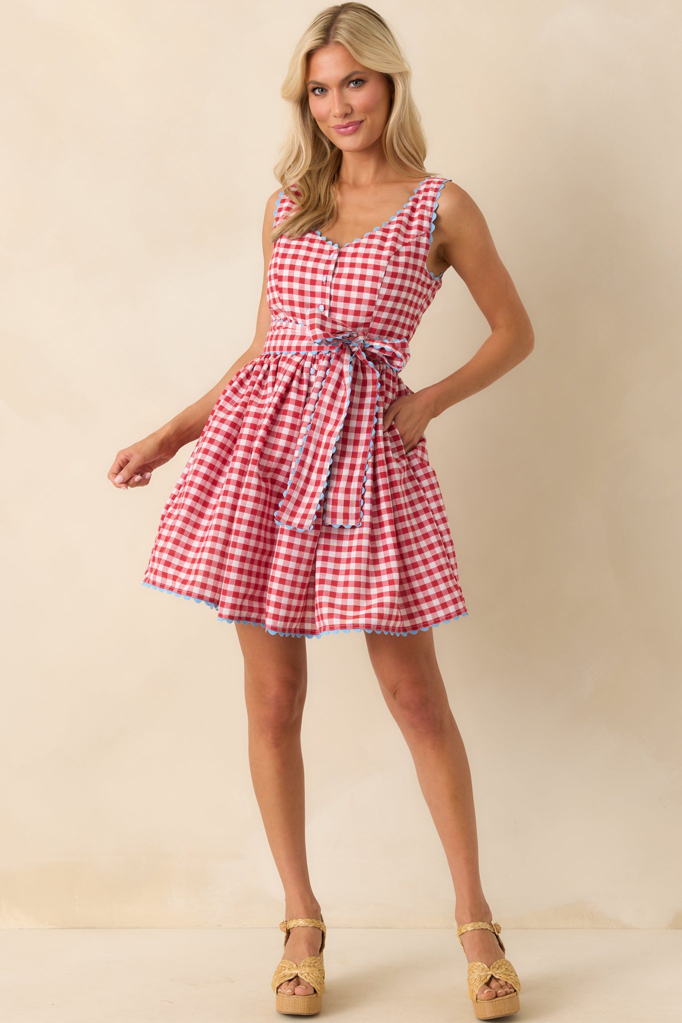 Prosperina Lottie Red Gingham Print Cotton Dirndl Mini Dress blends timeless charm with a refined touch. With its classic print and thoughtful details, it’s made for days when you want your style to feel both nostalgic and put-together. This red gingham mini dress features a v-neckline, functional button front, blue gingham button details, sleeveless design, fit & flare silhouette, blue scallop trim detailing throughout, optional self-tie belt, and functional pockets.