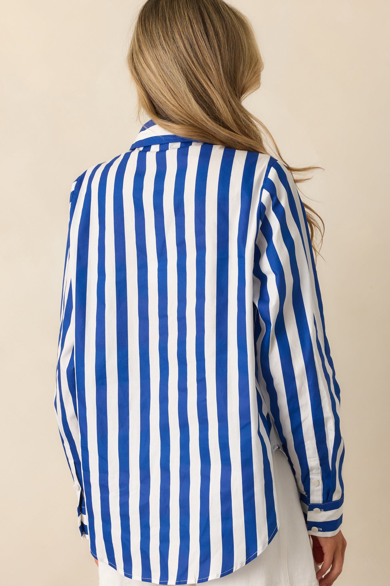 Experience the style and comfort of our Prosperina Paula Royal Blue Stripe Cotton Button Front Top. Made from soft and breathable cotton, this top is perfect for any occasion. The button front design adds a touch of sophistication, while the royal blue stripes add a pop of color to your wardrobe. Elevate your look with this must-have piece! This blue stripe top features a functional button front design, a collared neckline, a functional breast pocket, and long sleeves with functional pearlescent button cuffs.