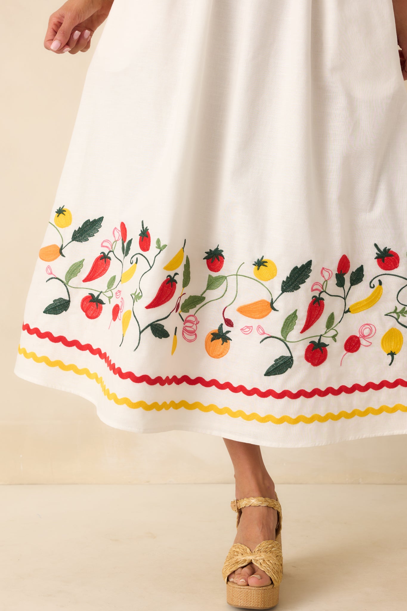 The Prosperina Virginia Tomato Embroidered Ivory Cotton Midi Skirt is a quiet nod to things that grow with care. Thoughtful and naturally charming, it’s made for days that feel unrushed. This ivory midi skirt features multicolor vegetable vine embroidery along the bottom, two ric rac stripes under embroidered section, lightweight cotton-linen blend fabric, elastic back waist insert, hidden side zipper, ivory lining, and functional pockets.
