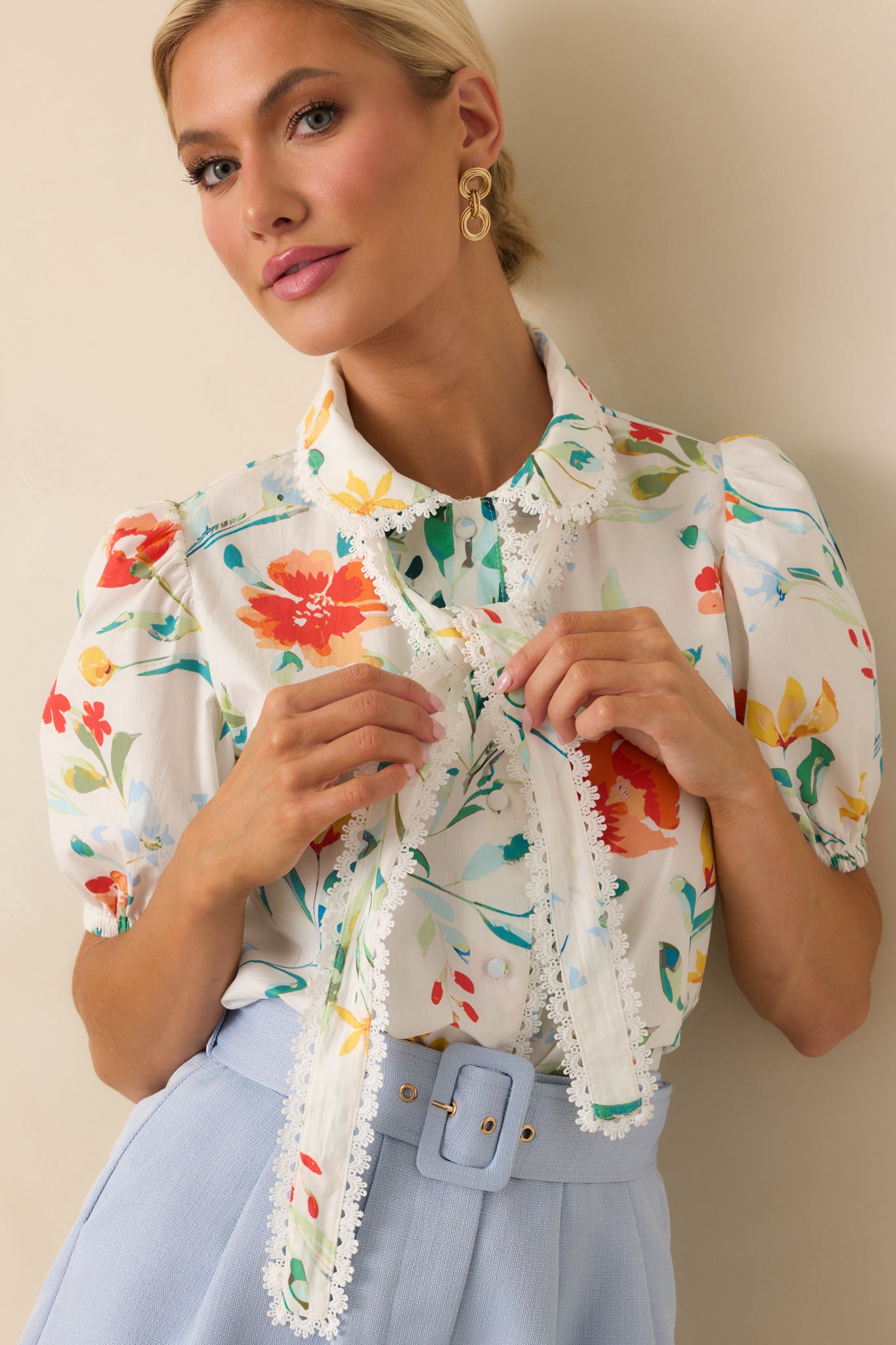 Prosperina Willow Multi Floral Print Cotton Top brings a hint of brightness to your day with easy charm and playful spirit. It’s the kind of piece that feels fresh, fun, and ready for whatever’s ahead. This ivory top features an exclusive Prosperina multicolor floral print, collared neckline, optional self-tie bow neck, lace scallop hem trim throughout, puff sleeves, elastic cuffs, and a functional button front.