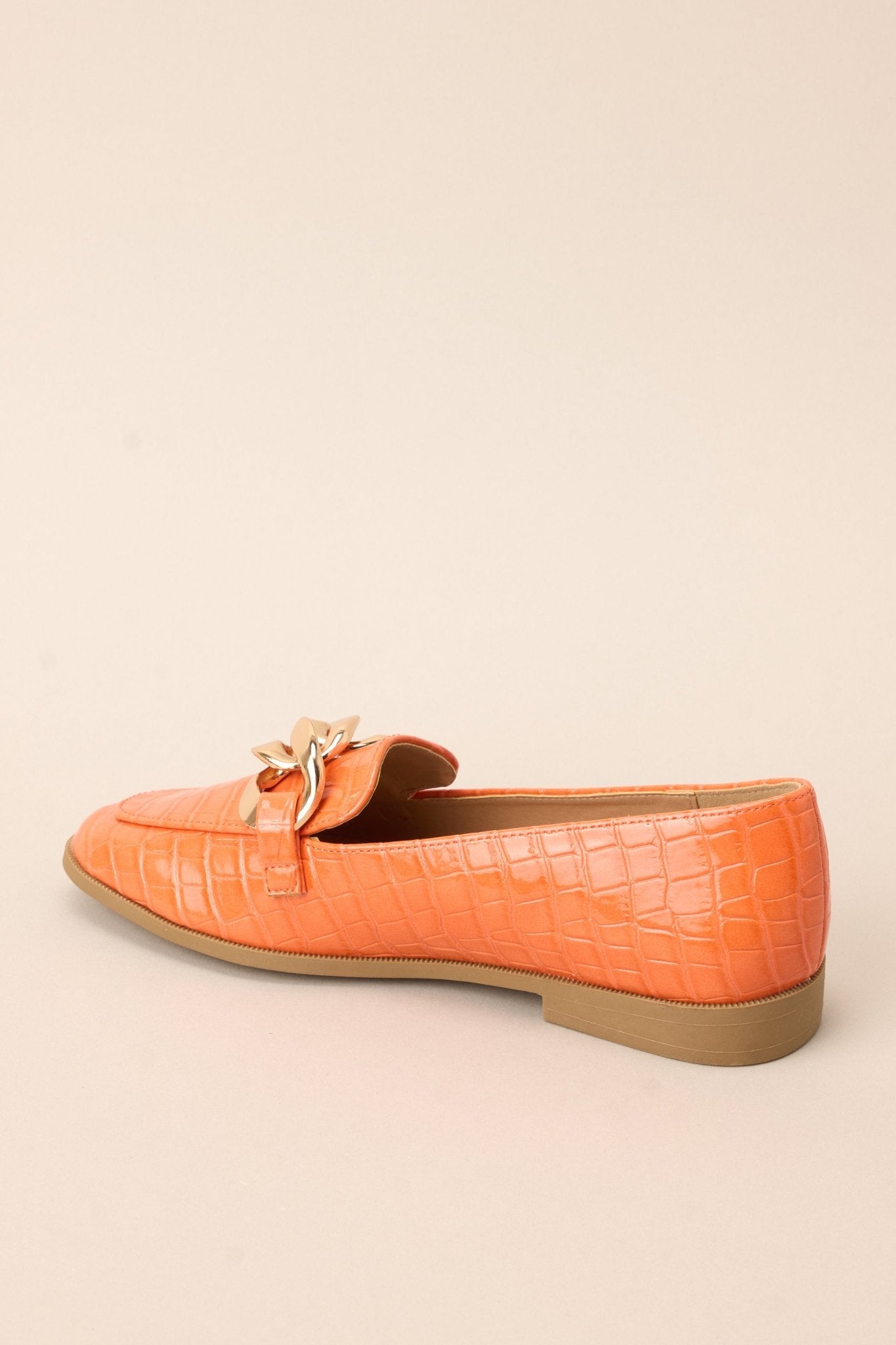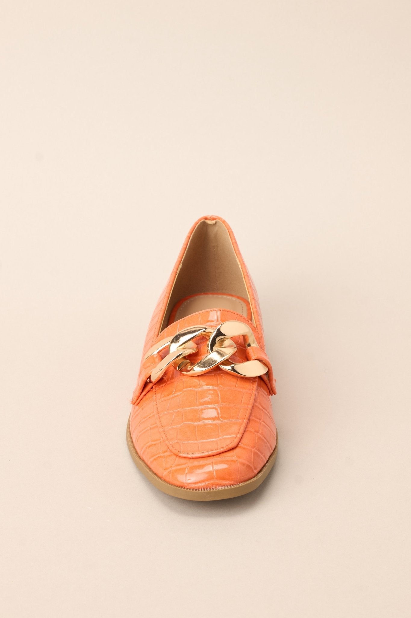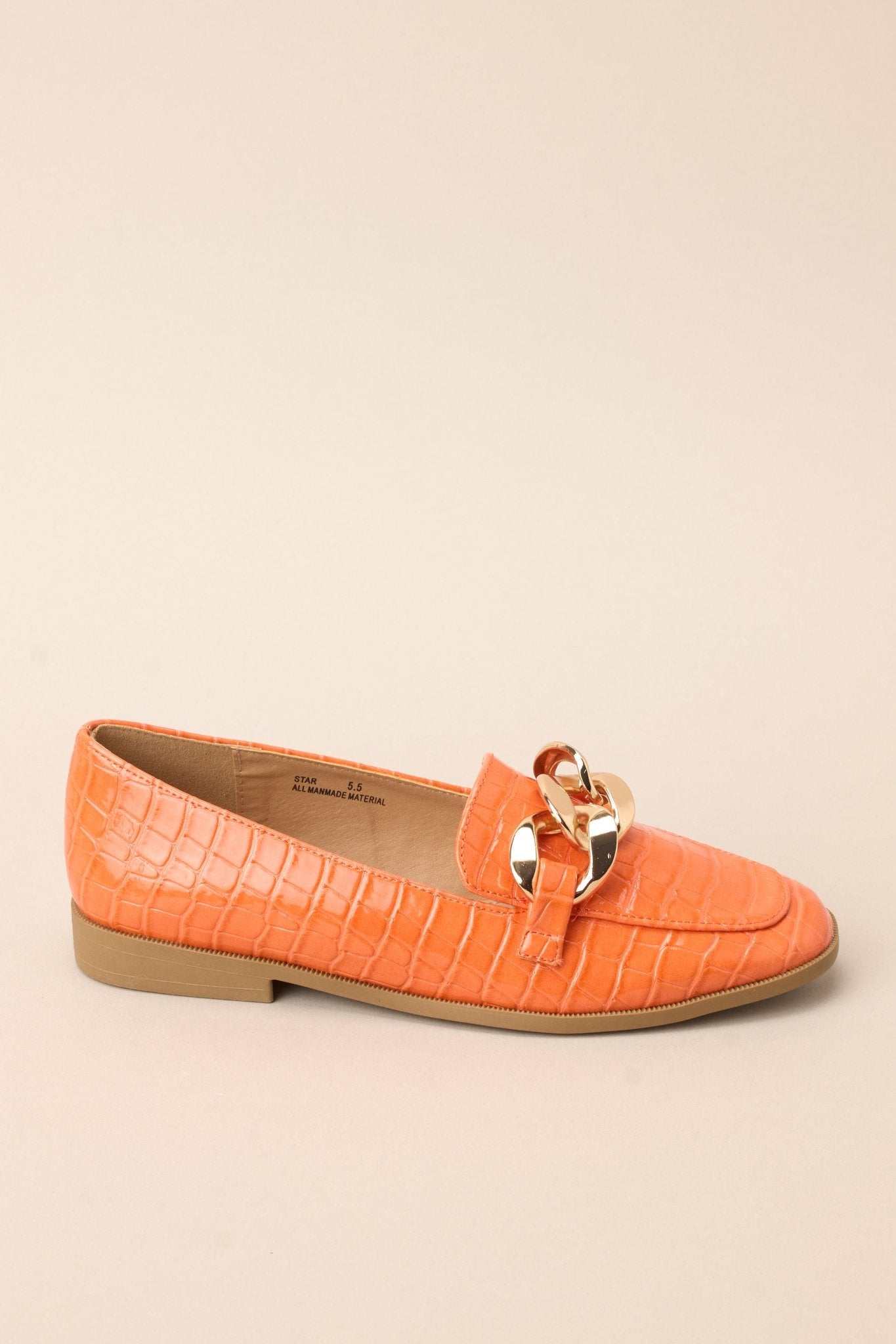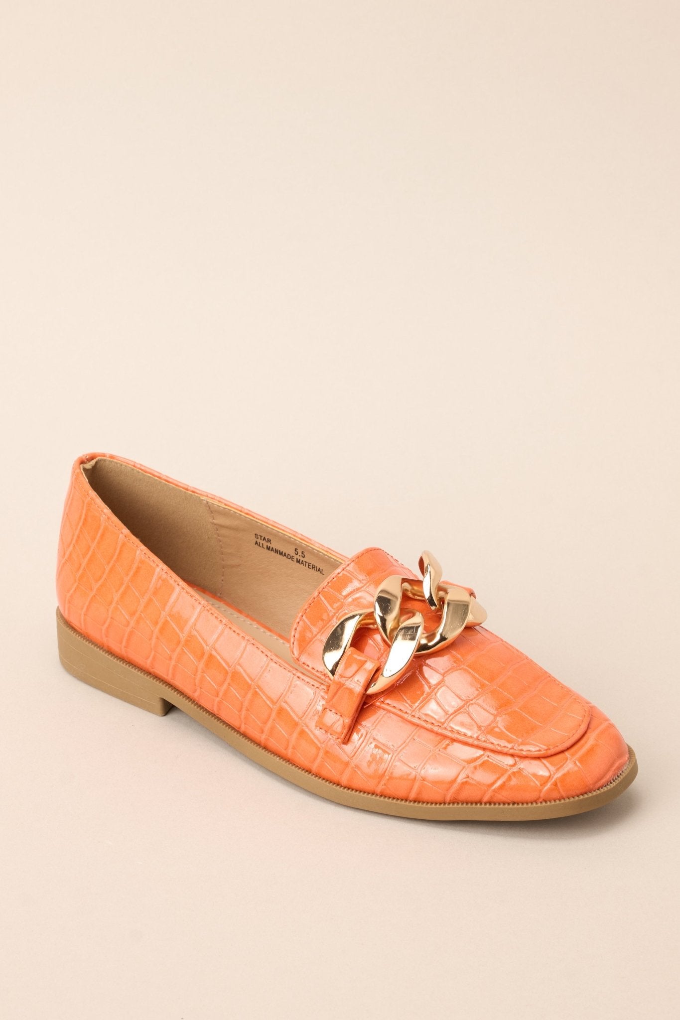 Get ready to Pin It and win it with these playful Put A Pin In It Orange Loafers! With a fun and quirky design, these loafers will add a fun pop of color to any outfit. Perfect for those who don't take themselves too seriously, these shoes will make a statement wherever you go. Put them on and stand out from the crowd! These loafers feature a rounded toe, a faux alligator finish, and large curb chain links across the top of the foot.
