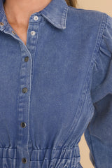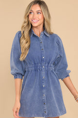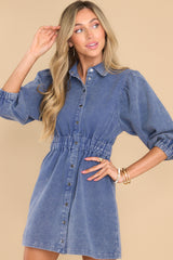 Step out in style with this ready-to-soar medium wash denim dress! A perfect balance between casual and dressy, this soft and flowy dress is ideal for any occasion. From a night out on the town to a day at the office, you'll be unstoppable in this stylish ensemble. This dress features a collared neckline, functional silver buttons down the front, elbow-length sleeves with elastic cuffs, and an elastic waistband. Model is wearing a size small. • 100% Cotton • Hand Wash Cold • Unlined • Imported
