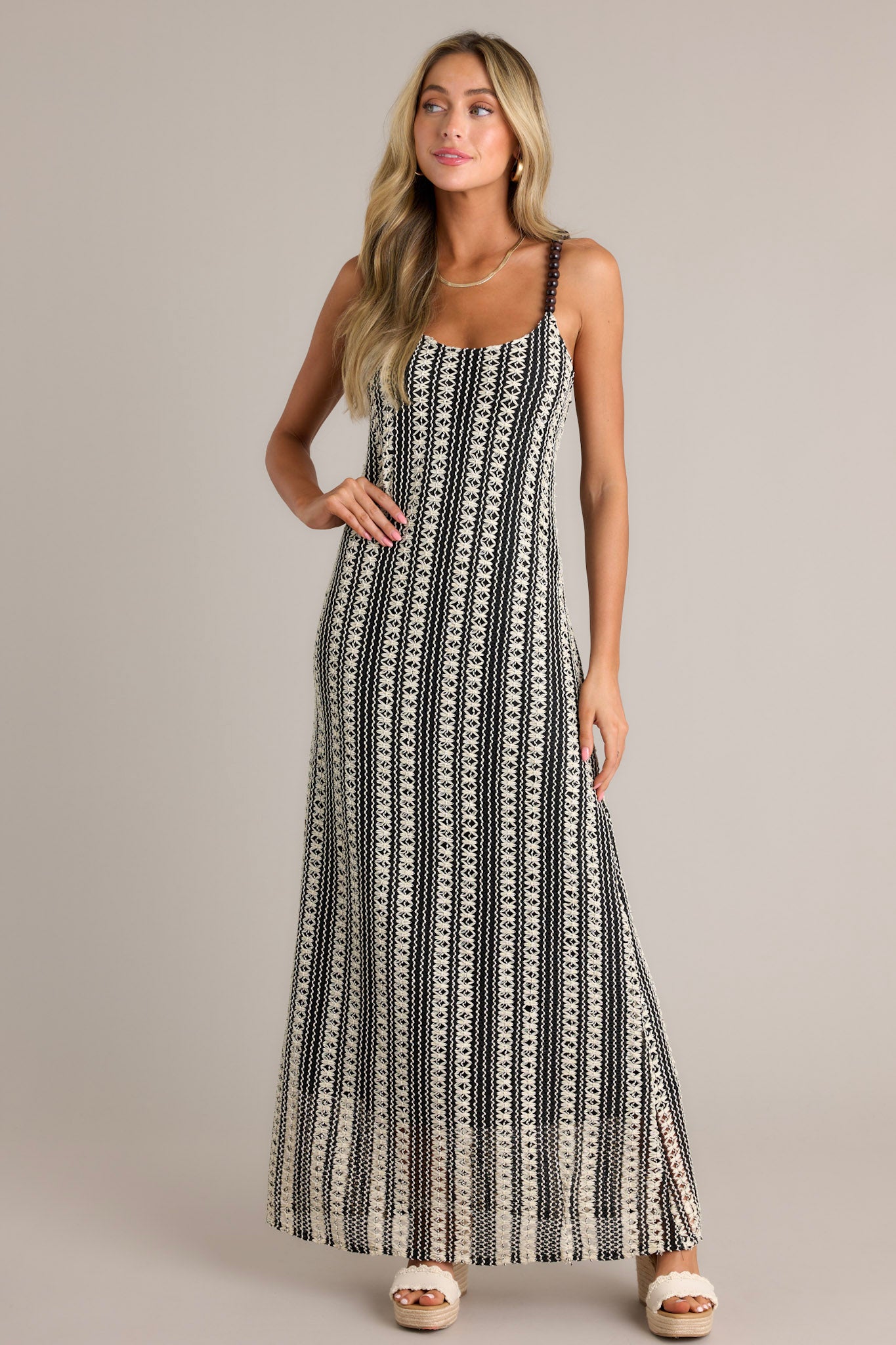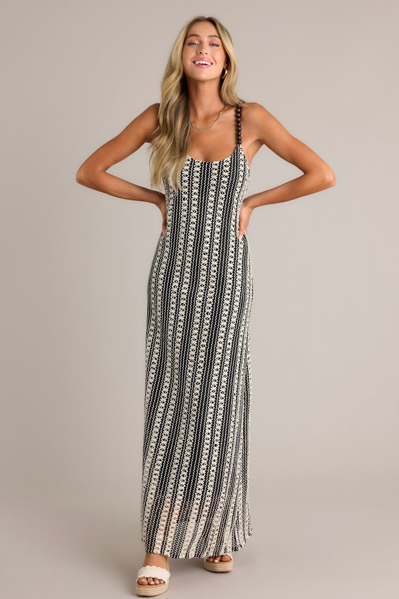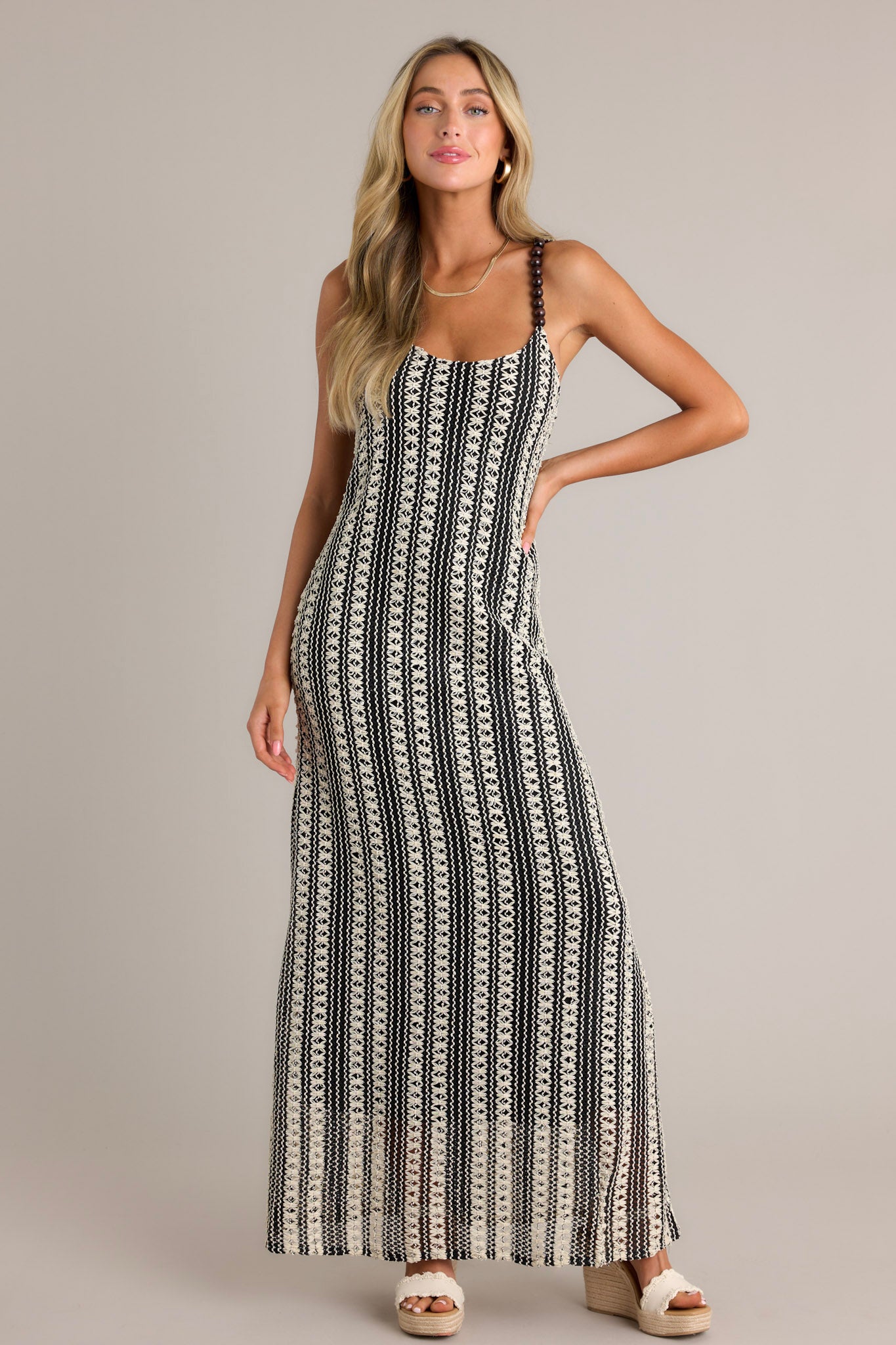 Take your style to new lengths with the Regal Rhapsody Black Stripe Knit Maxi Dress. This dress features a comfortable knit fabric and a flowy maxi length, making it perfect for any occasion. The stunning black color adds a touch of elegance, while the playful fit will keep you feeling free and fabulous. This black stripe maxi dress features a scoop neckline, fully beaded straps, a knitted design, and a vertical stripe pattern.