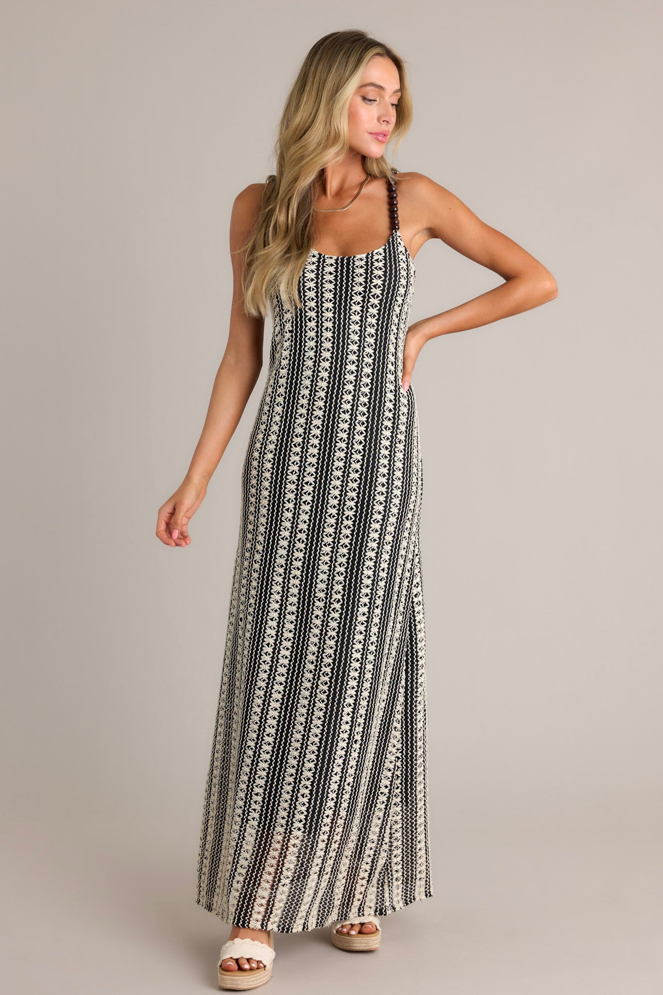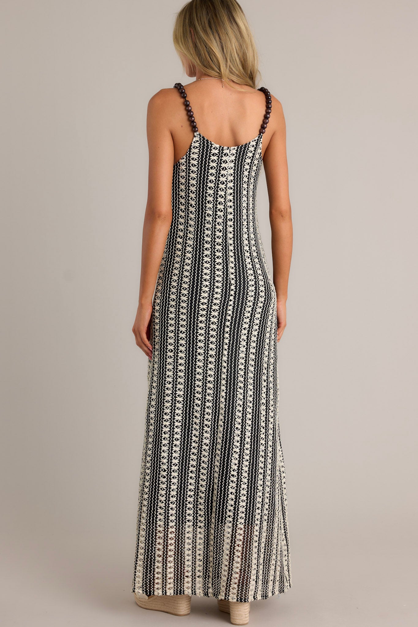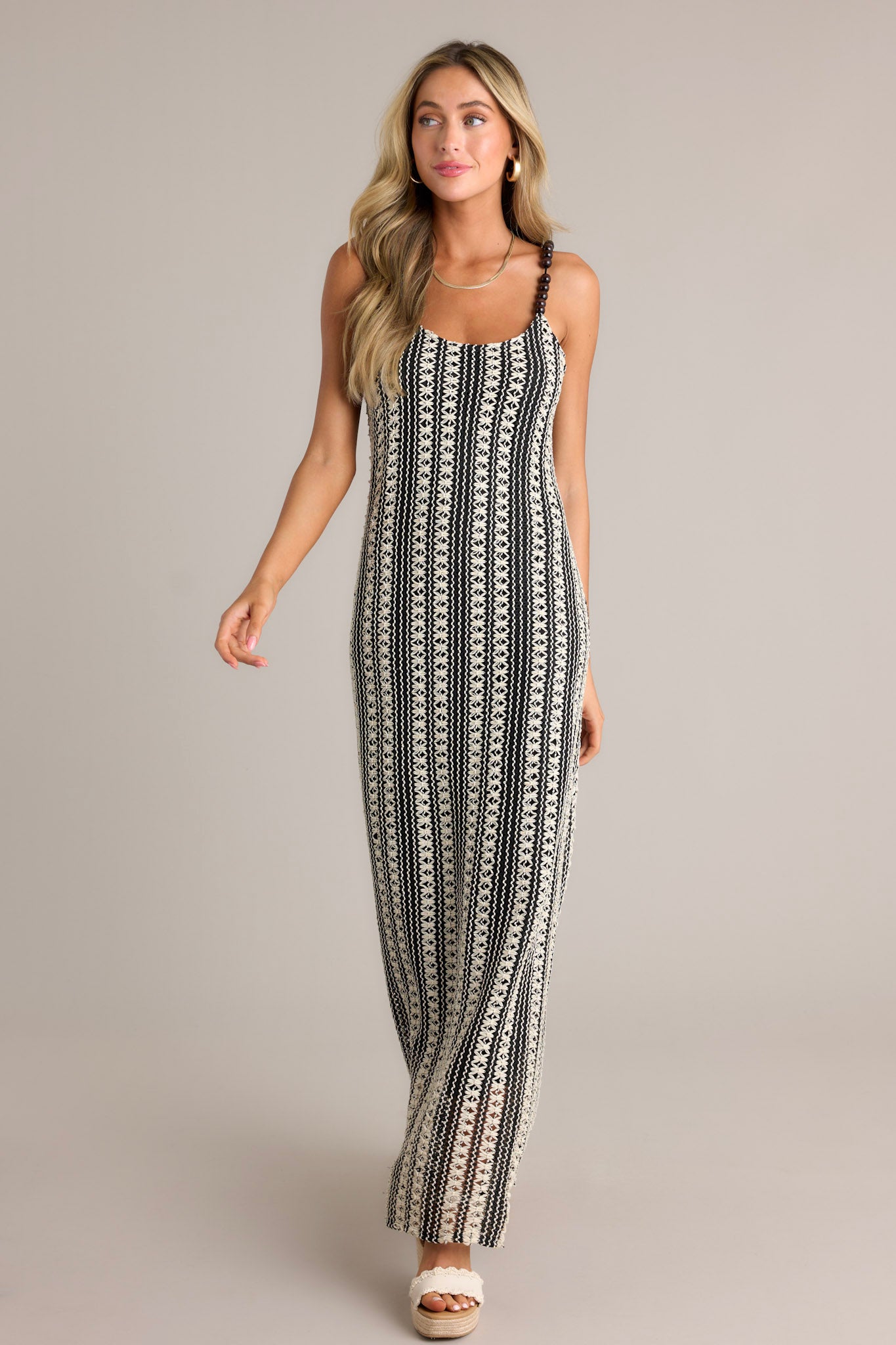Take your style to new lengths with the Regal Rhapsody Black Stripe Knit Maxi Dress. This dress features a comfortable knit fabric and a flowy maxi length, making it perfect for any occasion. The stunning black color adds a touch of elegance, while the playful fit will keep you feeling free and fabulous. This black stripe maxi dress features a scoop neckline, fully beaded straps, a knitted design, and a vertical stripe pattern.
