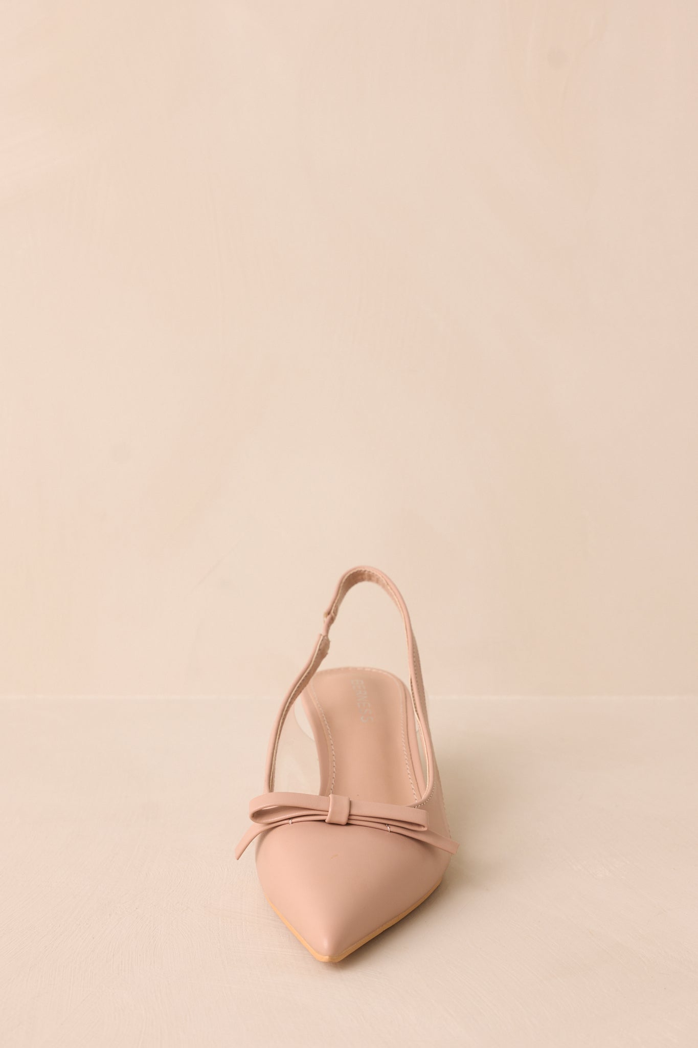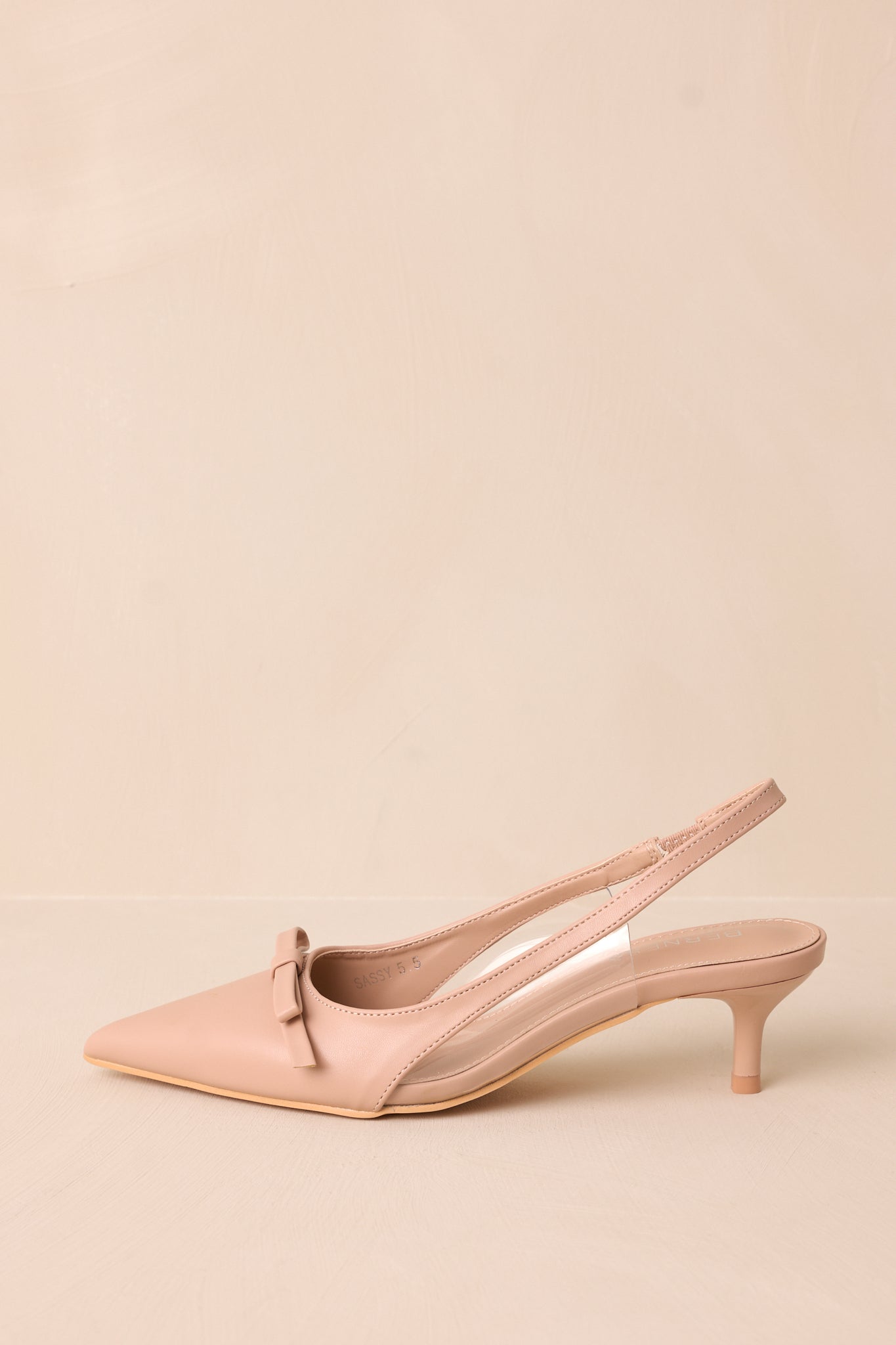Step into style with Regal Steps Beige Slingback Kitten Heels. These elegant heels provide a comfortable and stylish lift to any outfit. Perfect for a night out or a day at the office, these heels will elevate your look with a touch of sophistication. Feel confident and chic with Regal Steps! These beige kitten heels feature a pointed closed toe, delicate bow detailing, a strap around the back the foot, clear siding for extra support, and an extremely short heel.