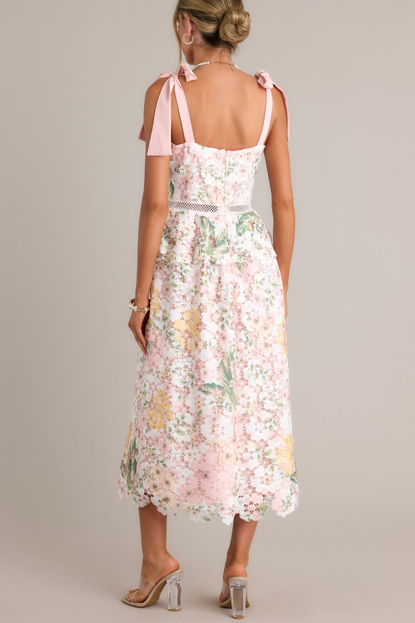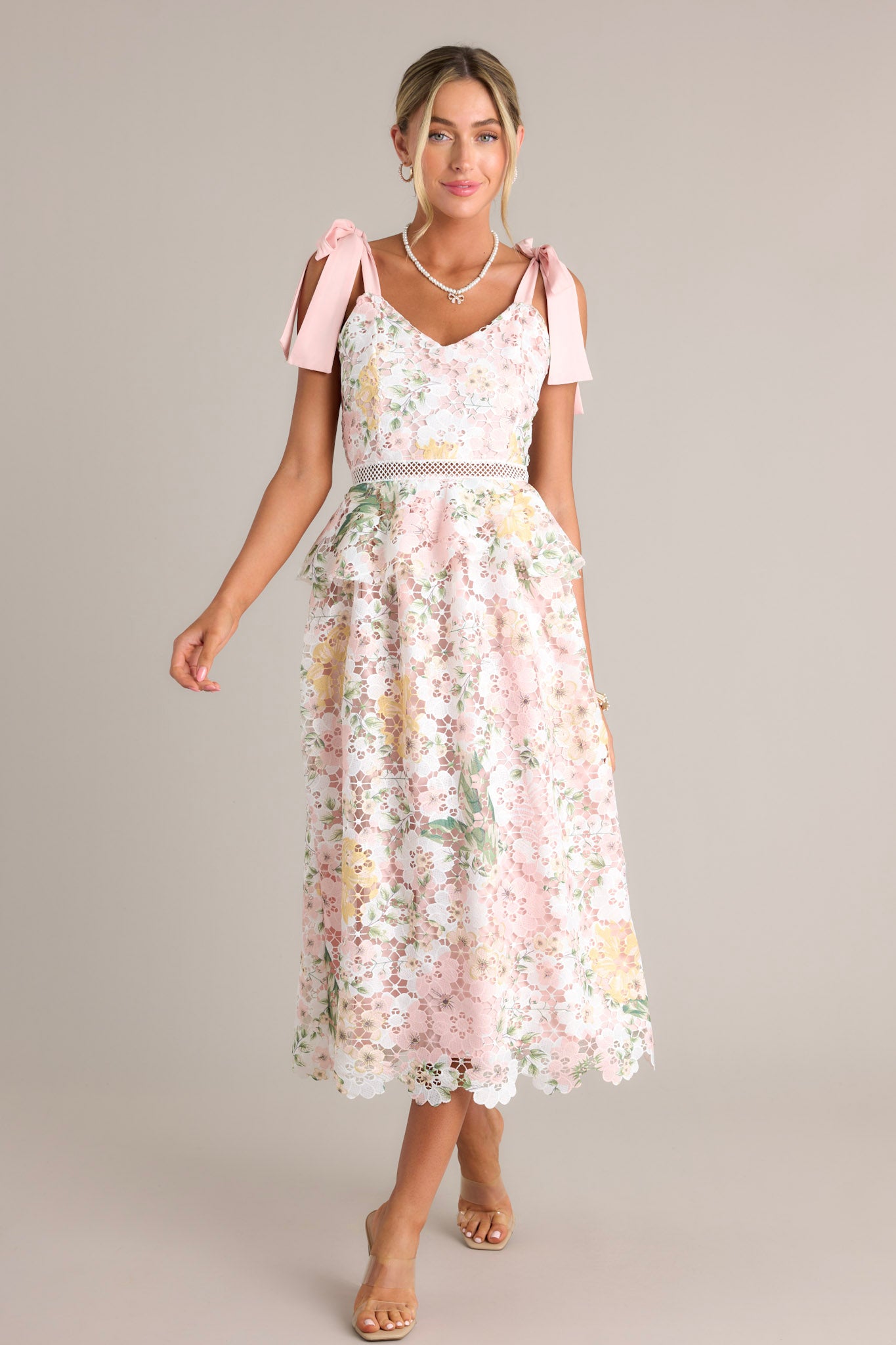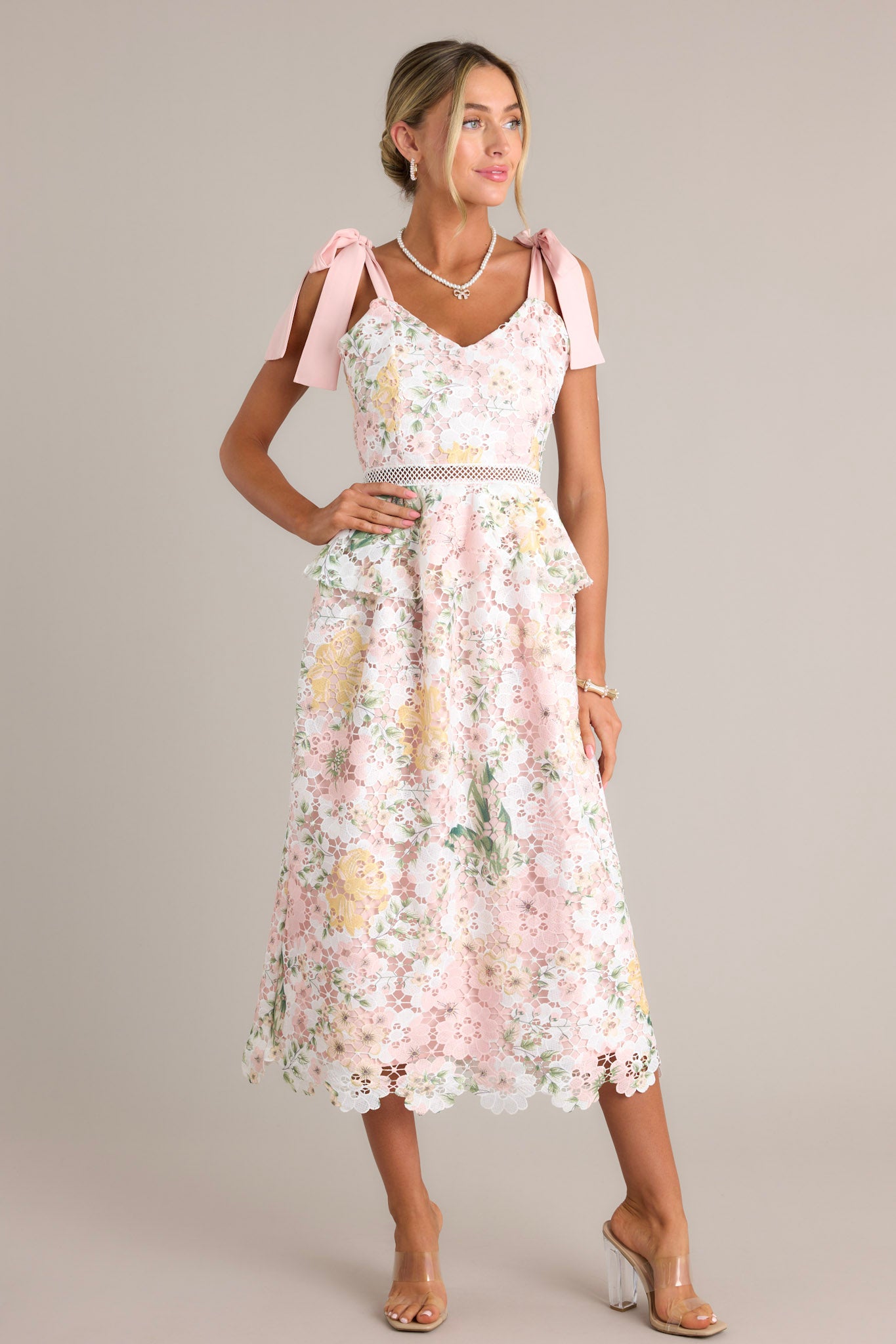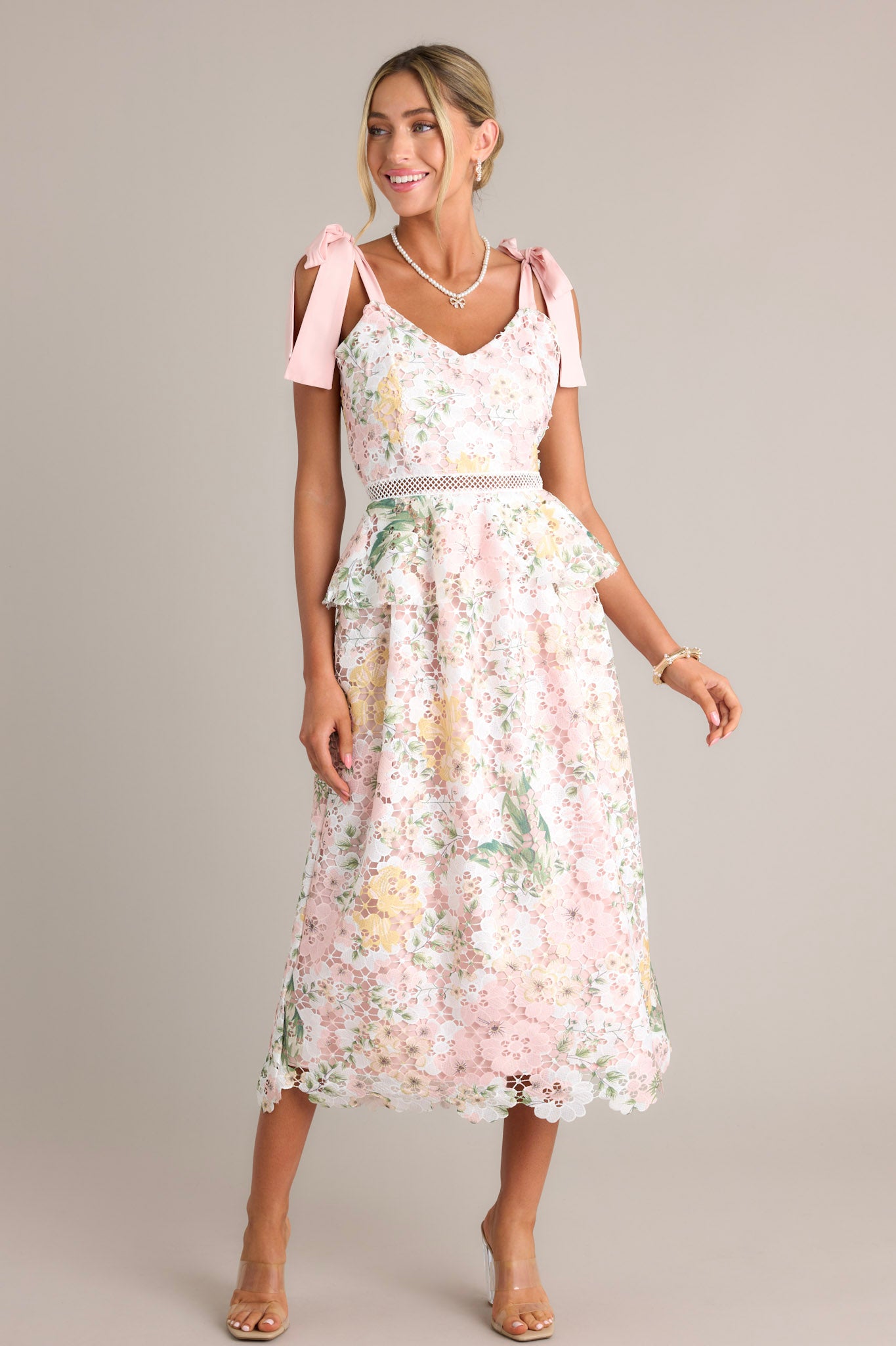 Get ready to bloom with this Peach Lace Floral Midi Dress. Perfect for spring (and memories of it), this dress features delicate lace and a romantic floral print. This dress features a v-neckline, self-tie straps, a zipper down the back, ruffle detailing at the waist, and a knitted lace overlay. Perfect for any occasion, from picnics to weddings, this dress will have you feeling like a breath of fresh air.