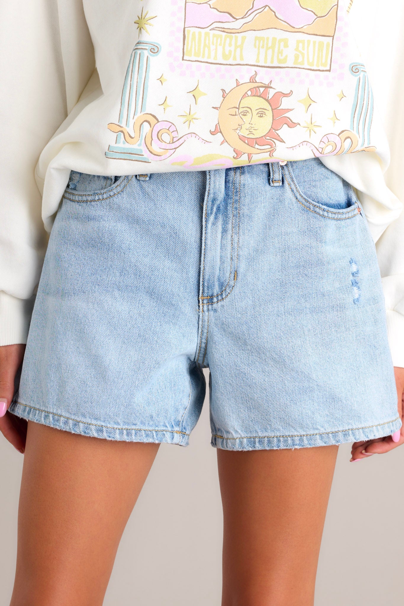 Add some retro flare to your wardrobe with our high rise denim shorts. The light wash brings a vintage touch to any outfit. Perfect for casual summer days or dressing up for a night out! These light wash denim shorts feature a high waist, classic button-zipper closure, functional belt loops, and five pockets.