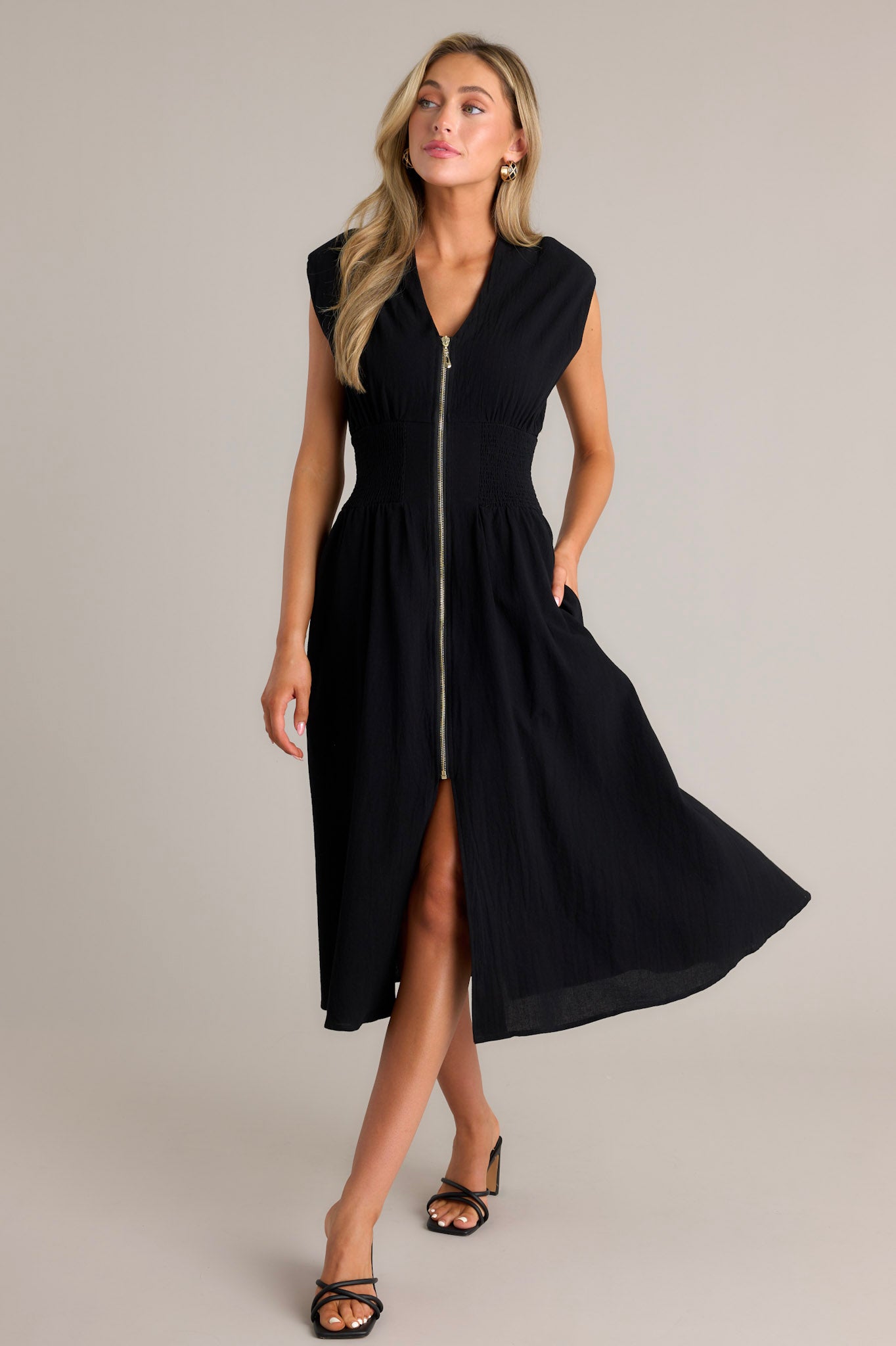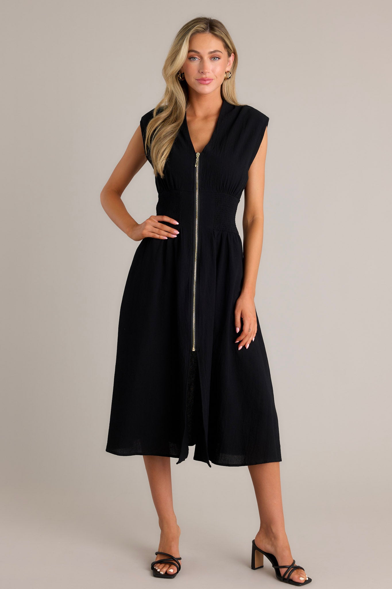 Get ready to turn heads with our Return Someday Black Midi Dress! The sleek midi length and timeless black color make this dress a versatile and chic addition to any wardrobe. Plus, the flattering fit and comfortable fabric will have you reaching for it again and again. A must-have for any fashion-forward individual! This black midi dress features a deep v-neckline, shoulder padding, a functional zipper front, a fully smocked waist, functional pockets, and a front slit.