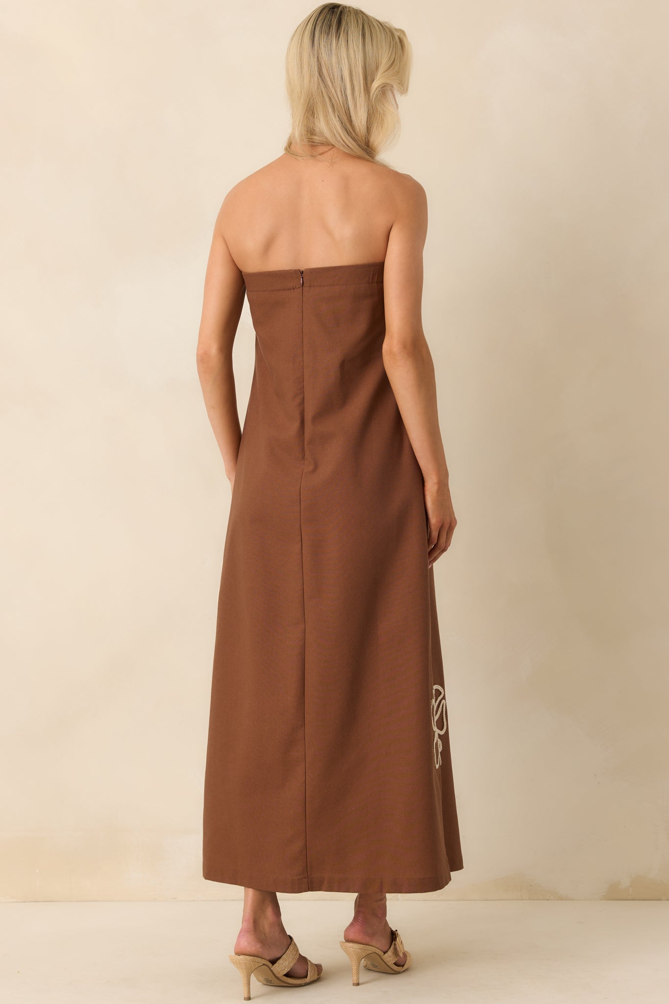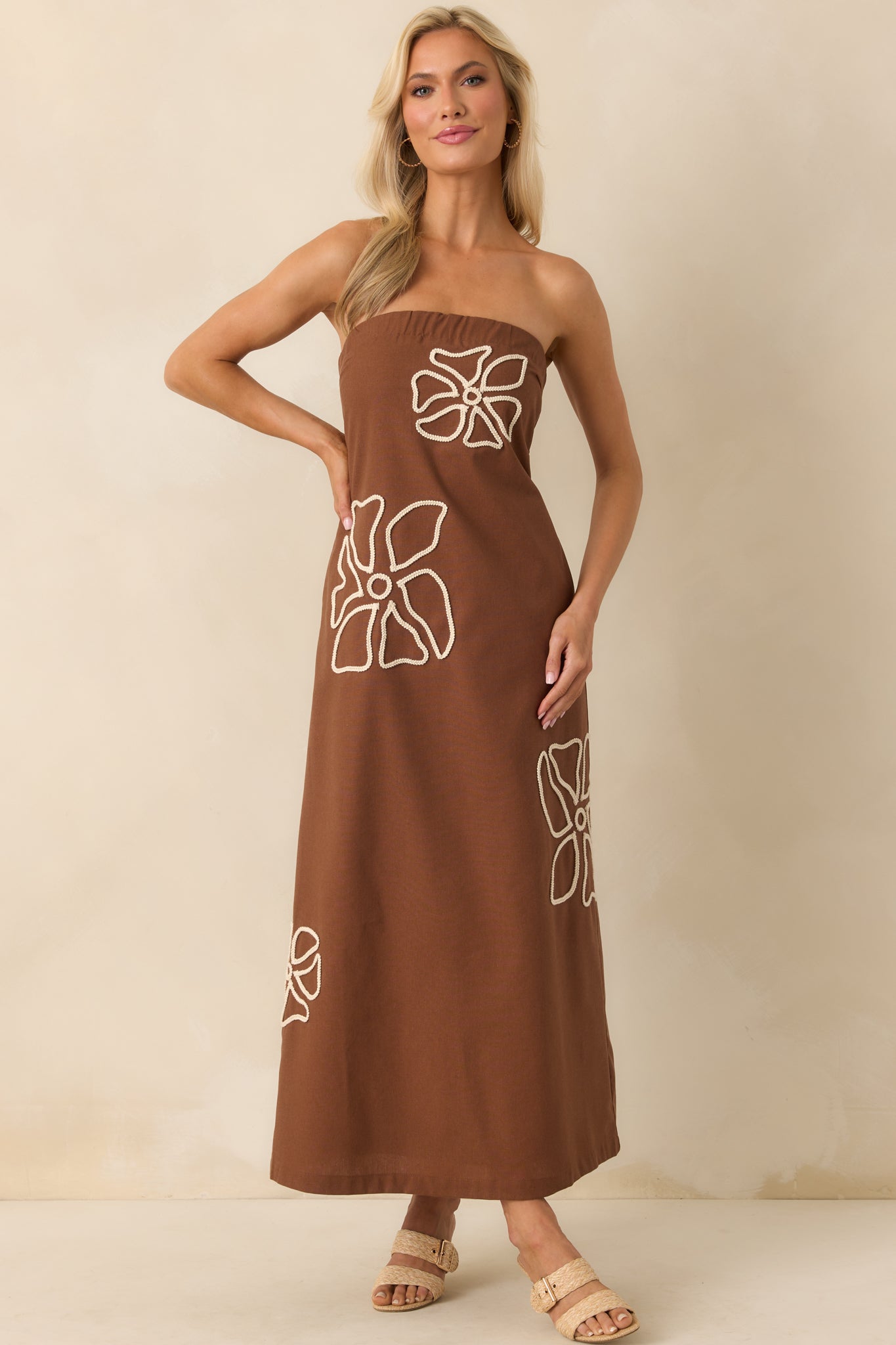 Right Where I Am Brown Floral Embroidered Strapless Midi Dress