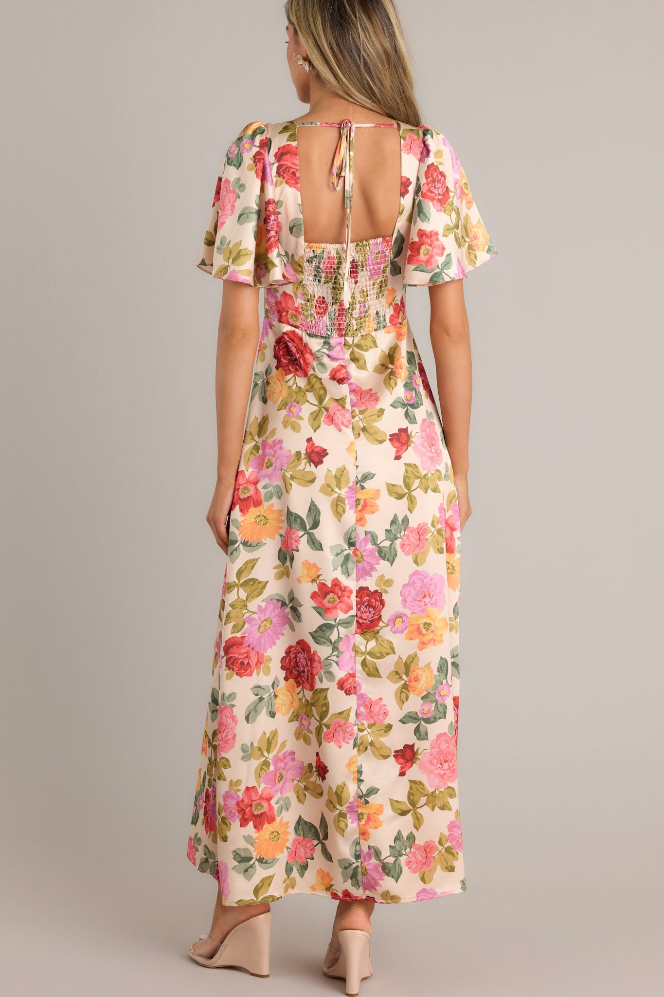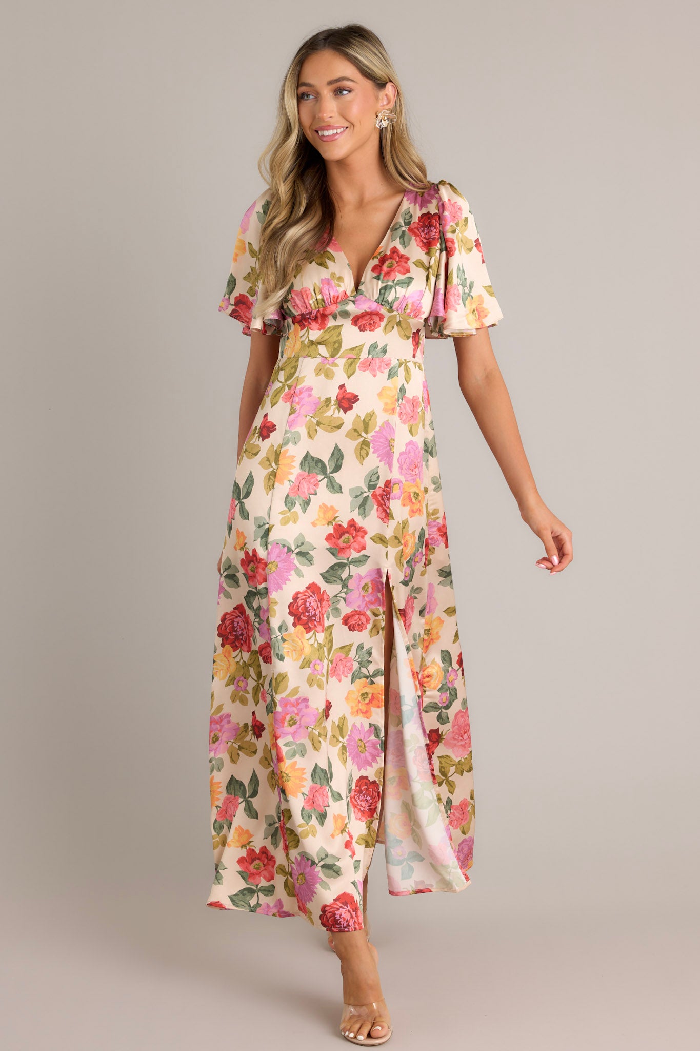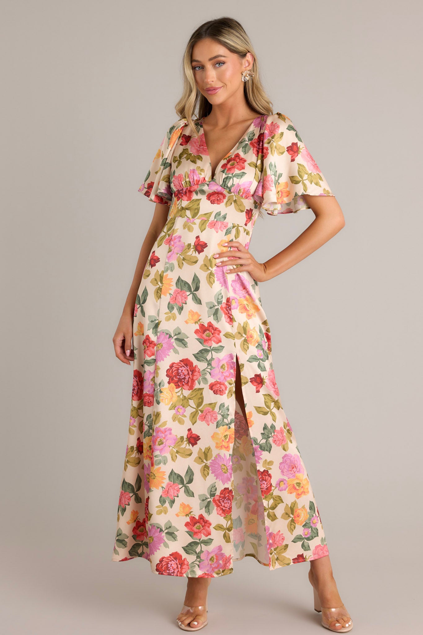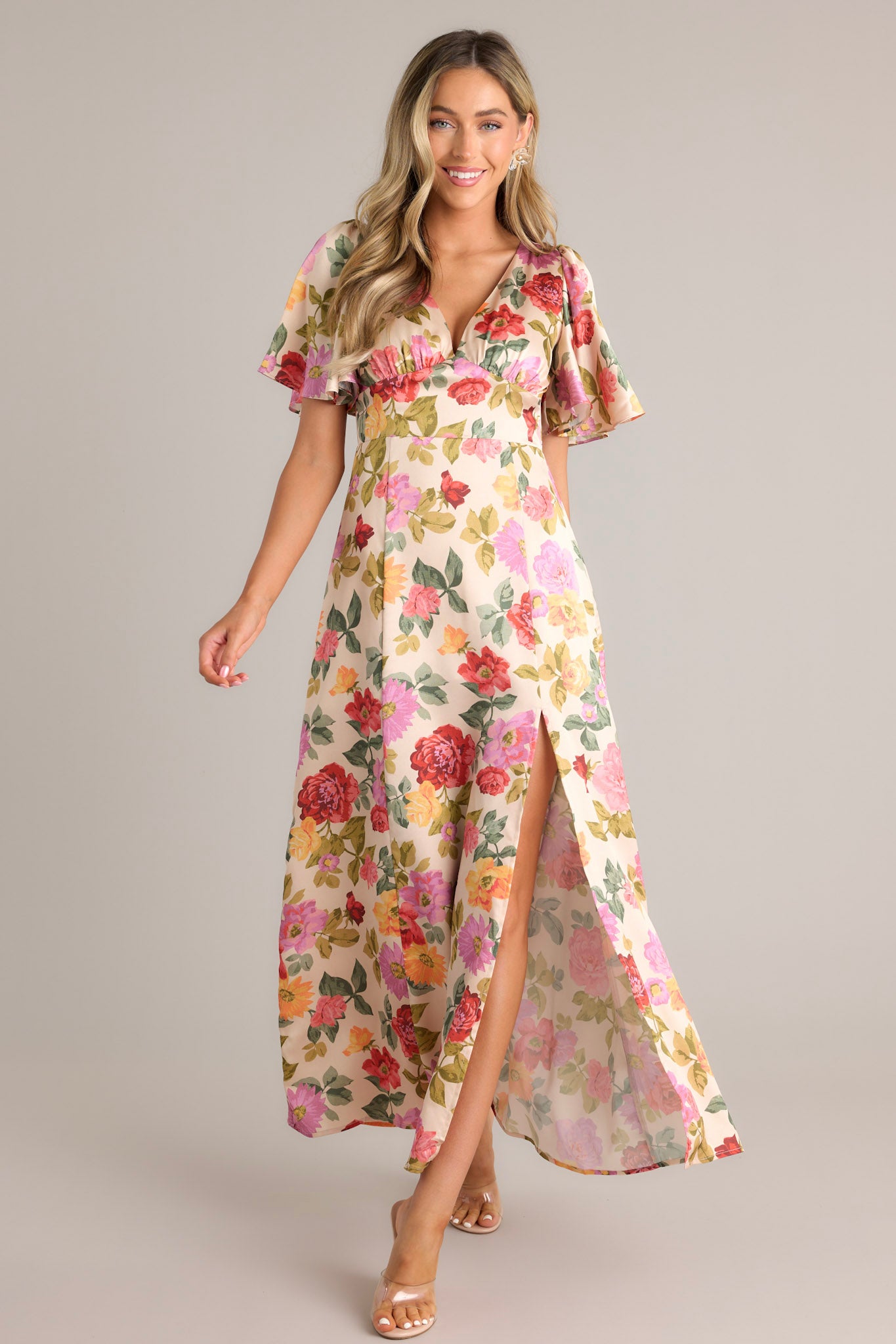 Indulge in the whimsy of the Rosewood Romance Beige Multi Floral Flutter Sleeve Maxi Dress. With its delicate design this dress will have you looking and feeling like a ethereal goddess. Make heads turn and hearts flutter. This beige multi floral maxi dress features a deep V-neckline, flutter sleeves, a warm floral print throughout, a fitted waist and a-line skirt, and a subtle front slit.