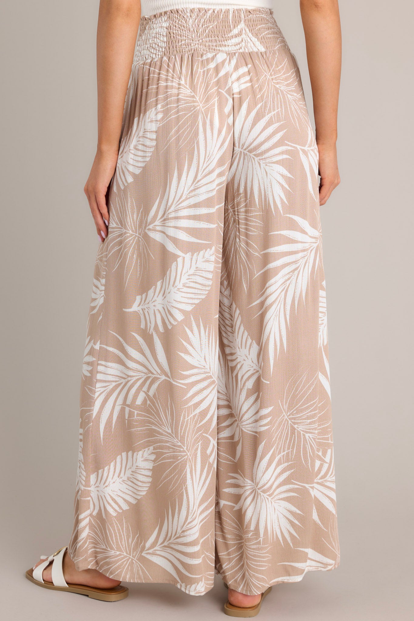 Embrace the island vibes with our Sandy Palms Tan Tropical Print Pants. These lightweight, breezy pants feature a playful palm print that will transport you to a tropical paradise. Perfect for lounging or a day at the beach, these pants will become your go-to for effortless style and comfort. These tan pants feature a high waist, a fully smocked waistband, functional pockets, and a wide flowy leg.