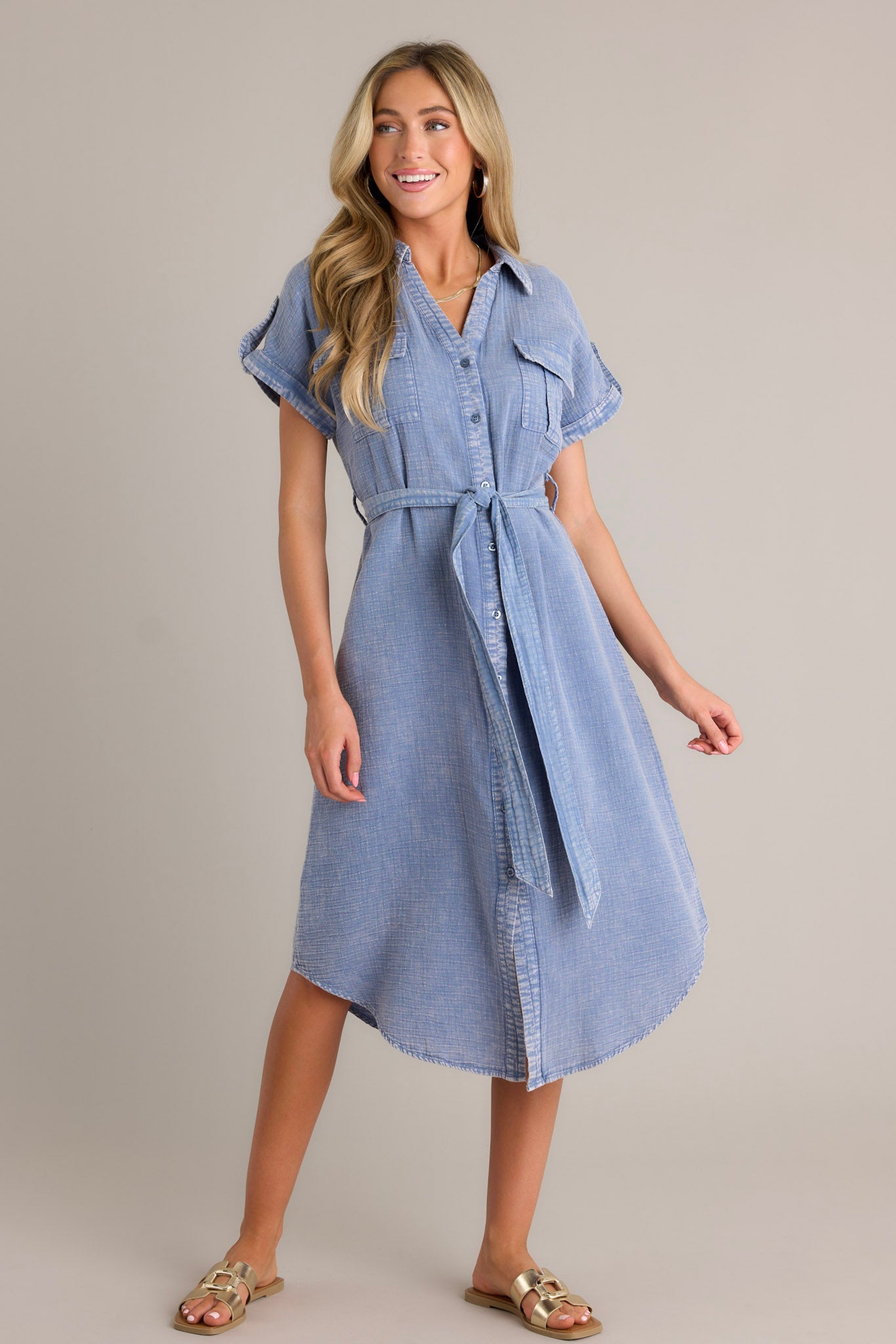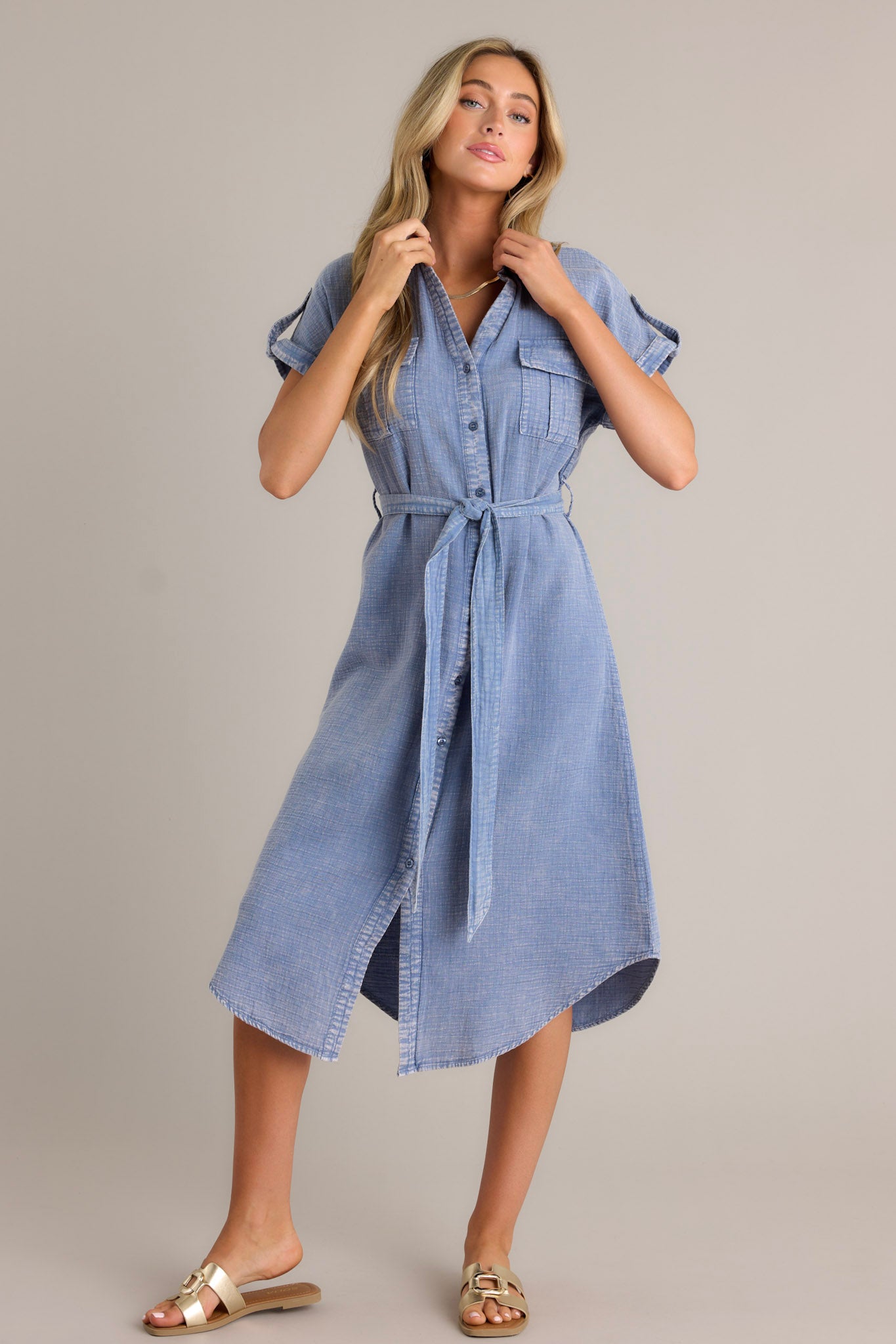 Ride the wave of style with our Sea Spray 100% Cotton Blue Washed Maxi Dress! This playful dress features a breezy cotton fabric, perfect for summer days and beach vacations. The blue washed color adds a touch of whimsy to any outfit. Get ready to make a splash in this trendy and comfortable dress! This blue maxi dress features a collared v-neckline, a functional button front, functional breast pockets, a self-tie waist belt, belt loops, and cuffed short sleeves.