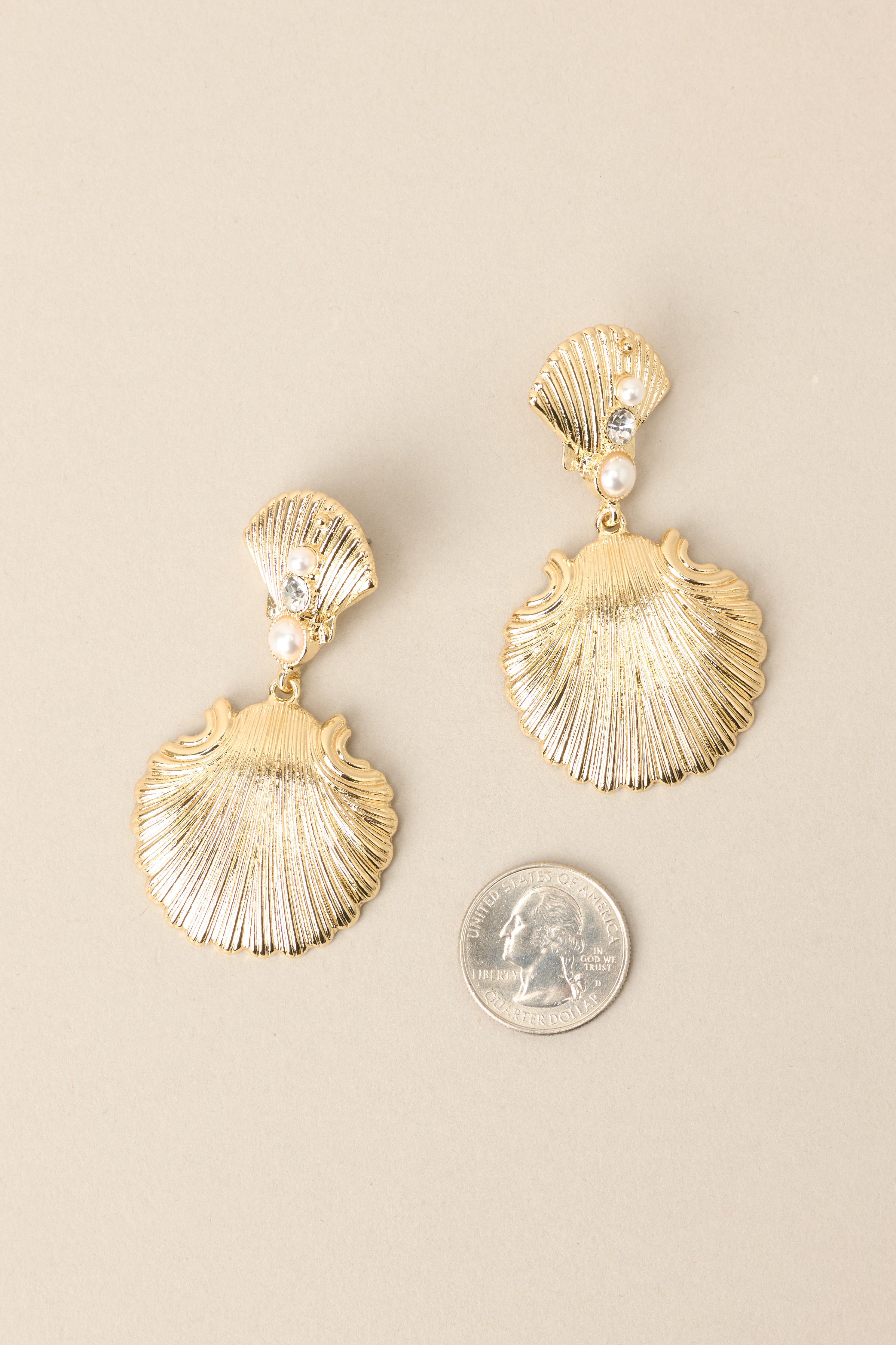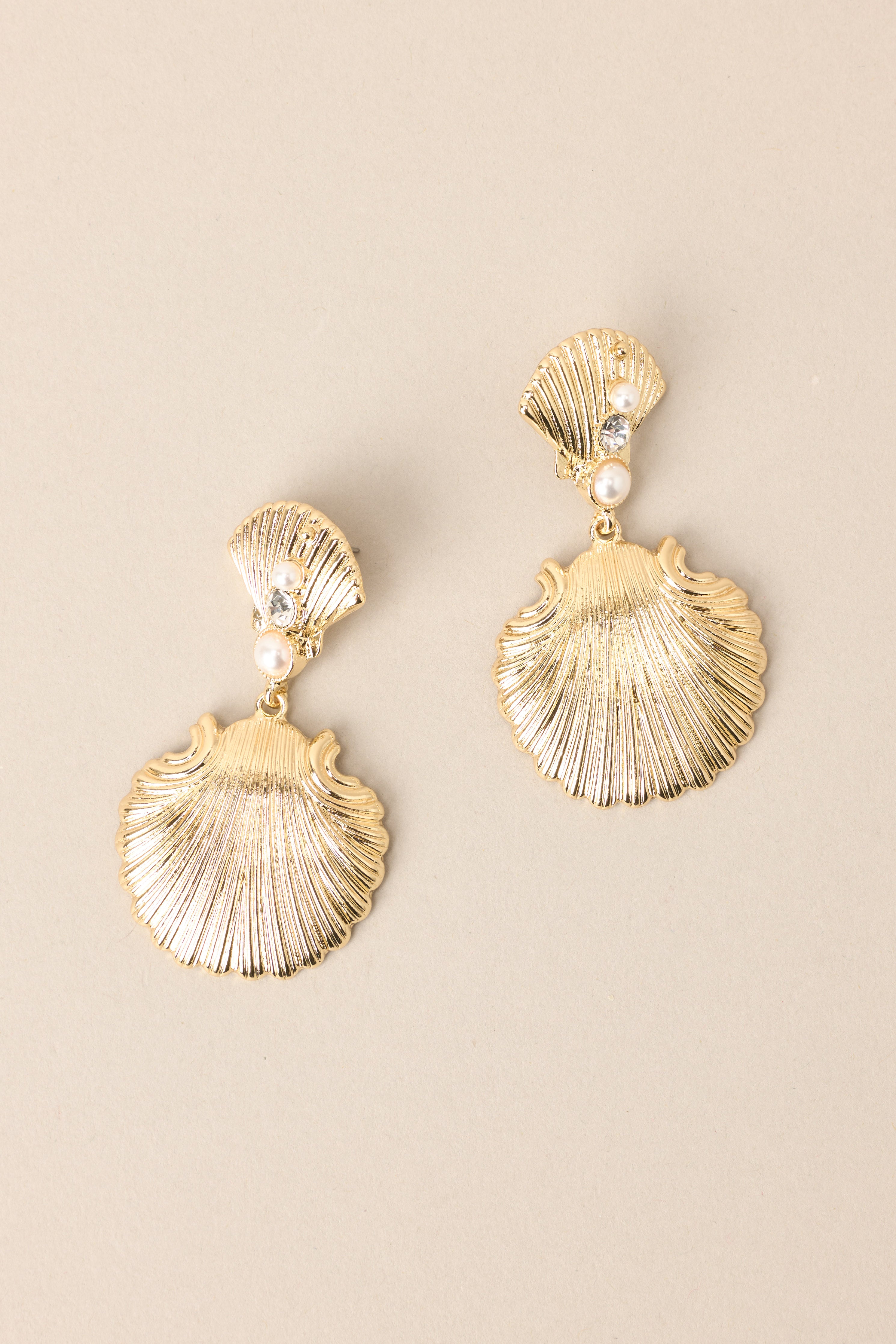 Upgrade your summer style with our Seaside Chic Gold Earrings! These unique earrings will add a touch of effortless elegance to any outfit. Perfect for a day of sight seeing, these earrings are a must-have for any fashion-forward individual. So go ahead, make a splash with our Seaside Chic Gold Earrings! These earrings feature gold hardware, a shell shaped stud embellished with faux pearls and rhinestones, a larger shell shaped dangle, and secure post backings.